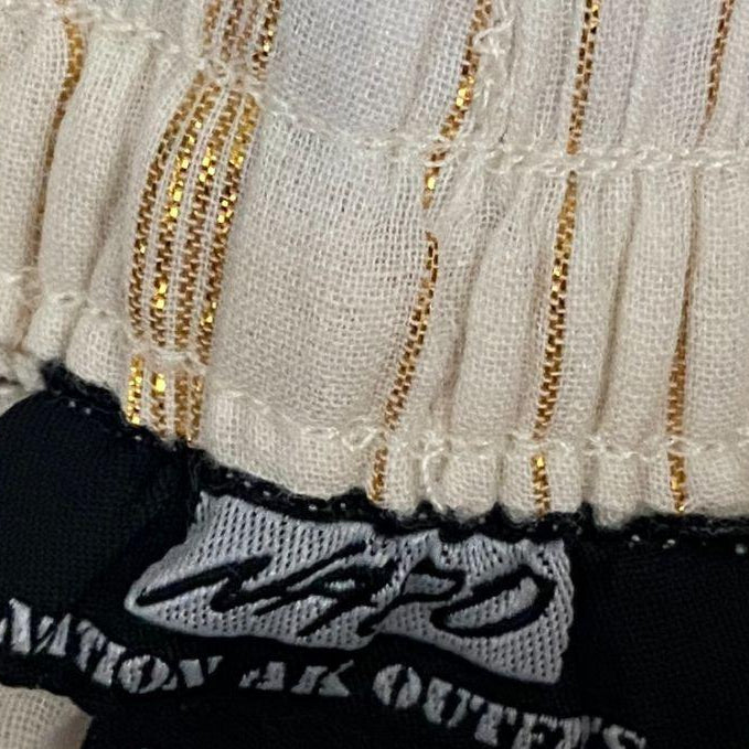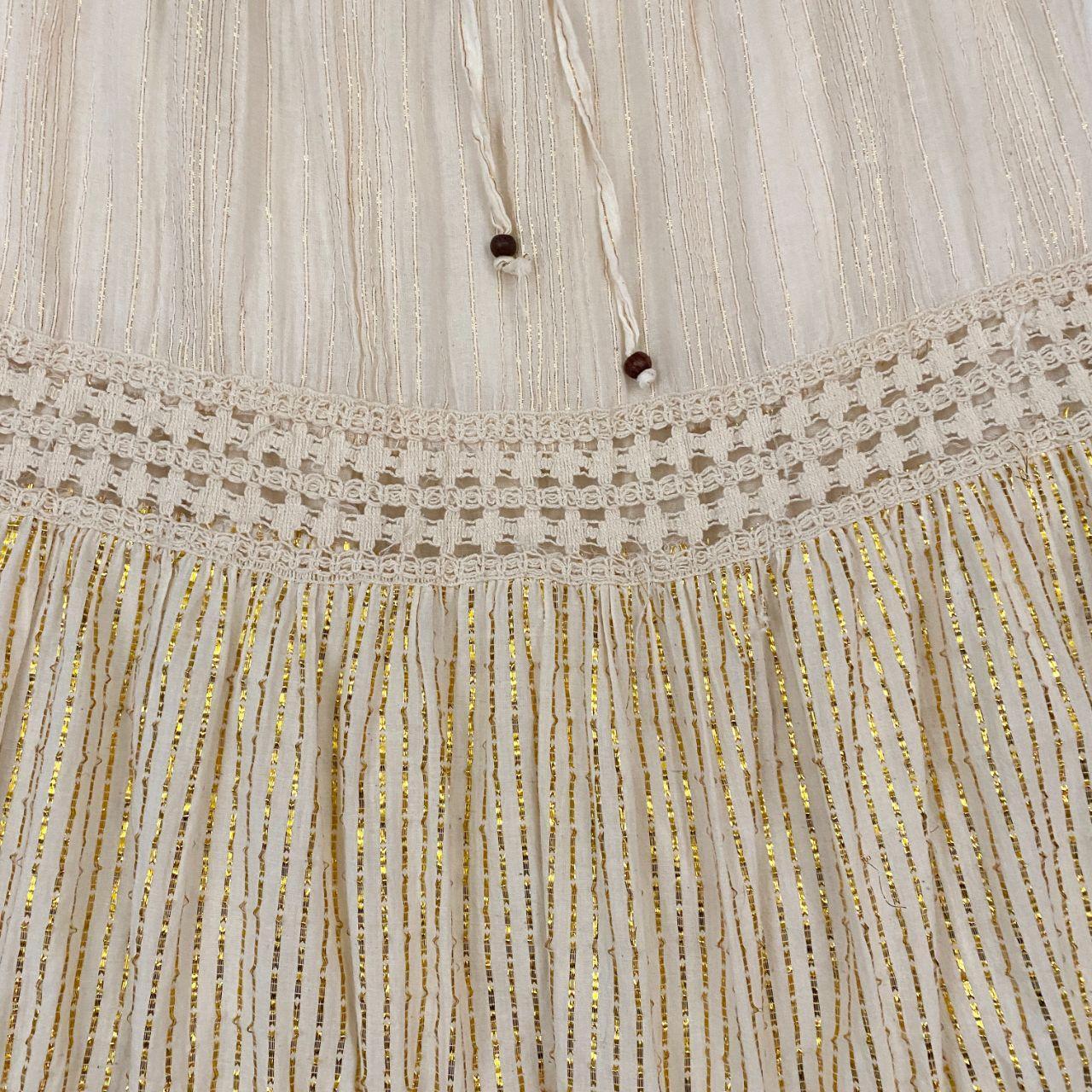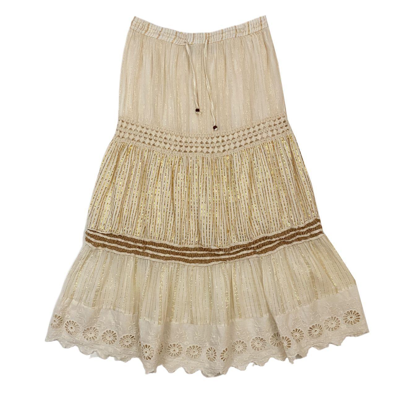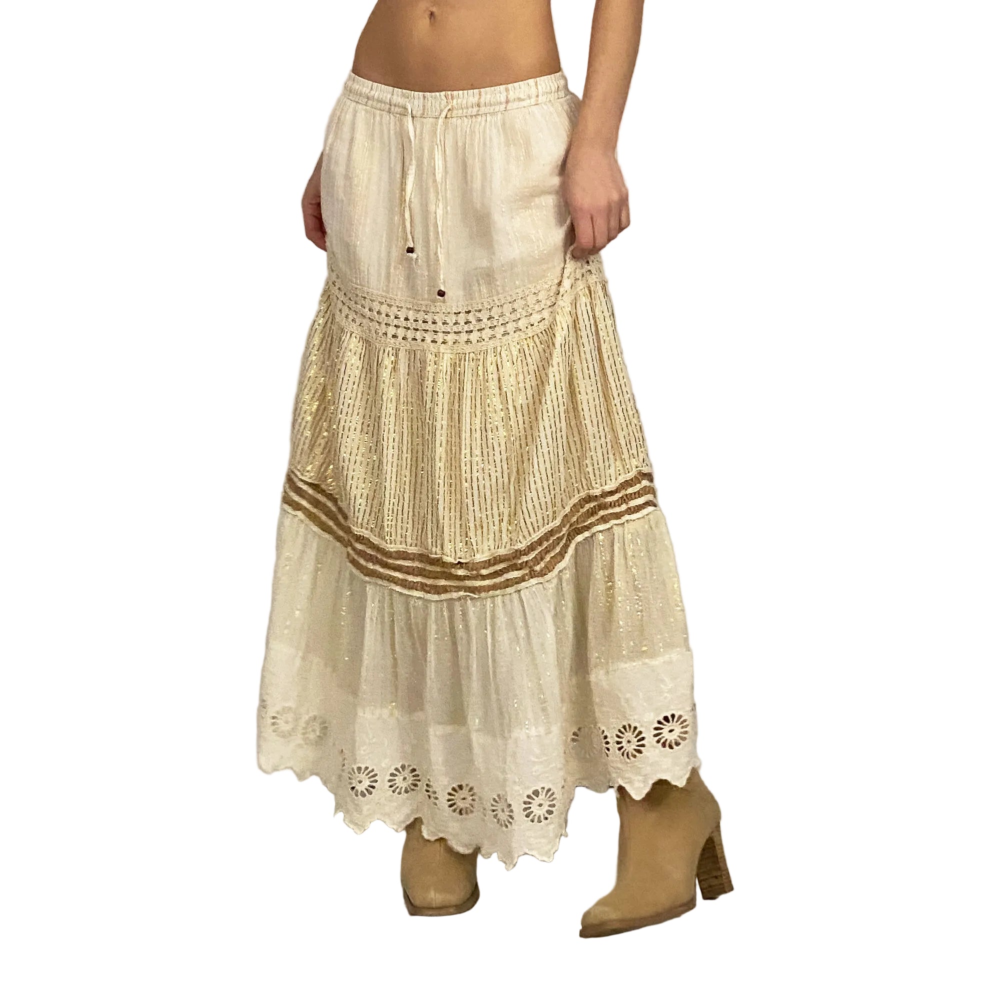 creamy maxi skirt with eyelet lace and gold metallic details.