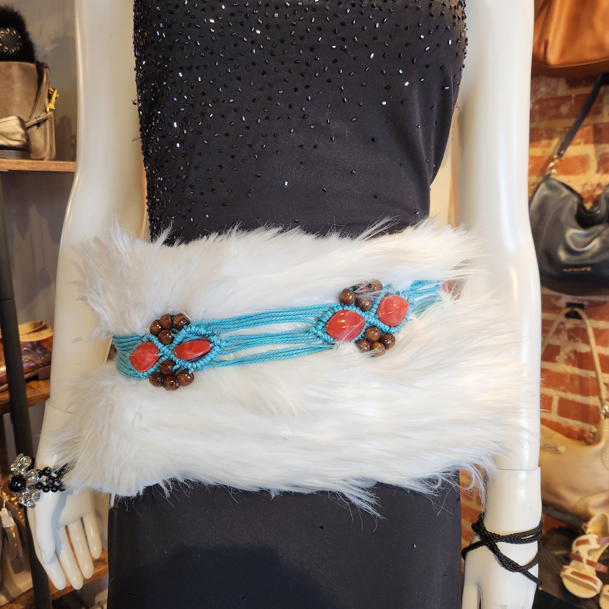 Gorgeous custom fur belt with a bright turquoise roping tie that brings the piece to life. The belt can also be worn as a top or a skirt.