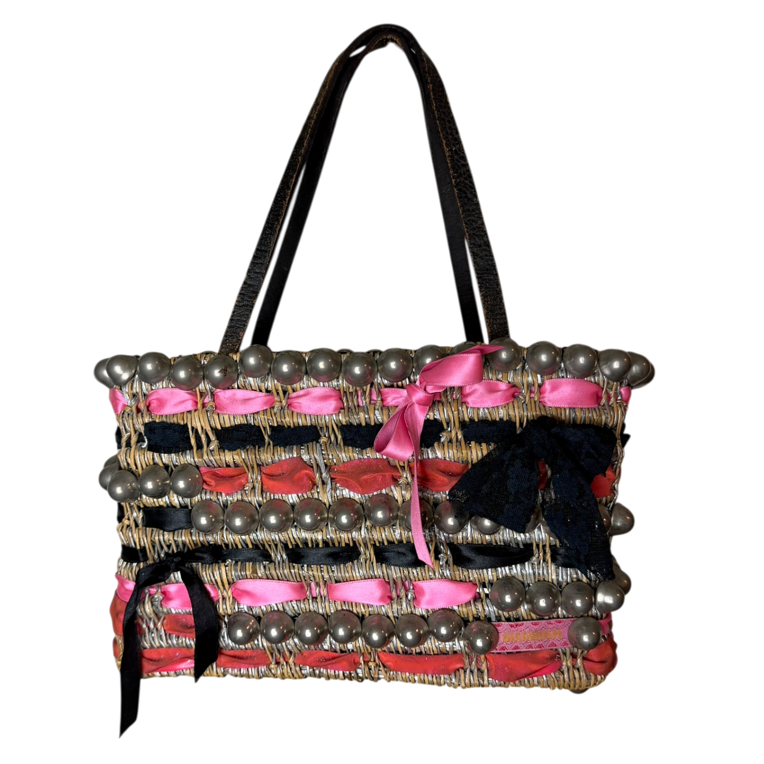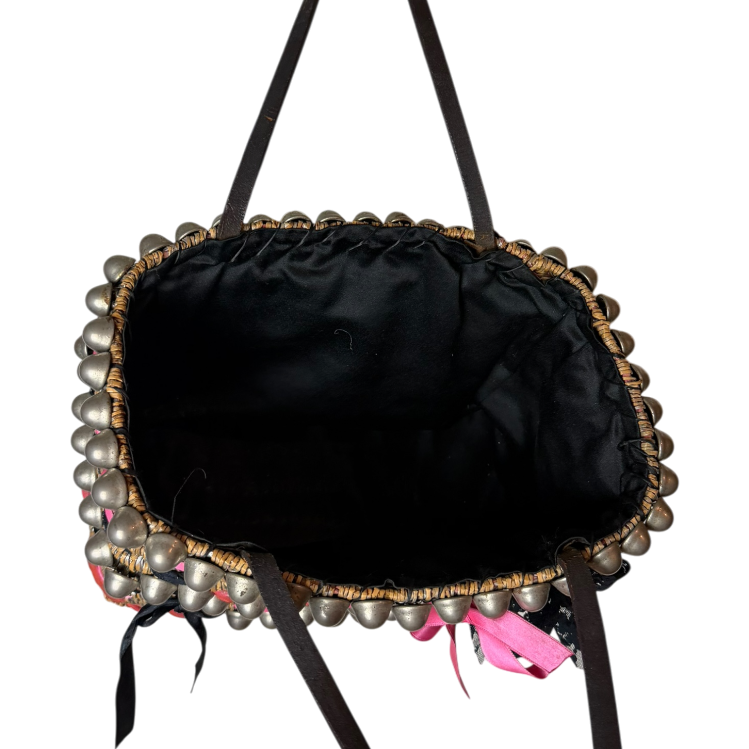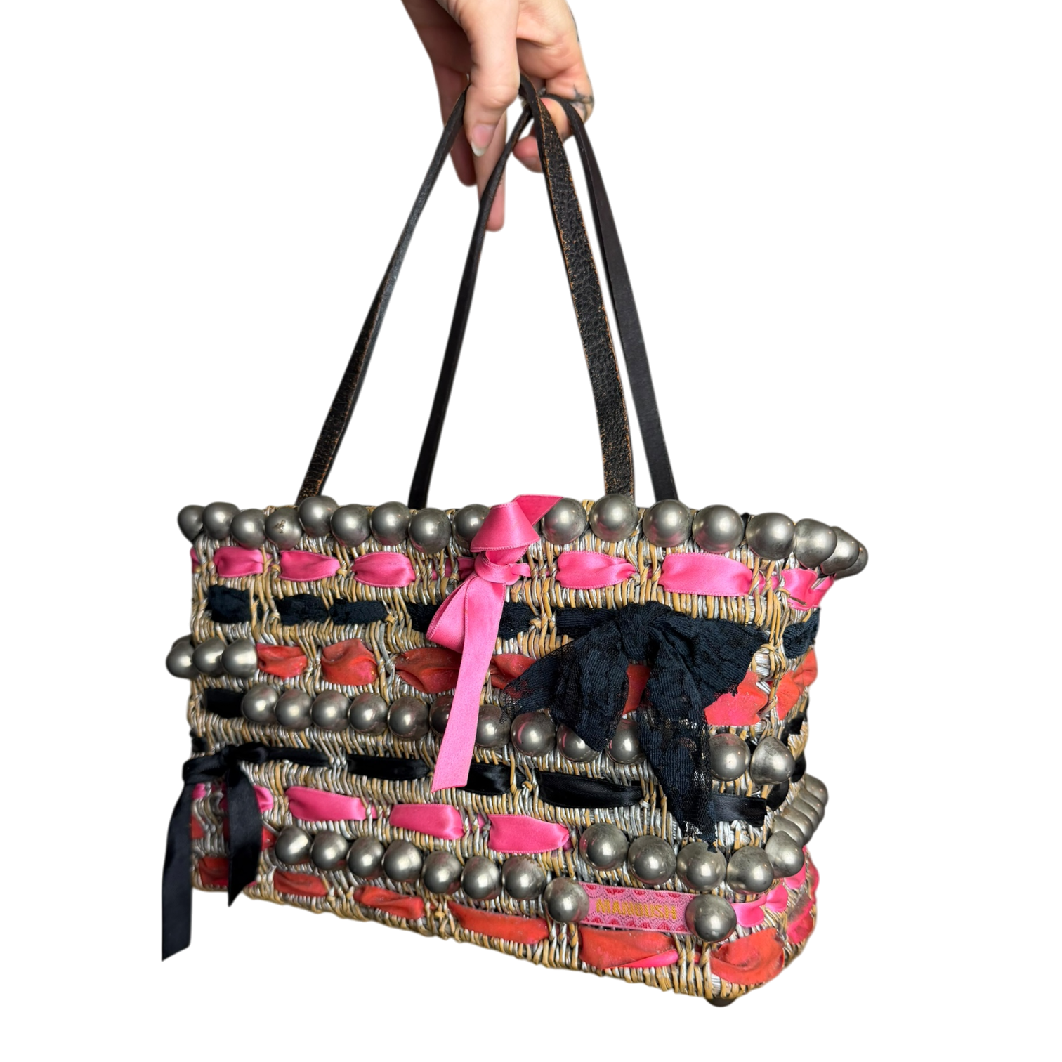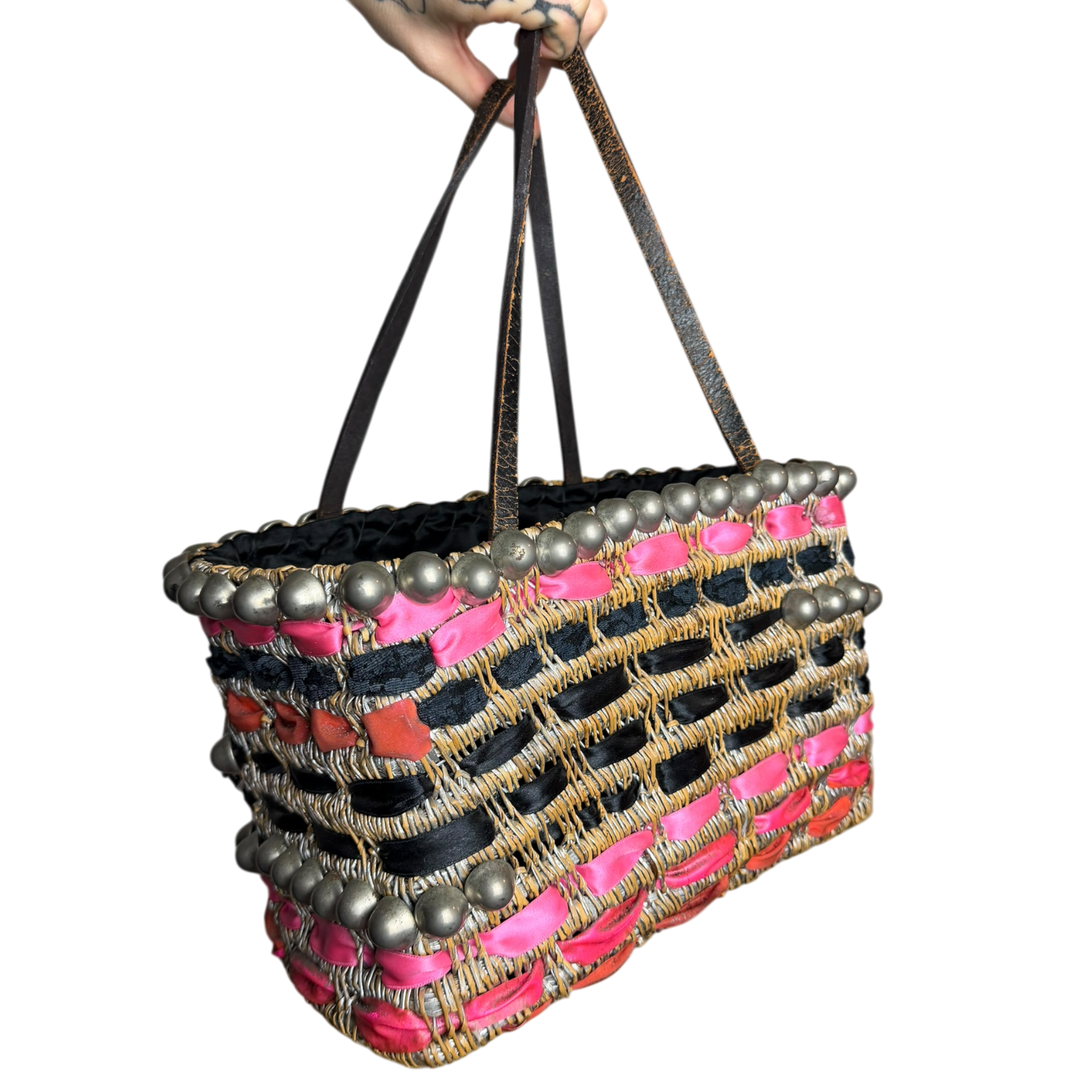 Satin lined thick structured straw bag. Custom 1/1 piece with pink and black lace ribbons thread throughout.