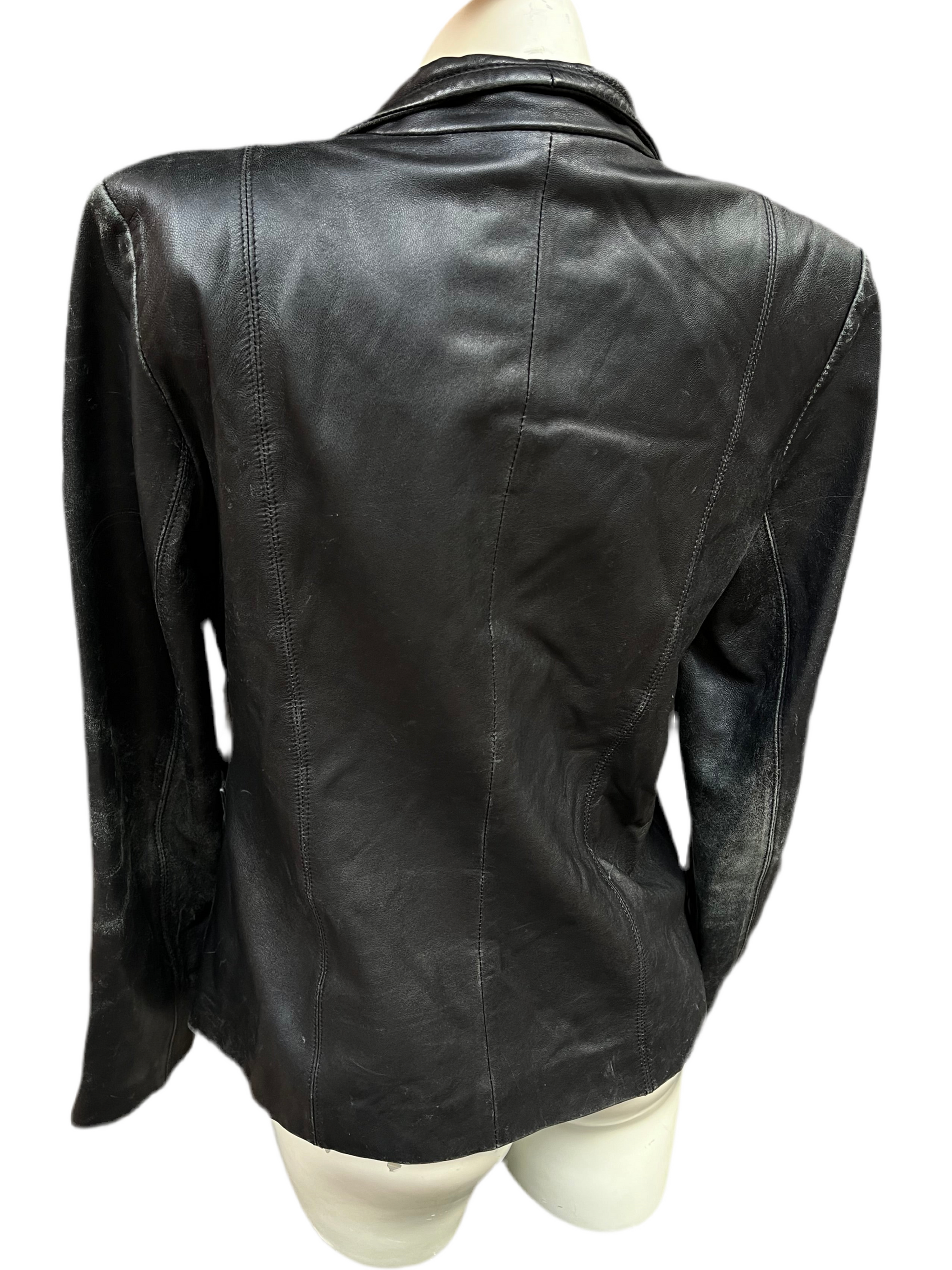 Butter soft leather zip up. Genuine lambskin leather. Some fade in the leather as picture. Adds to the overall character of this closet staple.