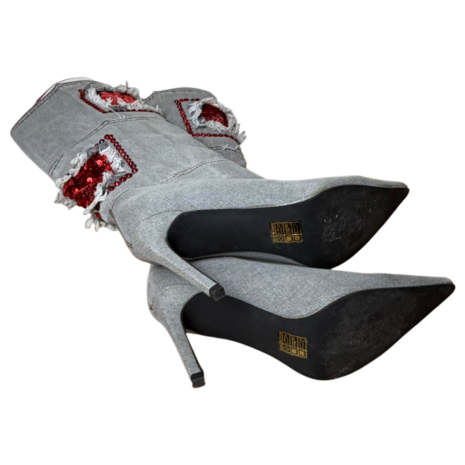 Light grey colored denim heeled boots that remind me of the brand El Dante.