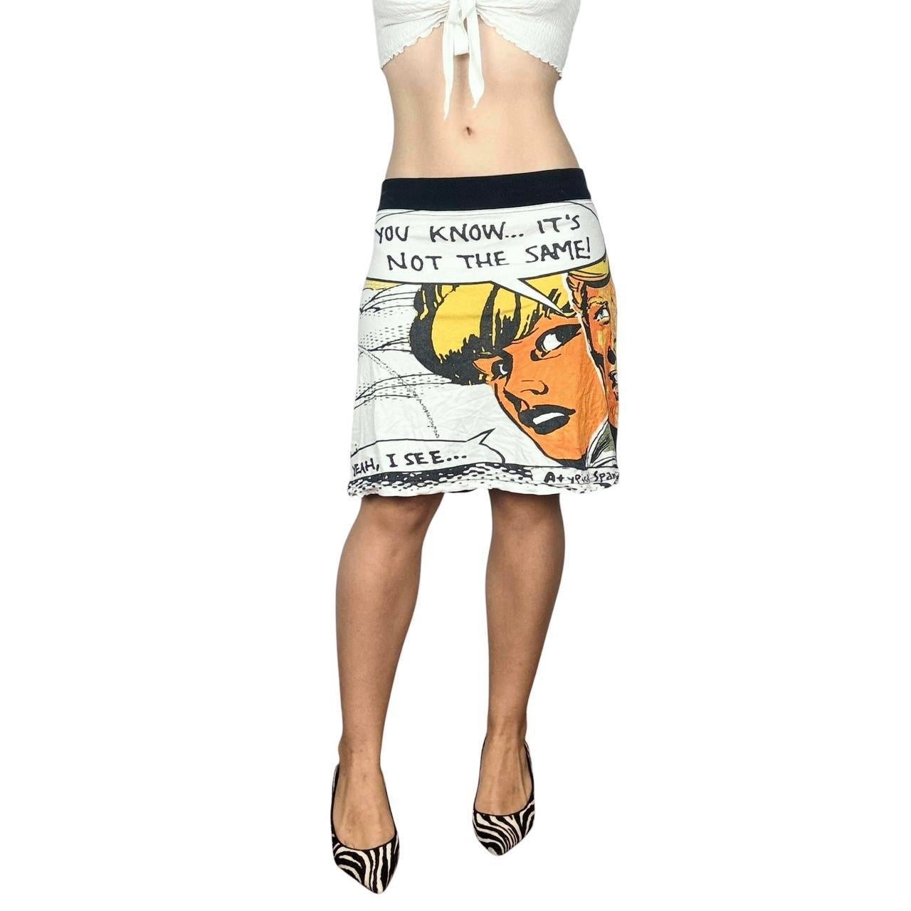 Vintage Desigual skirt from the early 2000s, featuring a unique comic graphic. Soft, stretchy cotton fabric with a pull-on elastic waist & an embroidered logo in the back.