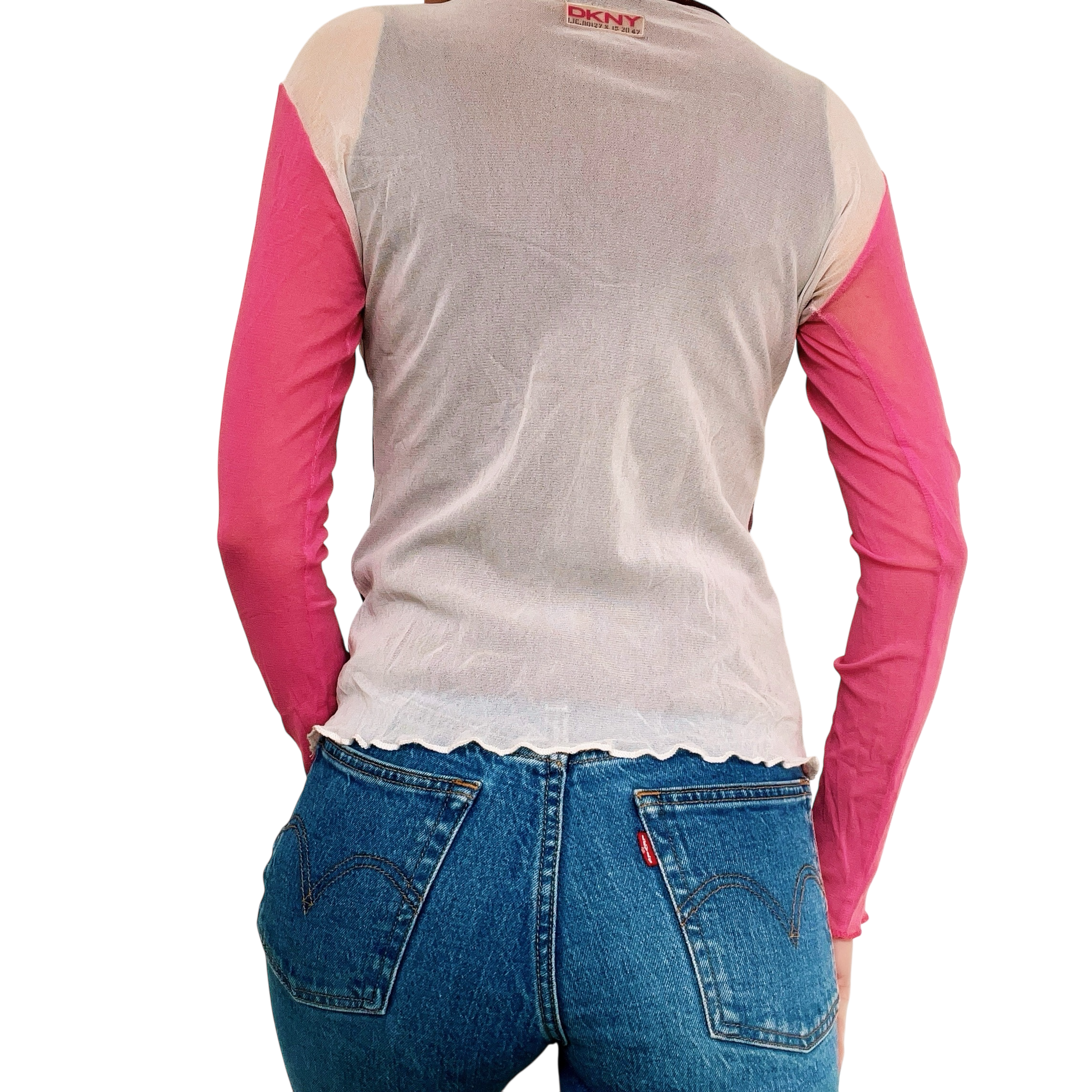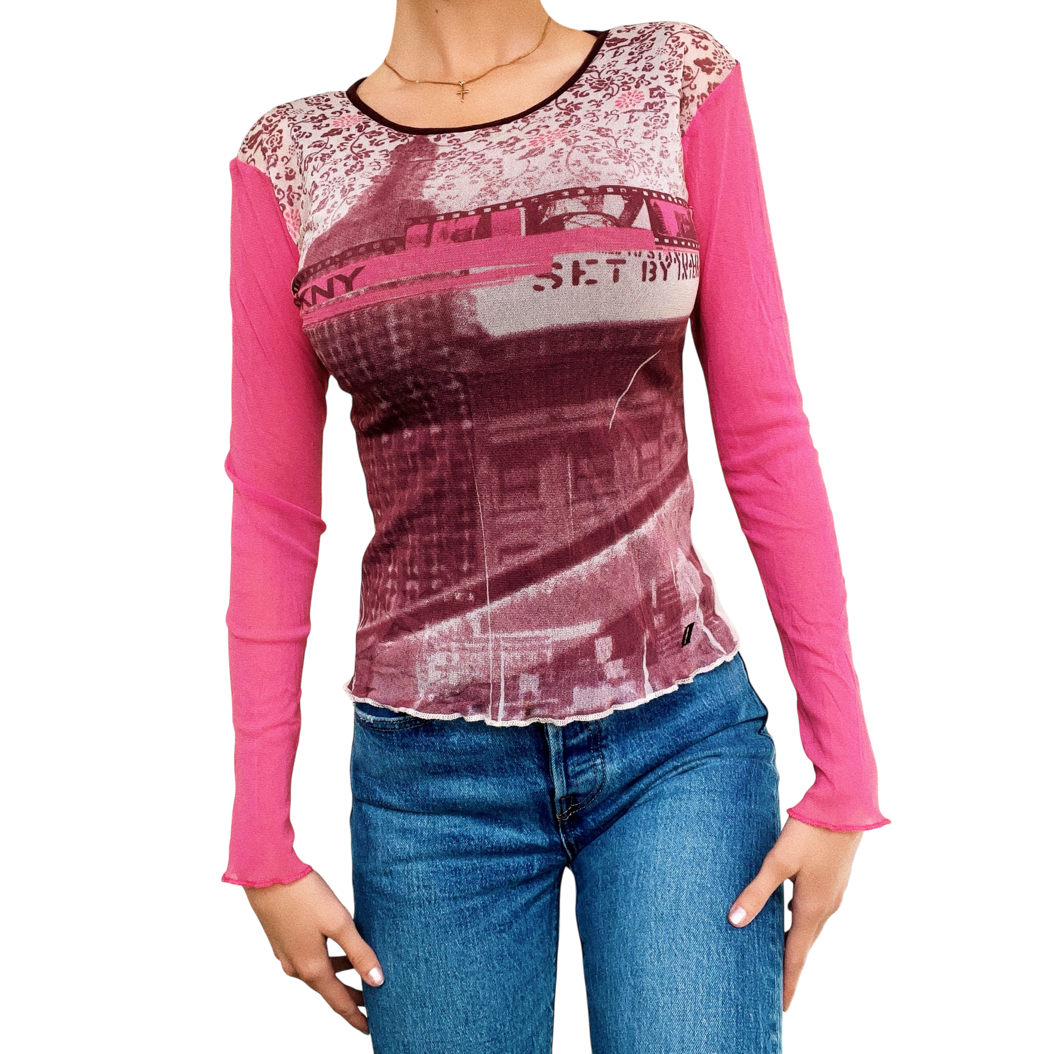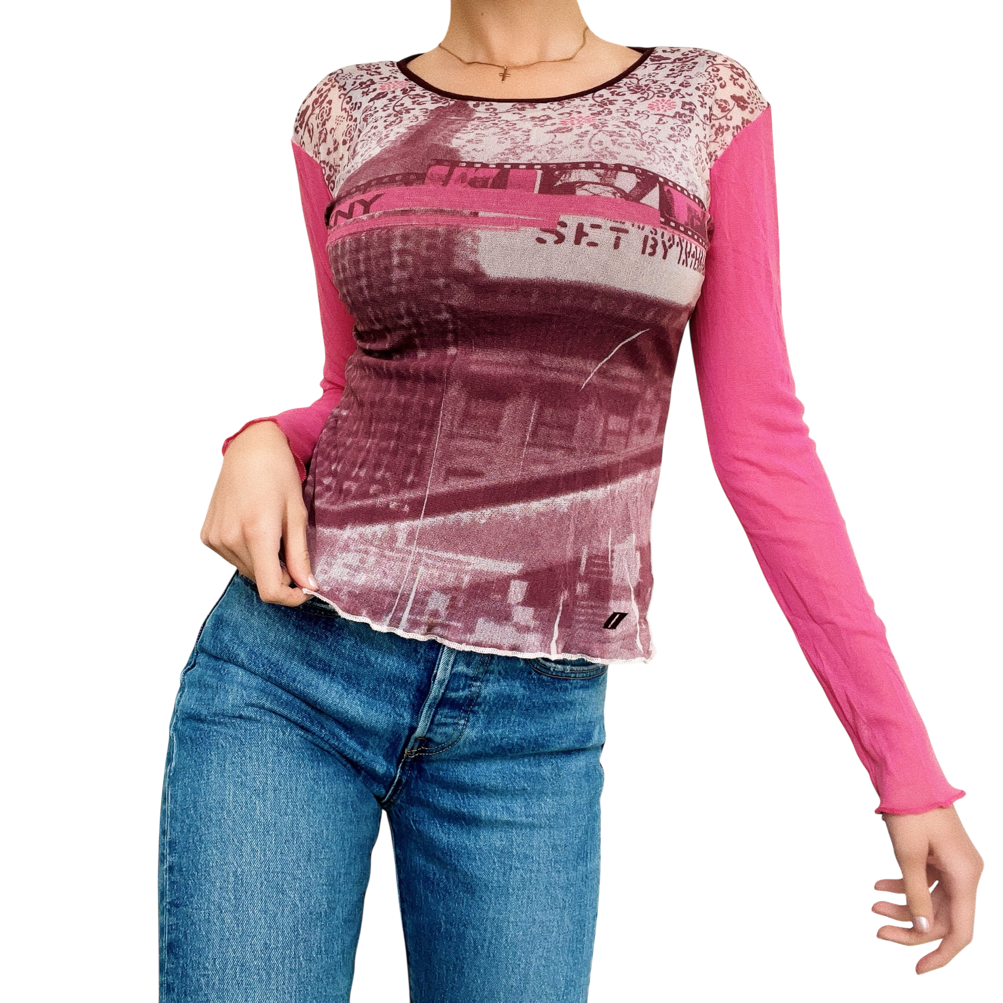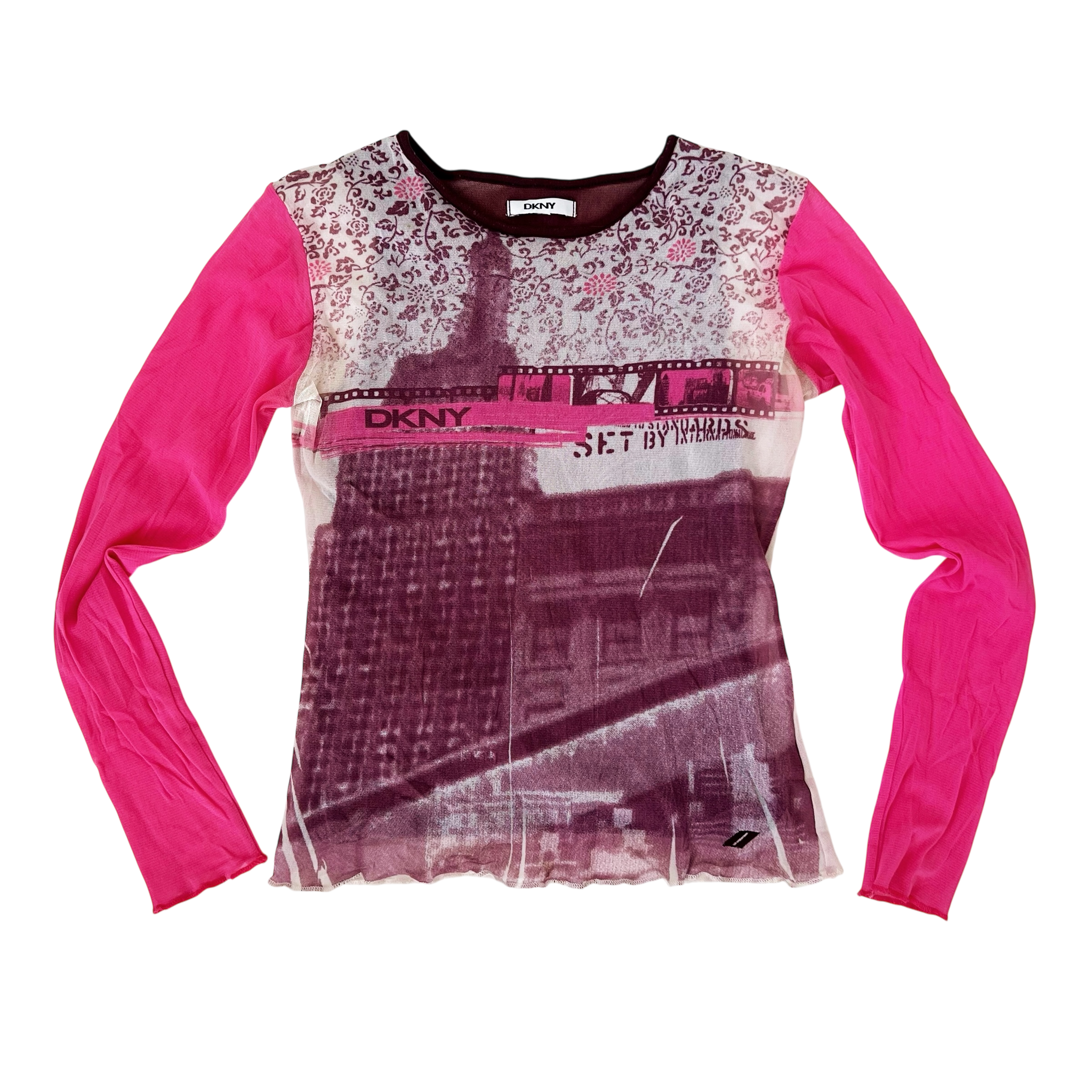 Sheer micro mesh pink and purple graphic longsleeve top, by DKNY!