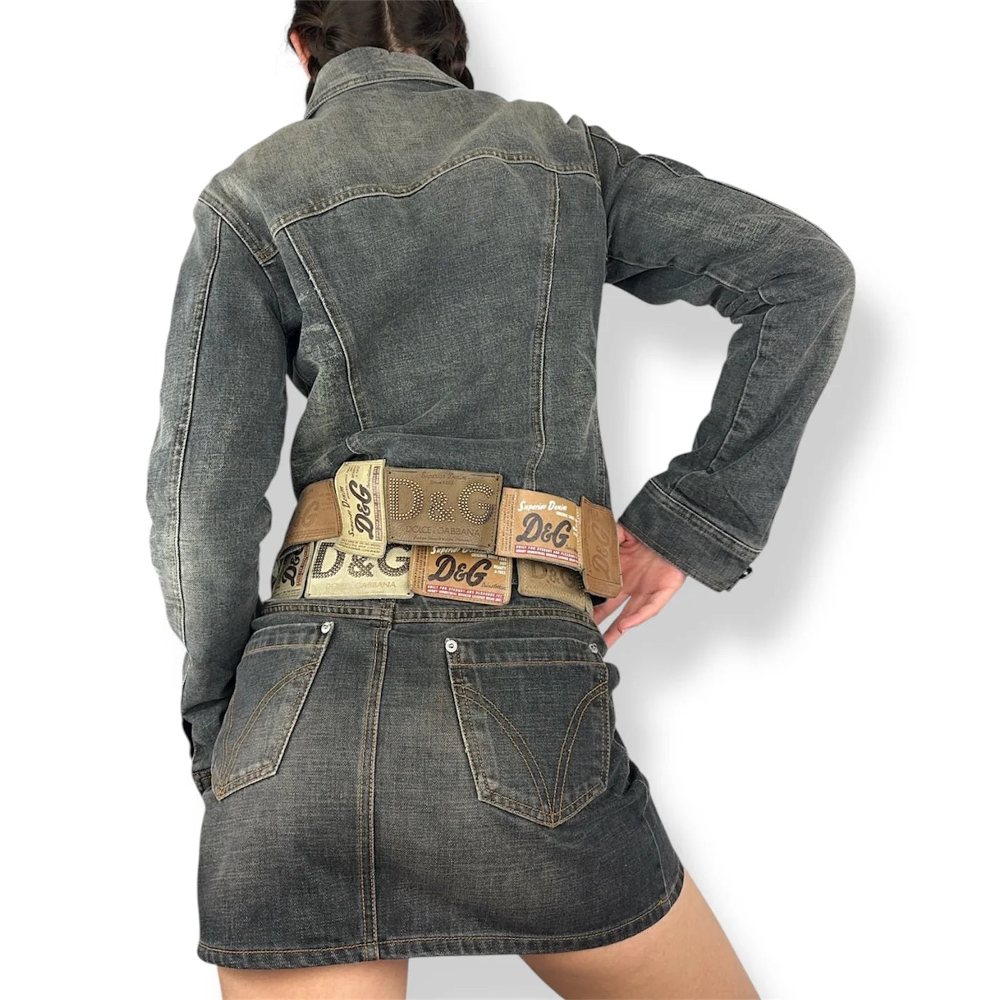 Rare Dolce & Gabbana AW2003 dark denim jacket with various leather patches across the bottom hem