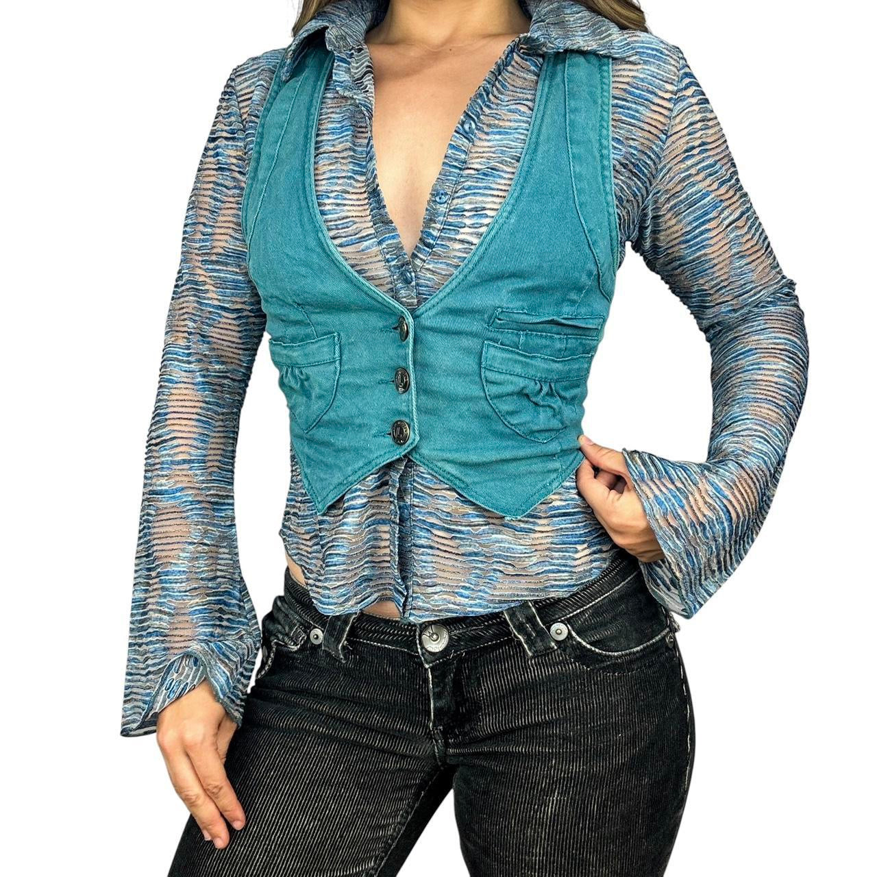 Teal green stretch denim vest from the early 2000s. Cropped, figure-hugging fit with adjustable ties in the back of the waist.
