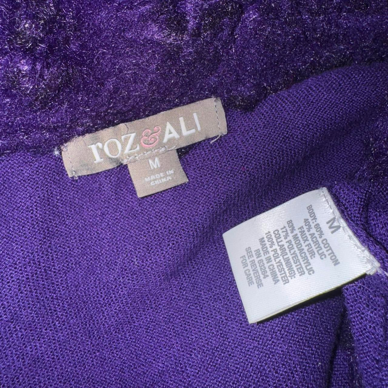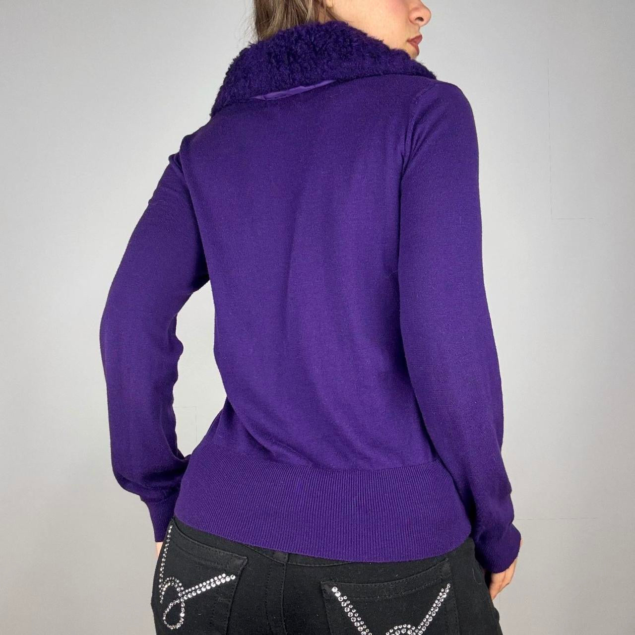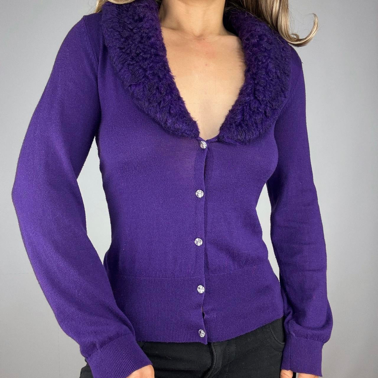 Deep purple cardigan from the early 2000s featuring a dramatic faux fur collar. Soft & stretchy knit with gemstone buttons. Very good pre-loved condition.