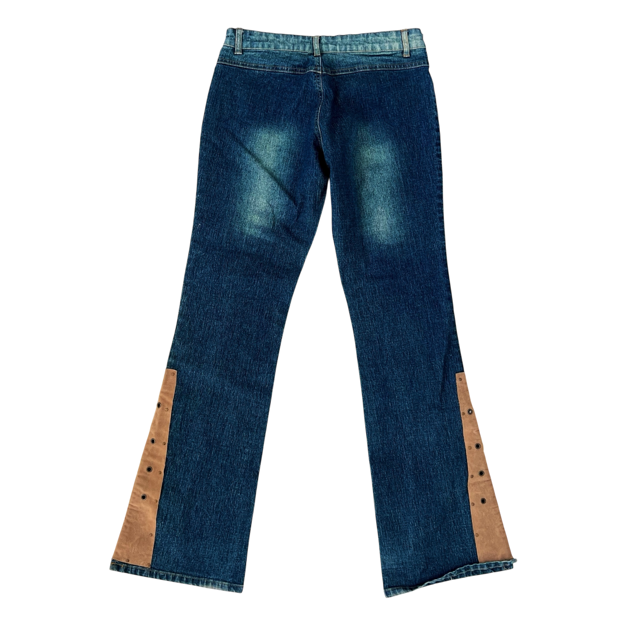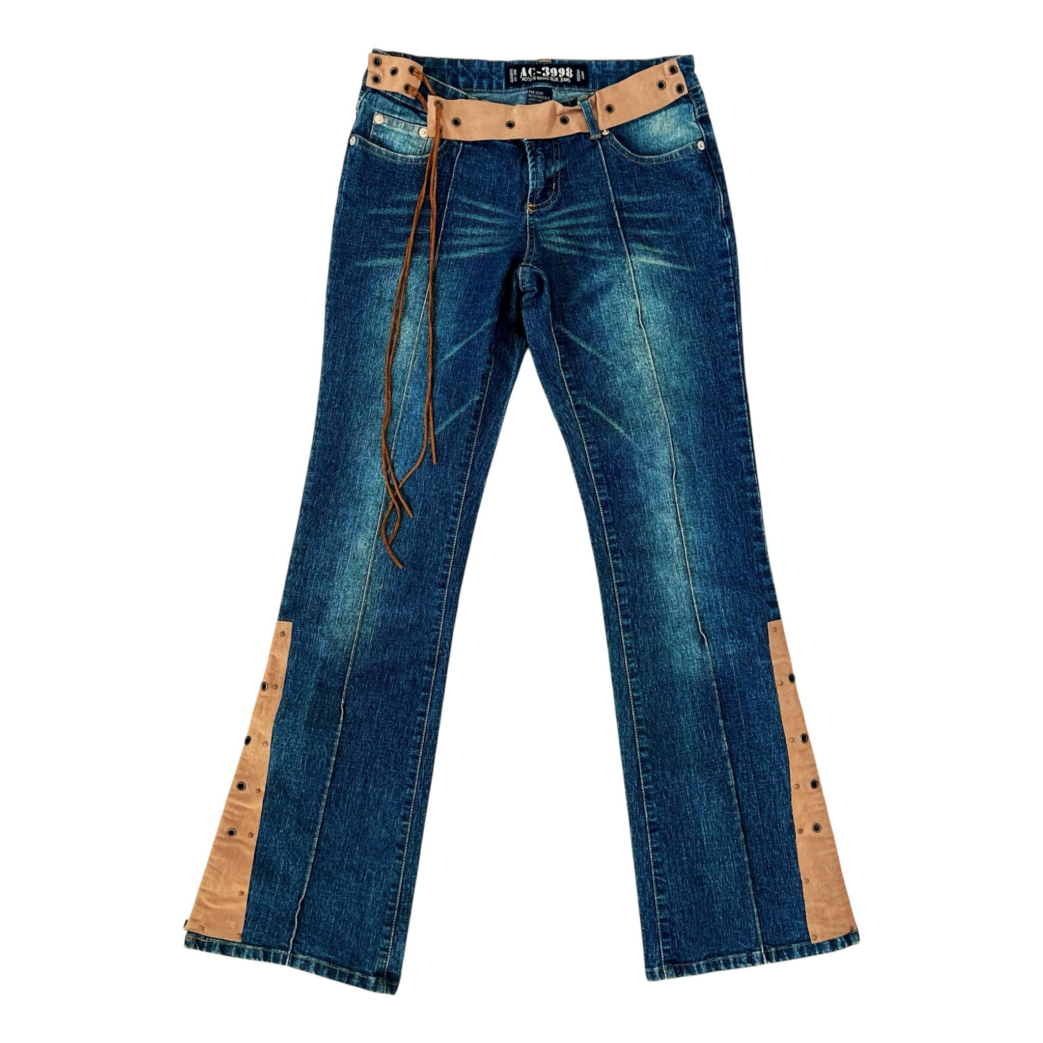 Early 2000s low rise jeans with faux suede Western-style details and a cute little attached belt!