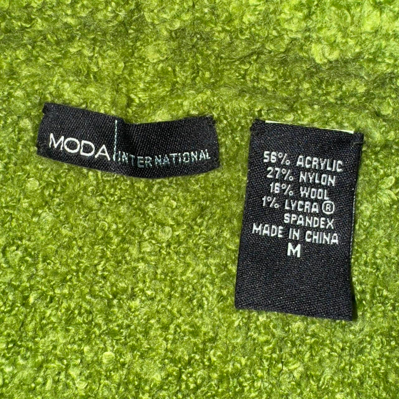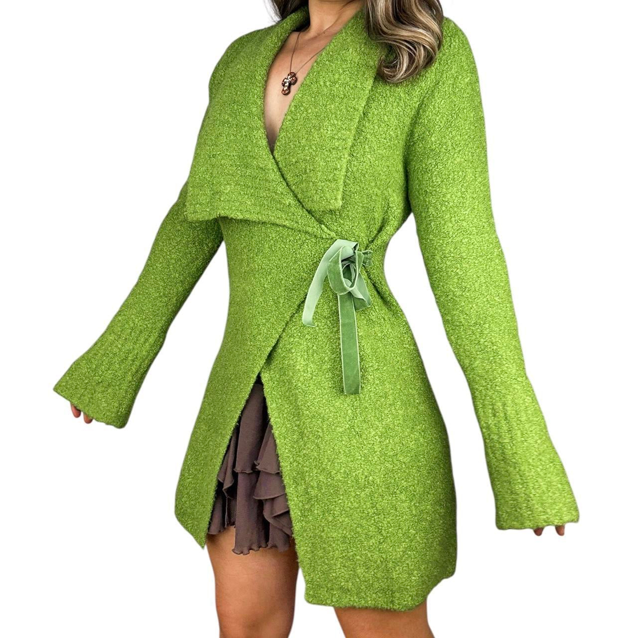 Earthy green cardigan from the early 2000s. Dramatic collar & velvet ribbon wrap closure. Soft, stretchy knit blend of 56% acrylic, 27% nylon, 16% wool, 1% lycra. Excellent pre-loved condition.