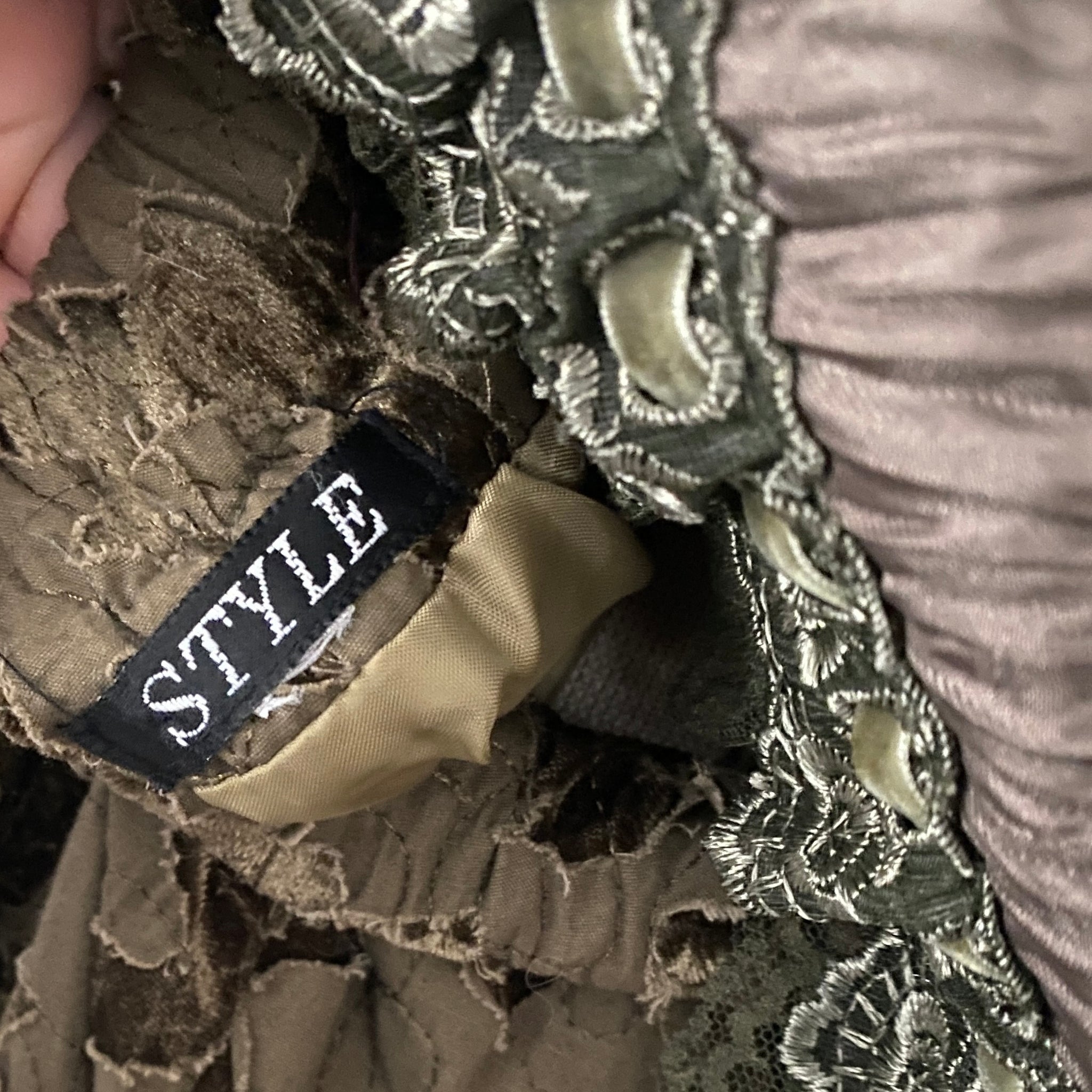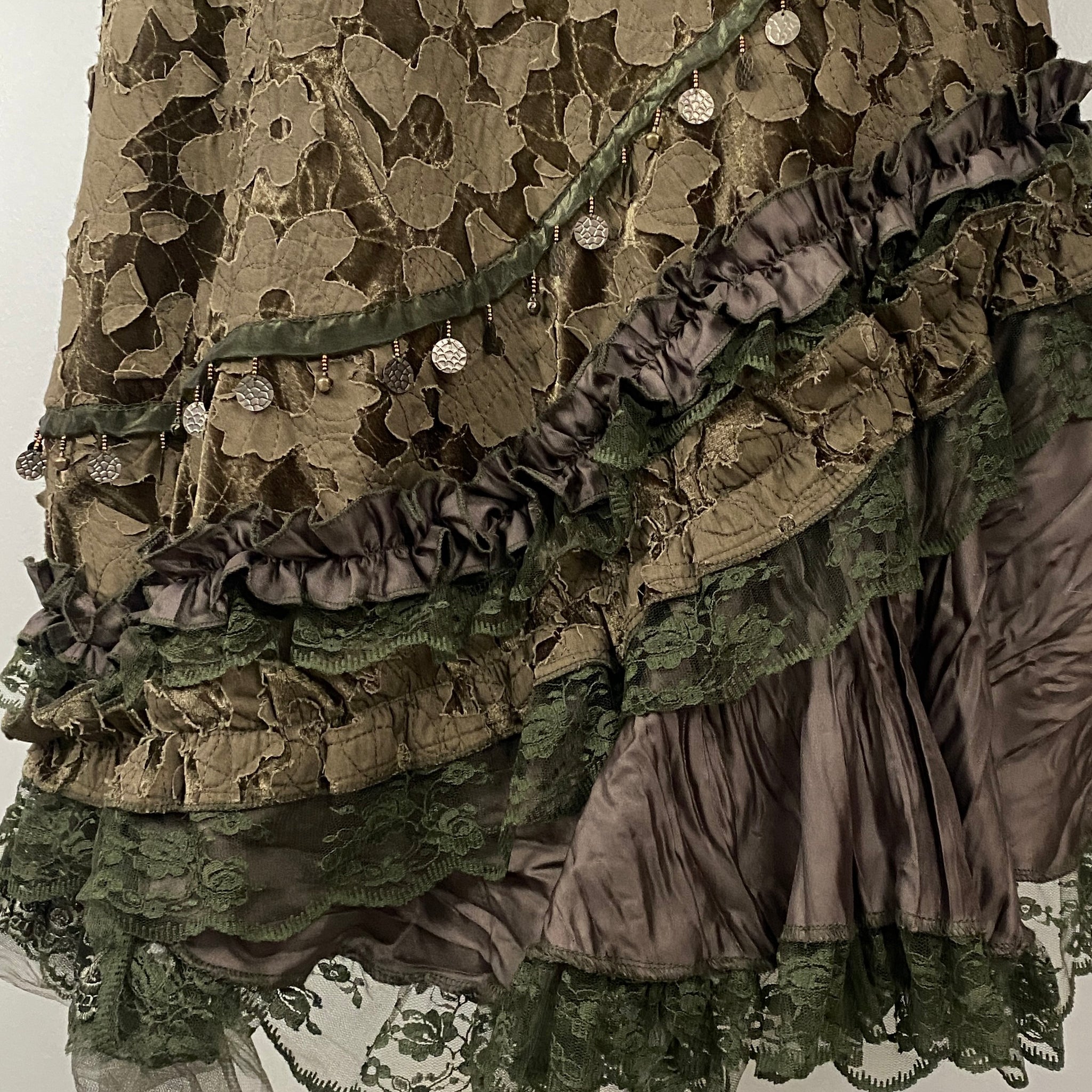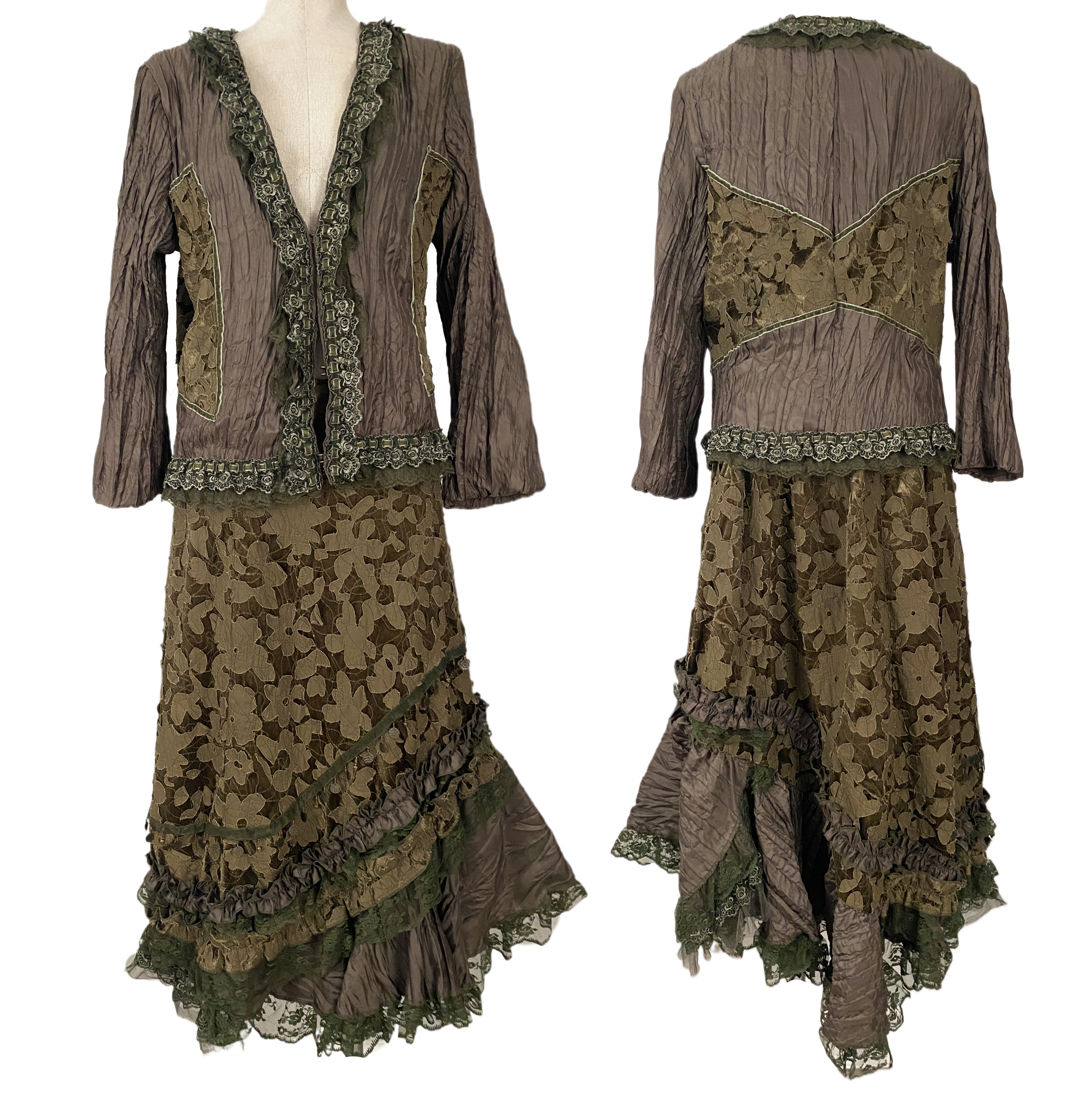 vintage fairycore tiered midi skirt and jacket set with lace and embellishments. earth tone greens with lace and embellishments. jacket has a hook and eye front closure. back of skirt is elastic with a side zip closure.