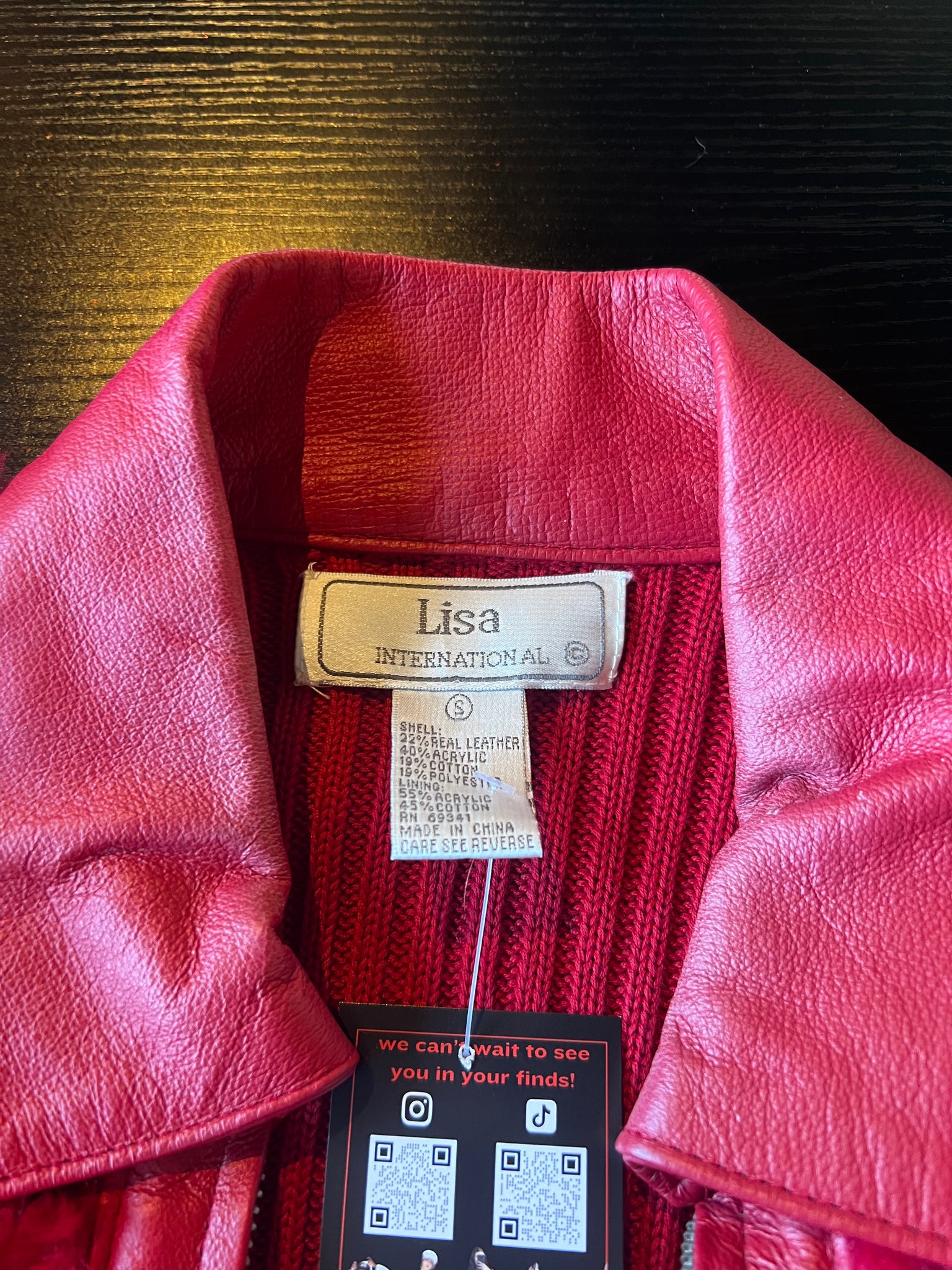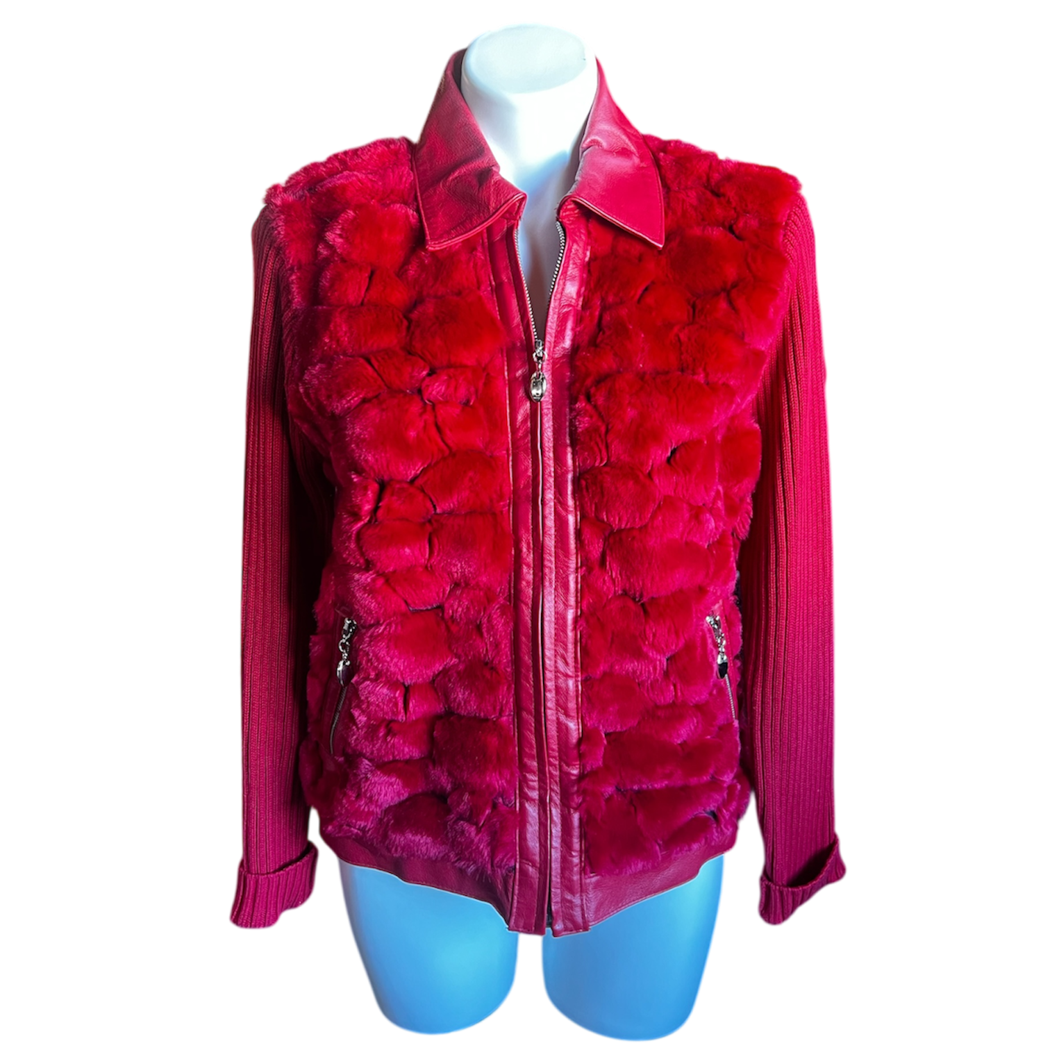 Red faux fur knit sweater jacket with red leather detailing and silver zippers.