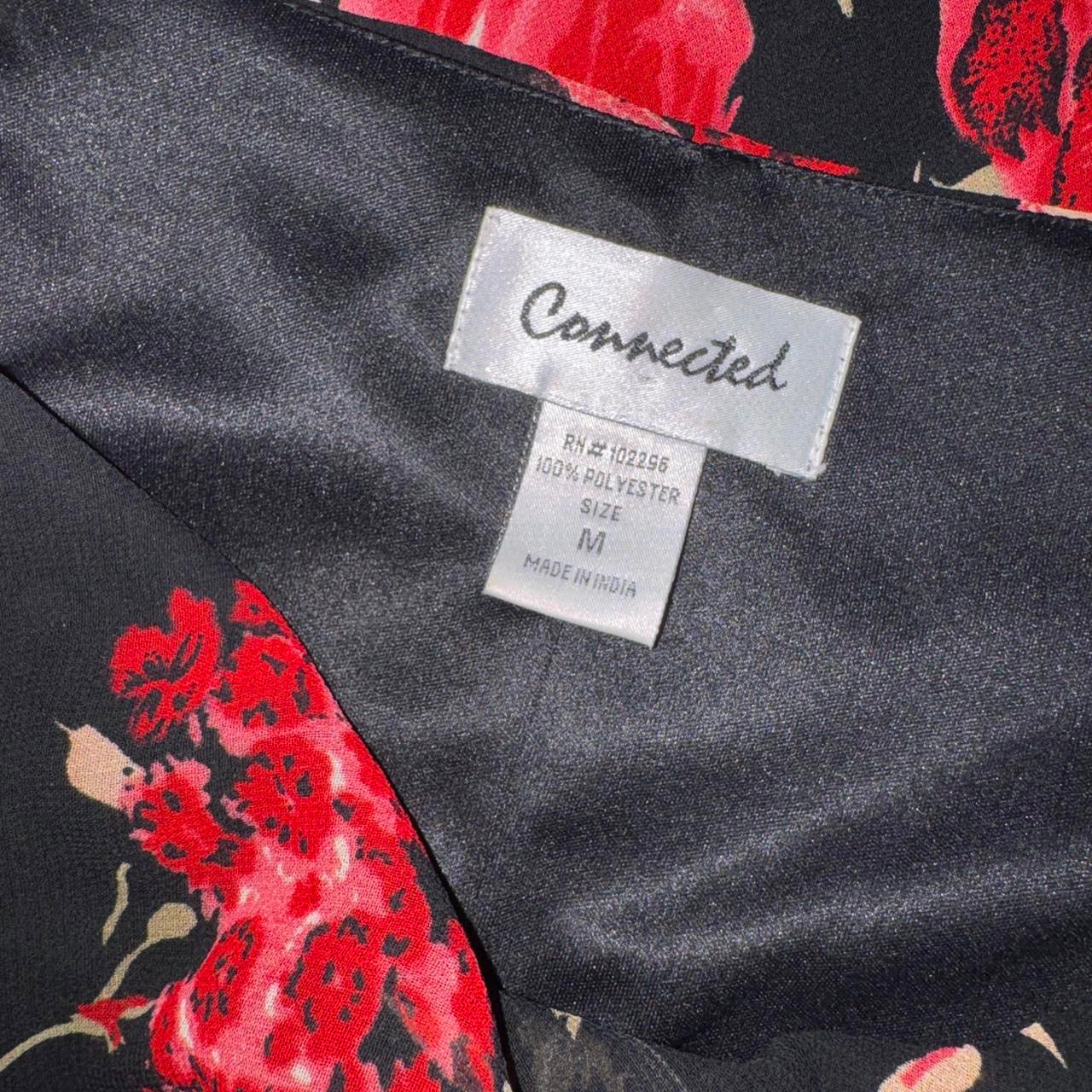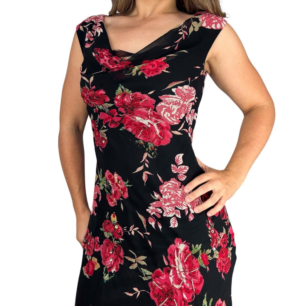 Dreamy early 2000s dress featuring an elegant draped neckline. Romantic red & black rose floral print with subtle beaded detailing. Excellent condition.