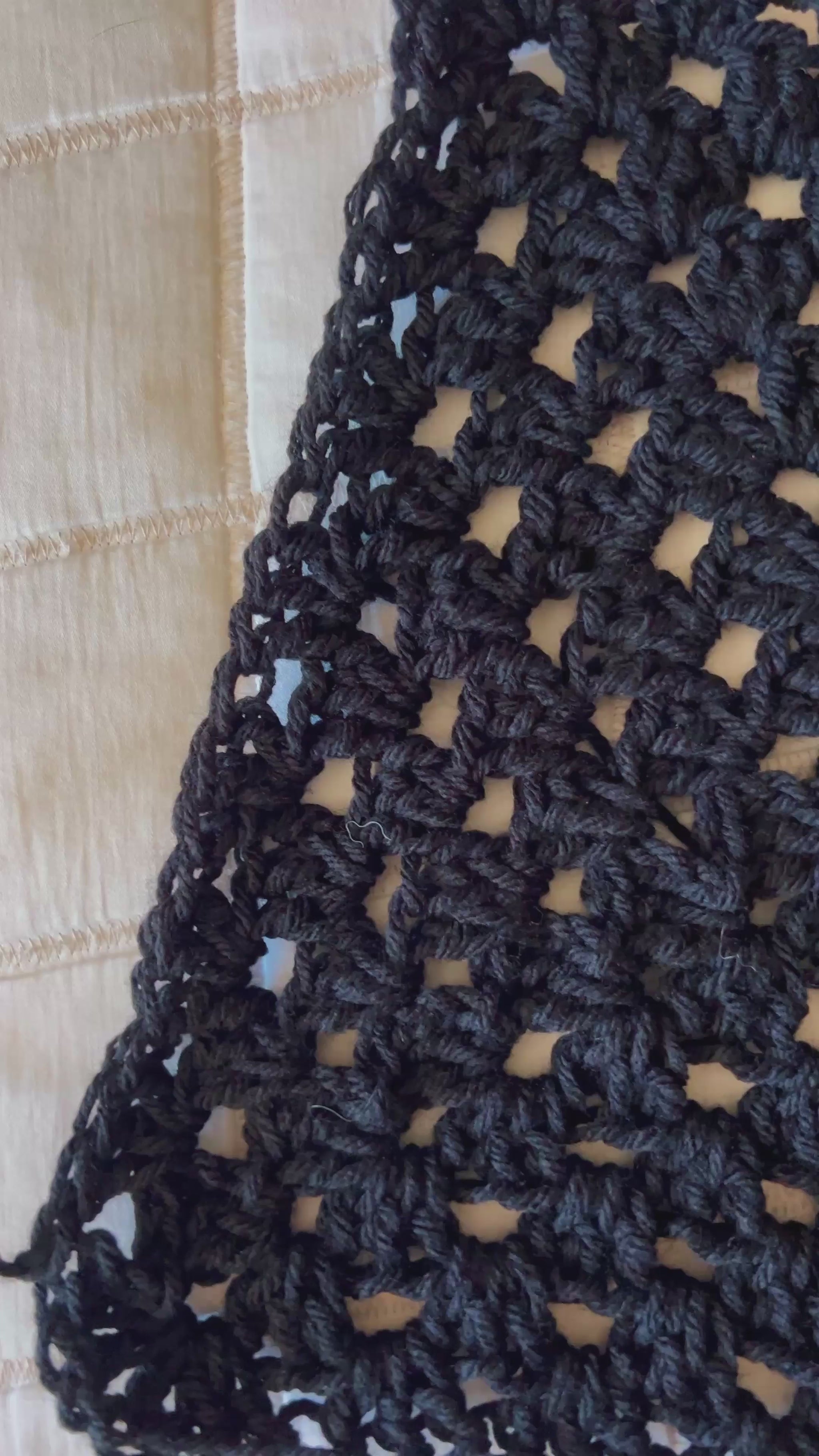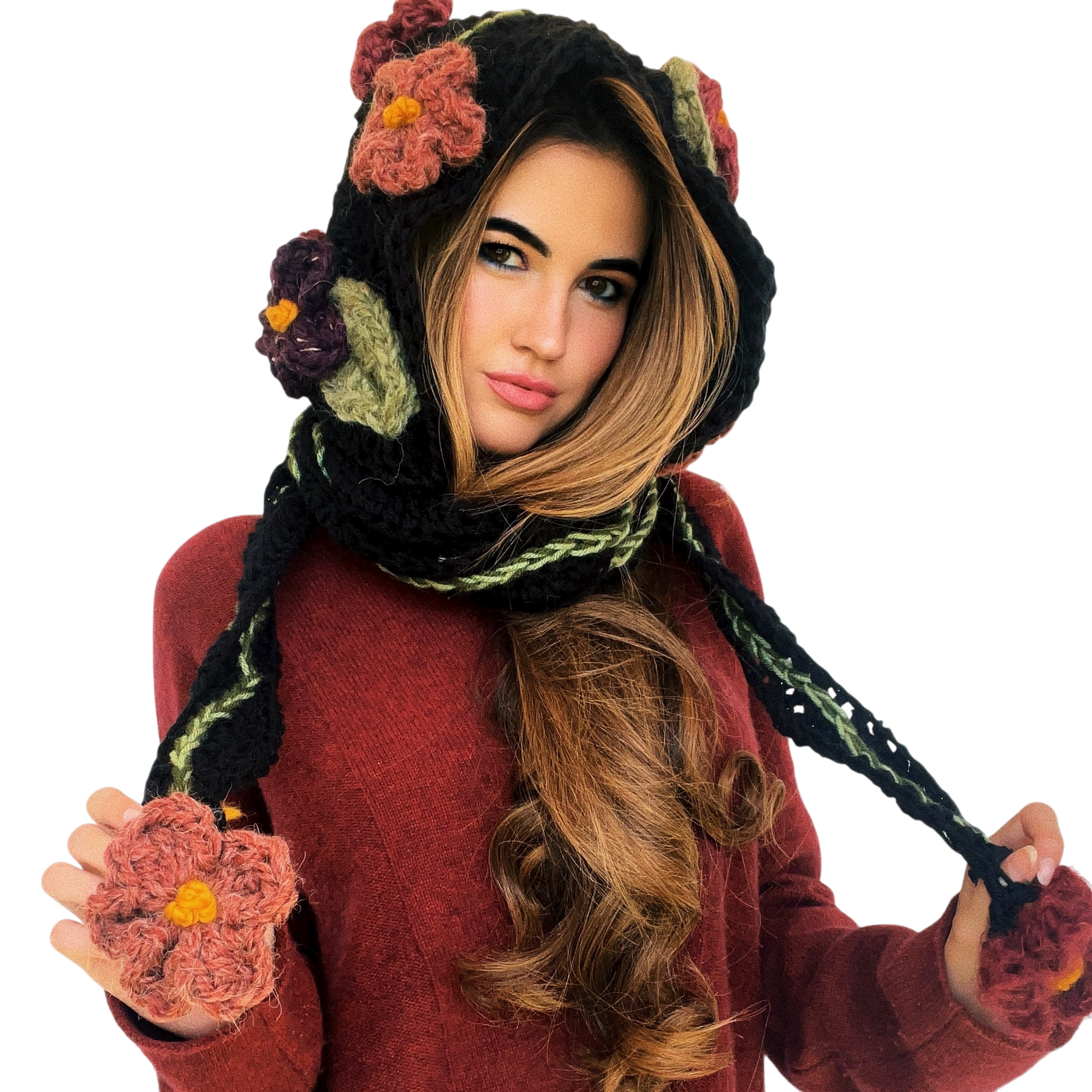 - Black with rich earthy colored floral embellishments made of chunky fuzzy yarn