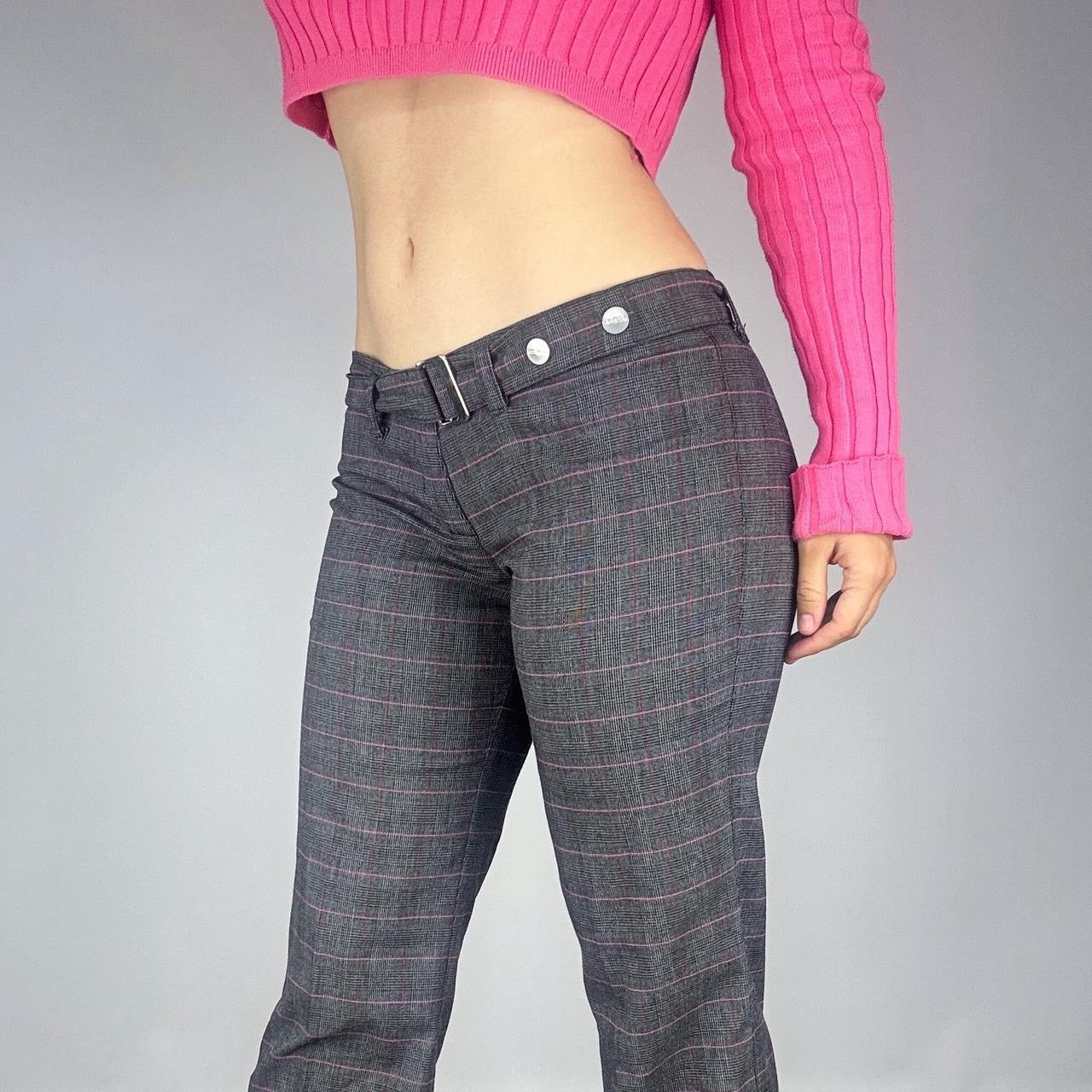 Sleek grey trousers from the early 2000s with a cute pink plaid print. Low rise fit with belt buckle & snap detailing. Made in France by “Amnesia”. 100% cotton. Excellent condition.