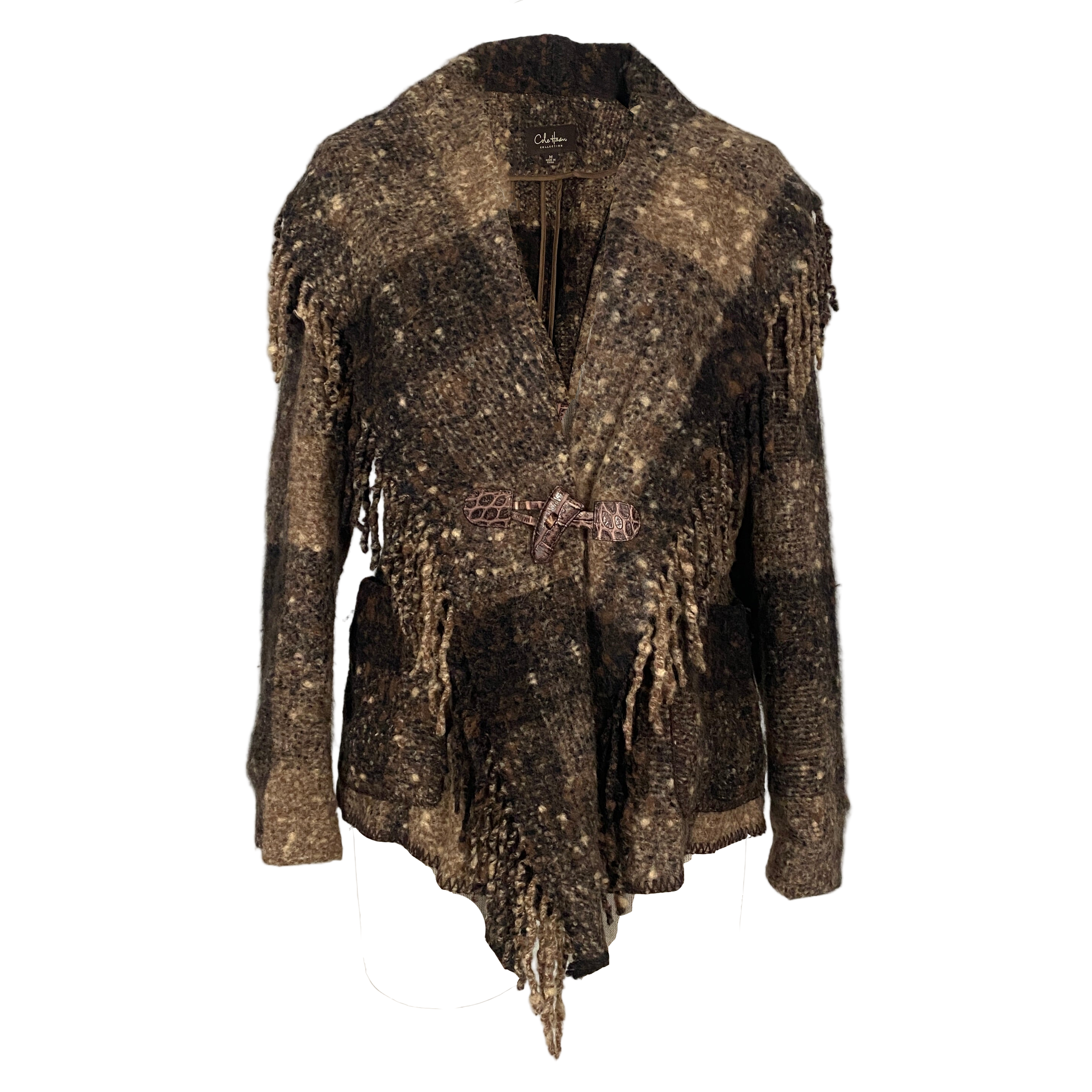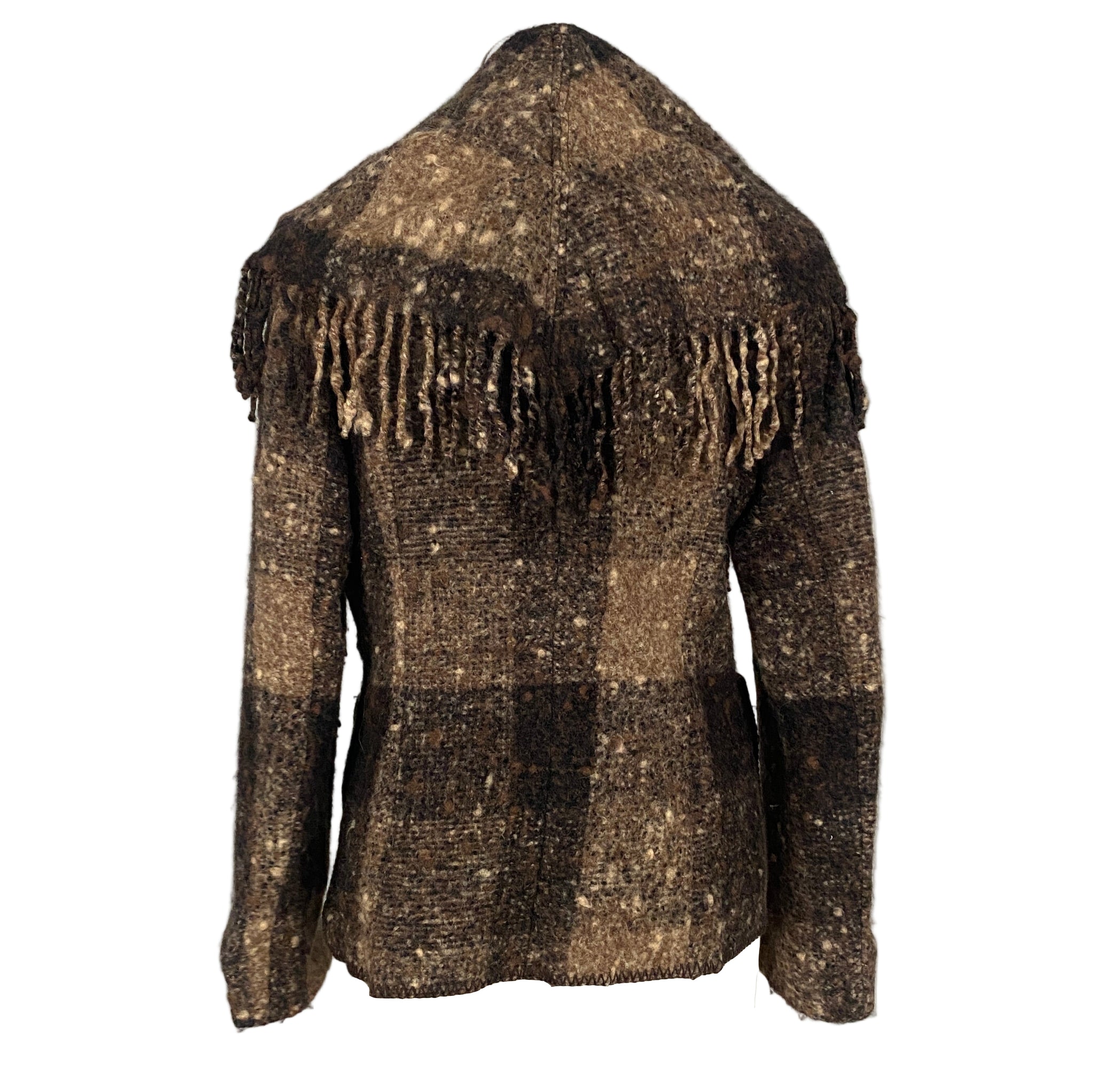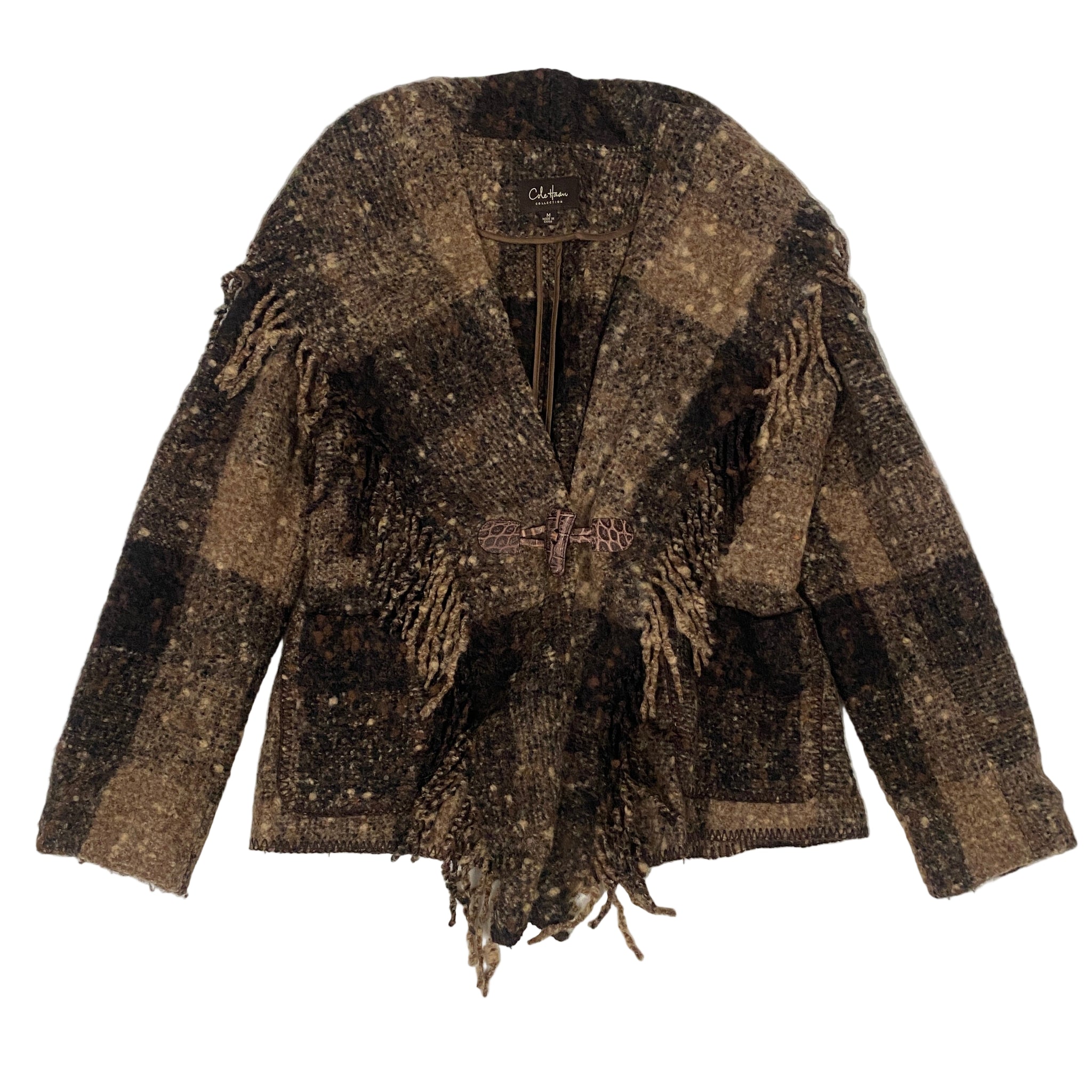 cole haan brown plaid virgin wool-blend fringed jacket with a toggle button closure.