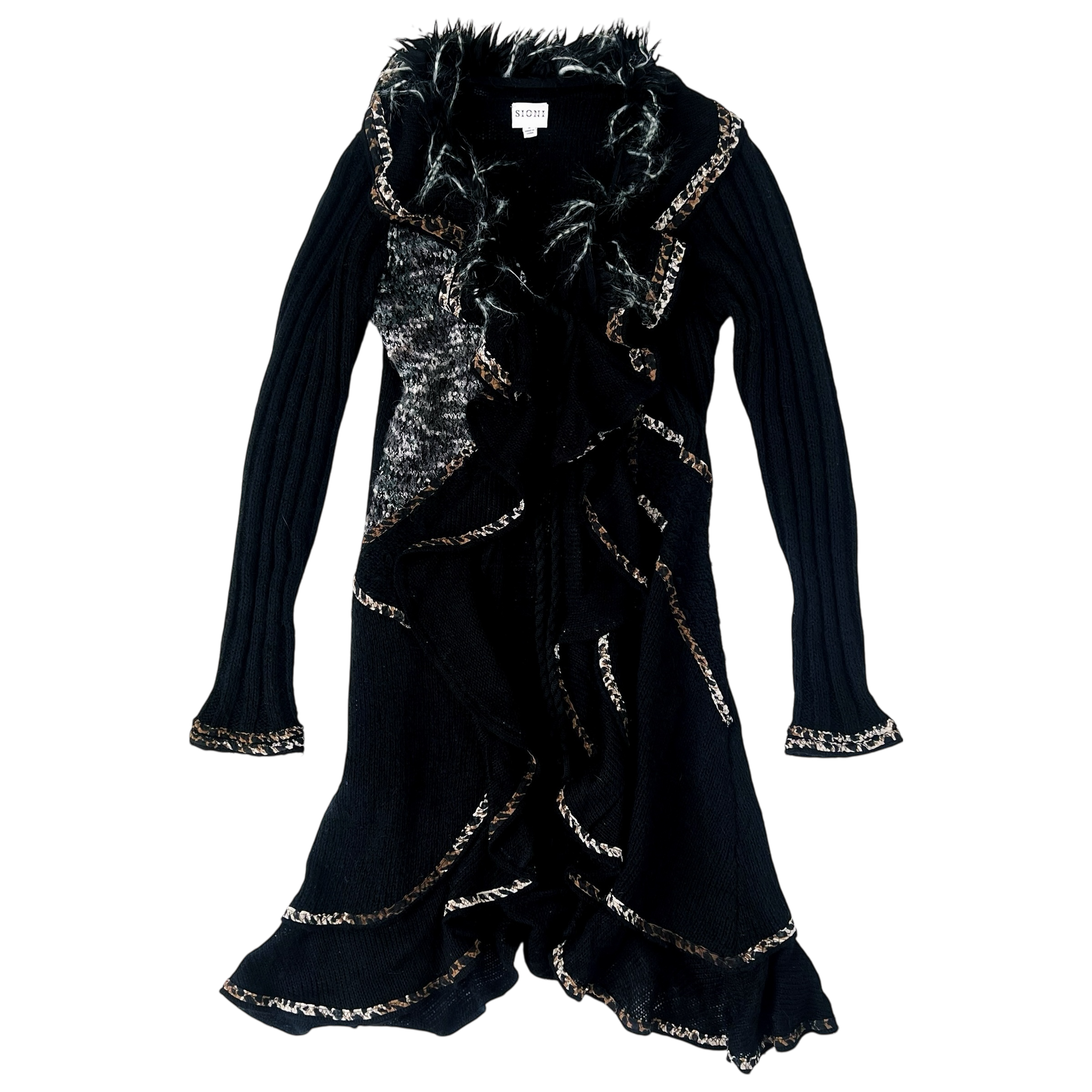 Black knit long duster cardigan with funky animal print details and furry embellishments!