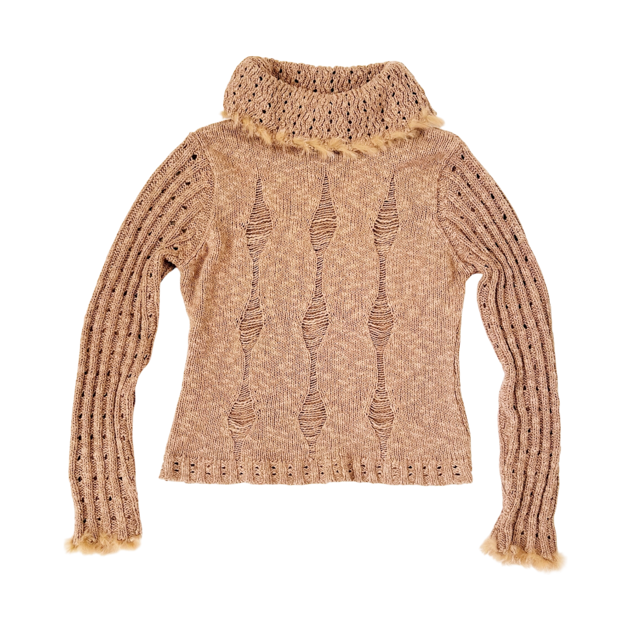Tan silk-blend turtleneck sweater with distressed open-knit details and genuine fur trim around the collar and cuffs!