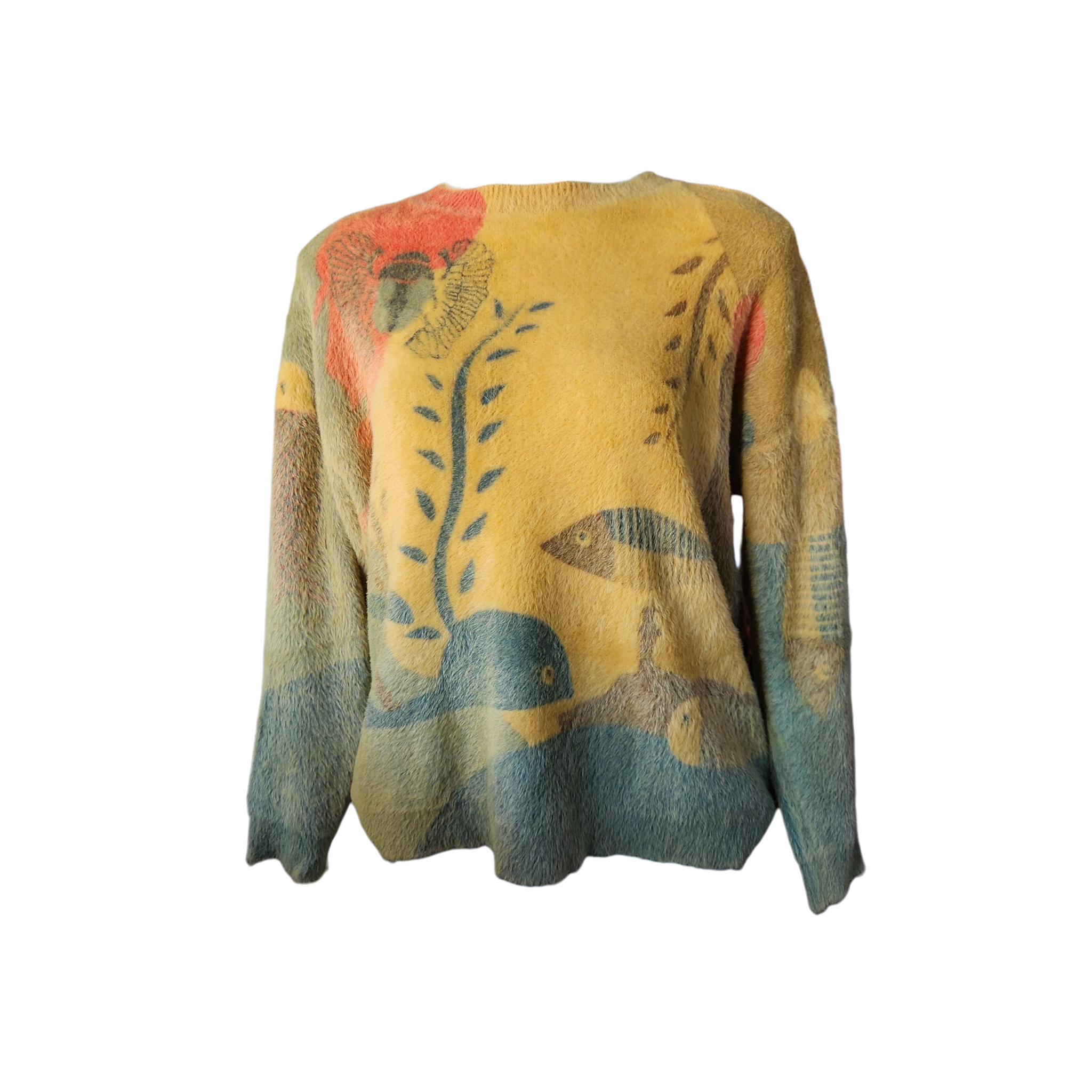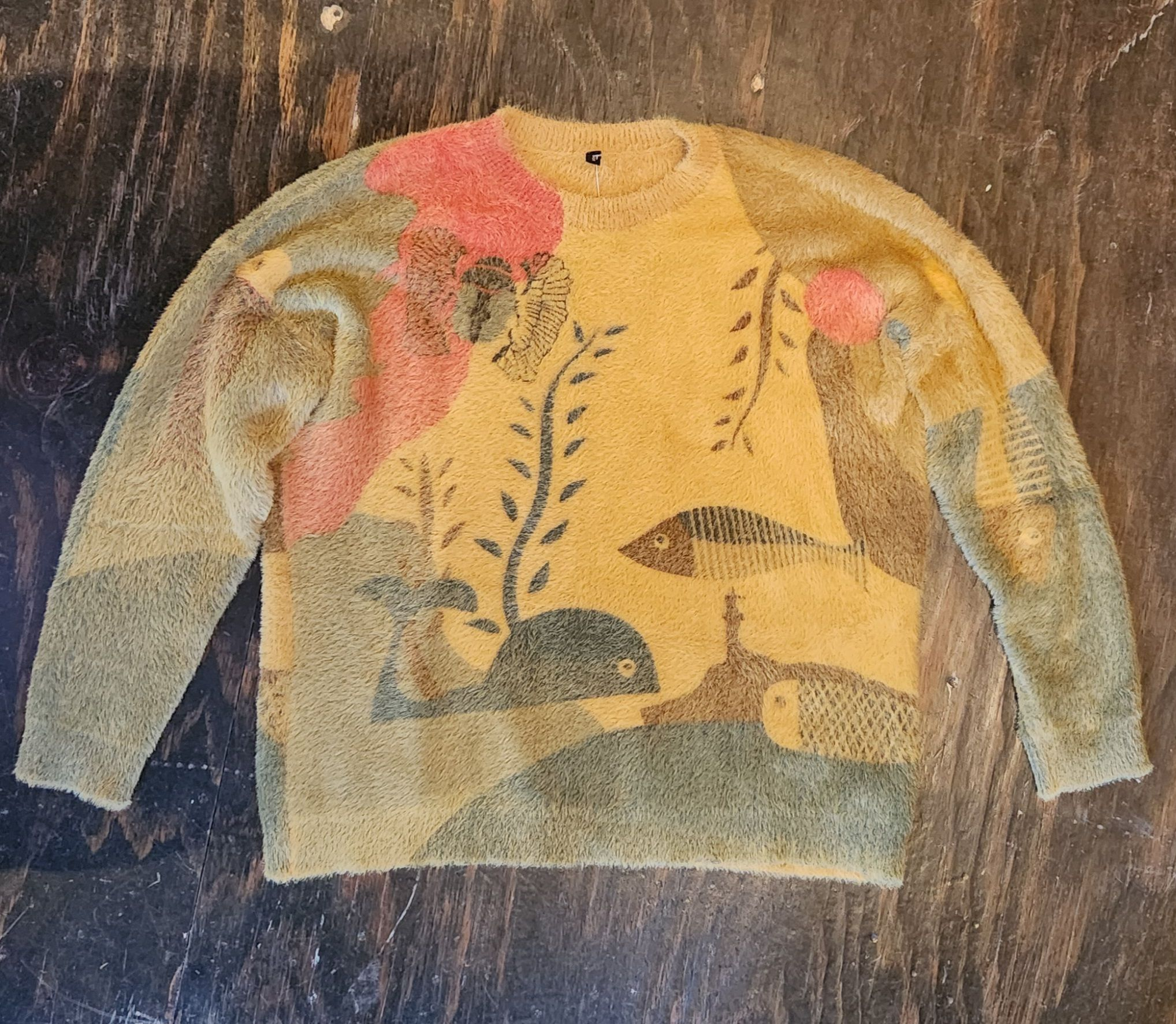 Oversized, super soft, fuzzy sweater, with funky fish design.