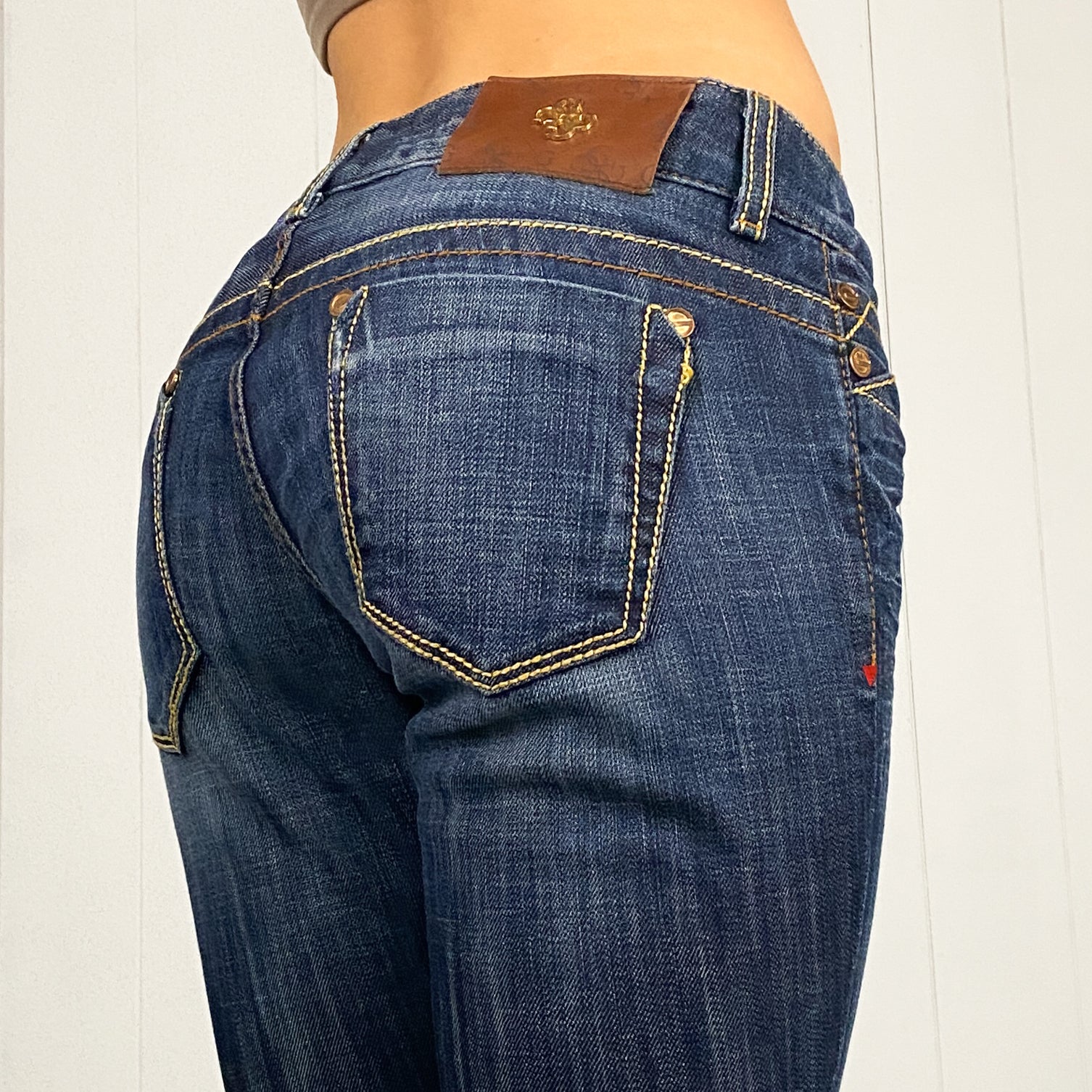 2000's Guess dark wash low rise bootcut jeans. Long inseam.