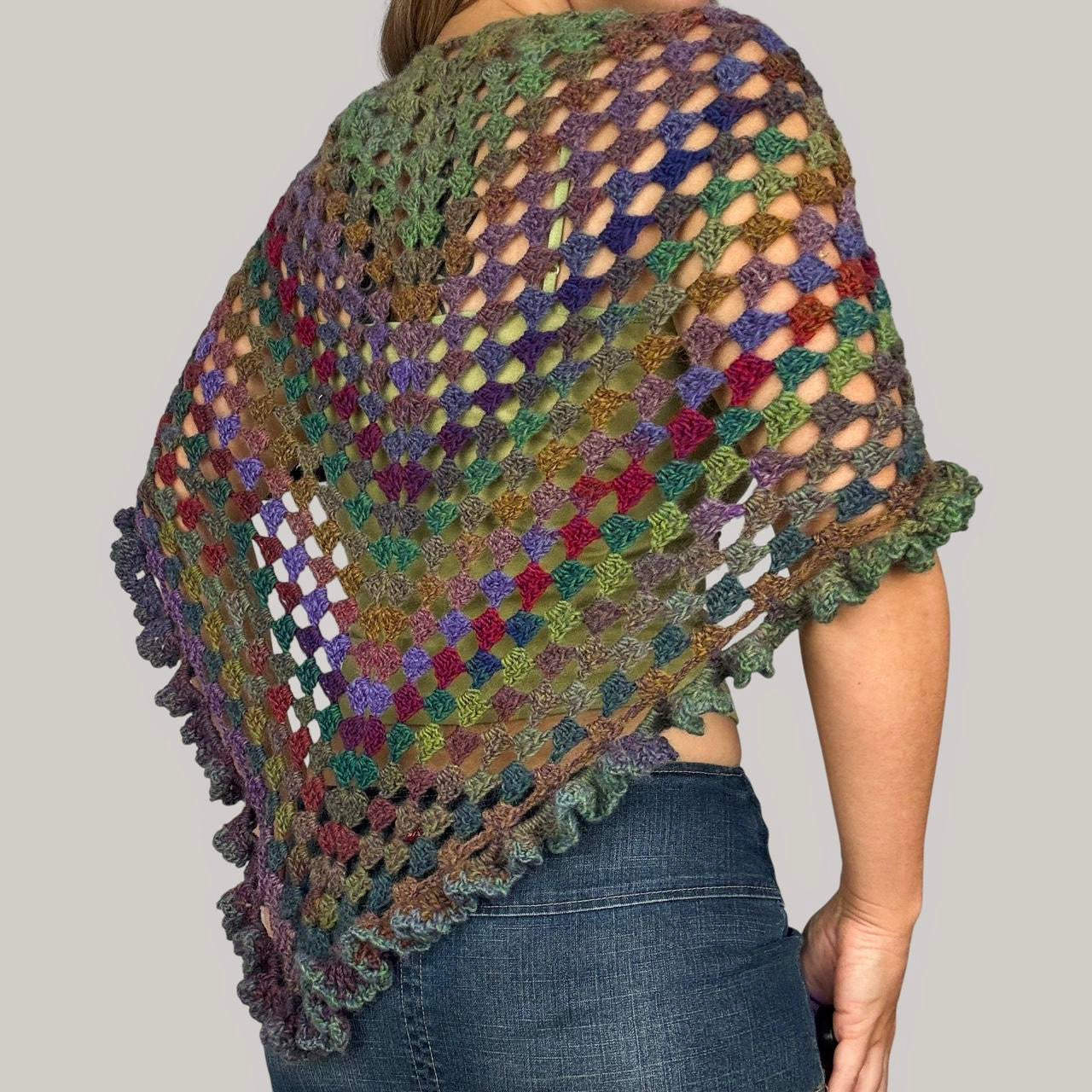 Earthy & colorful vintage crochet wrap with ruffles and tie detail. Can be worn as a shawl, poncho, or sarong. Handmade with a soft, cozy wool knit. No flaws!