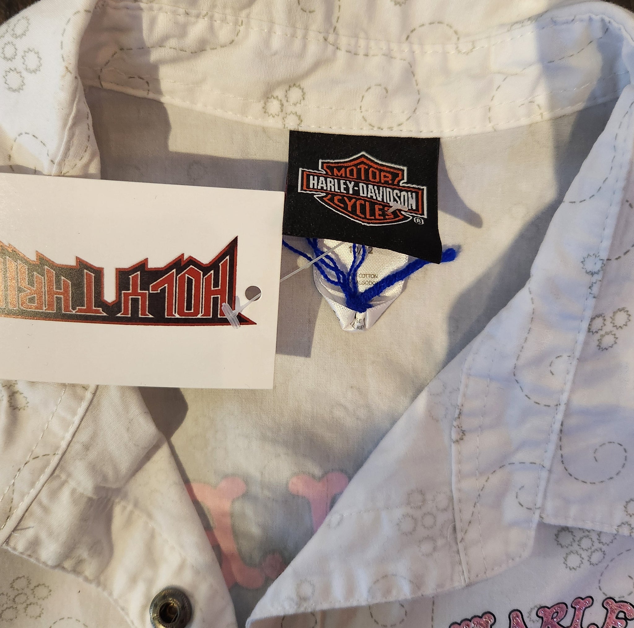 The cutest y2k meets biker girl top. It's a flattering egg shell white with vintage Harley Davison buttons along the center.