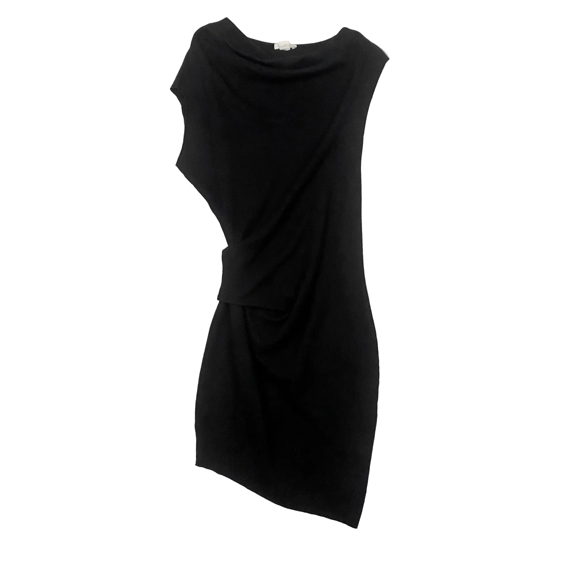 helmut lang black wool asymmetric dress with a drapey neckline and scrunching on the side.