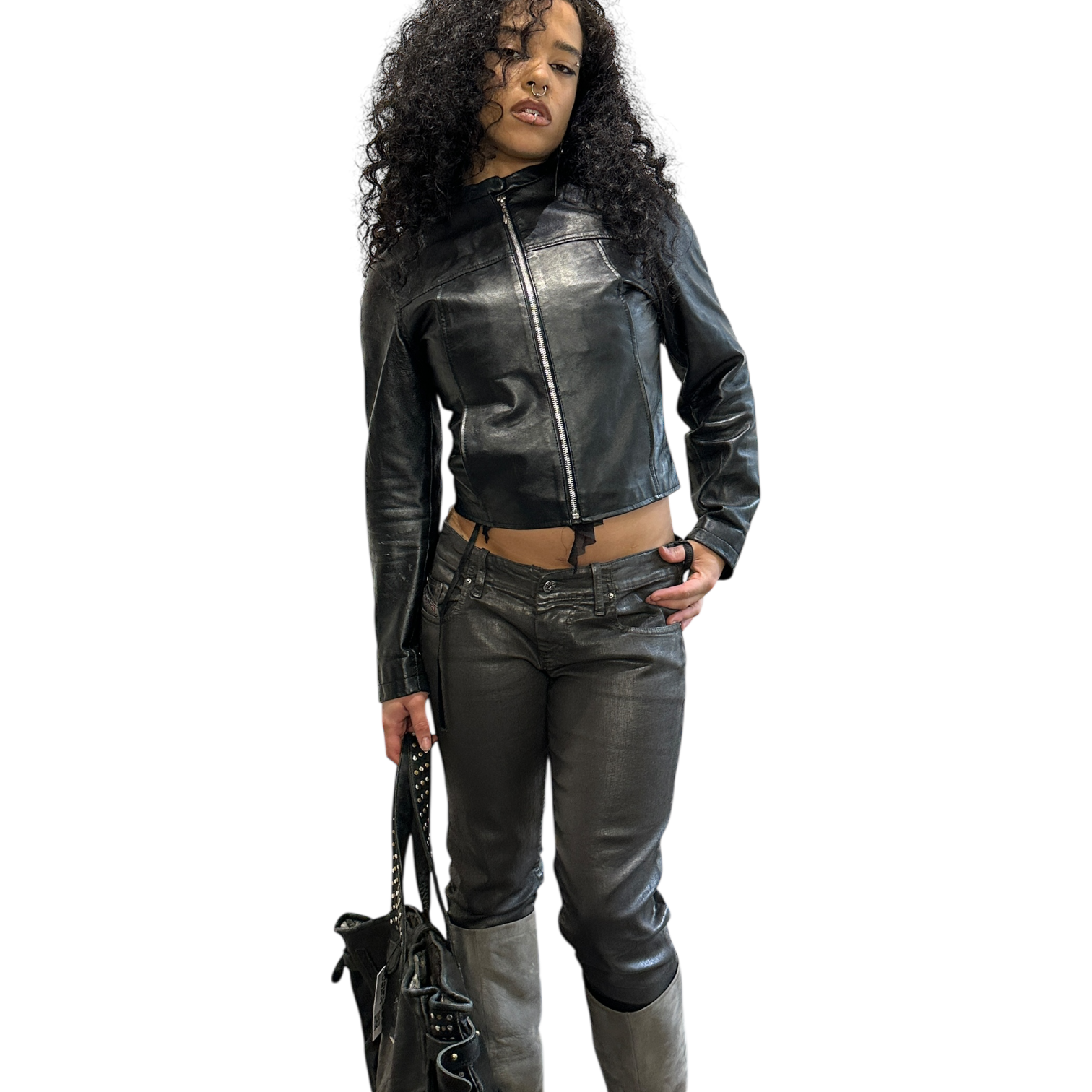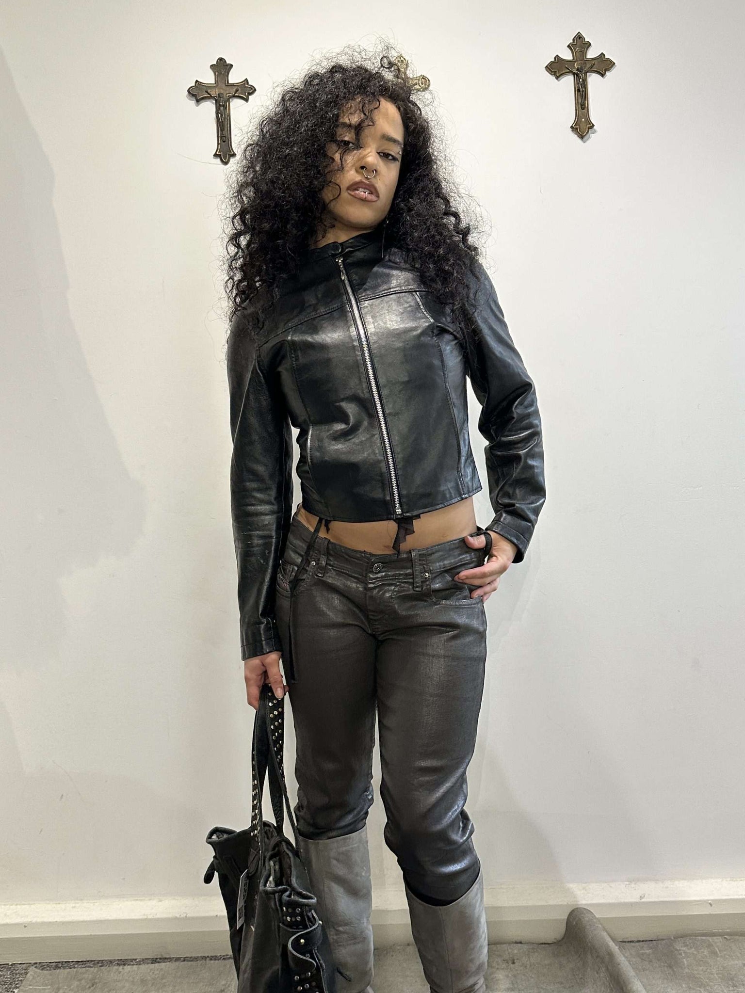 Sexy cropped fitted biker leather jacket