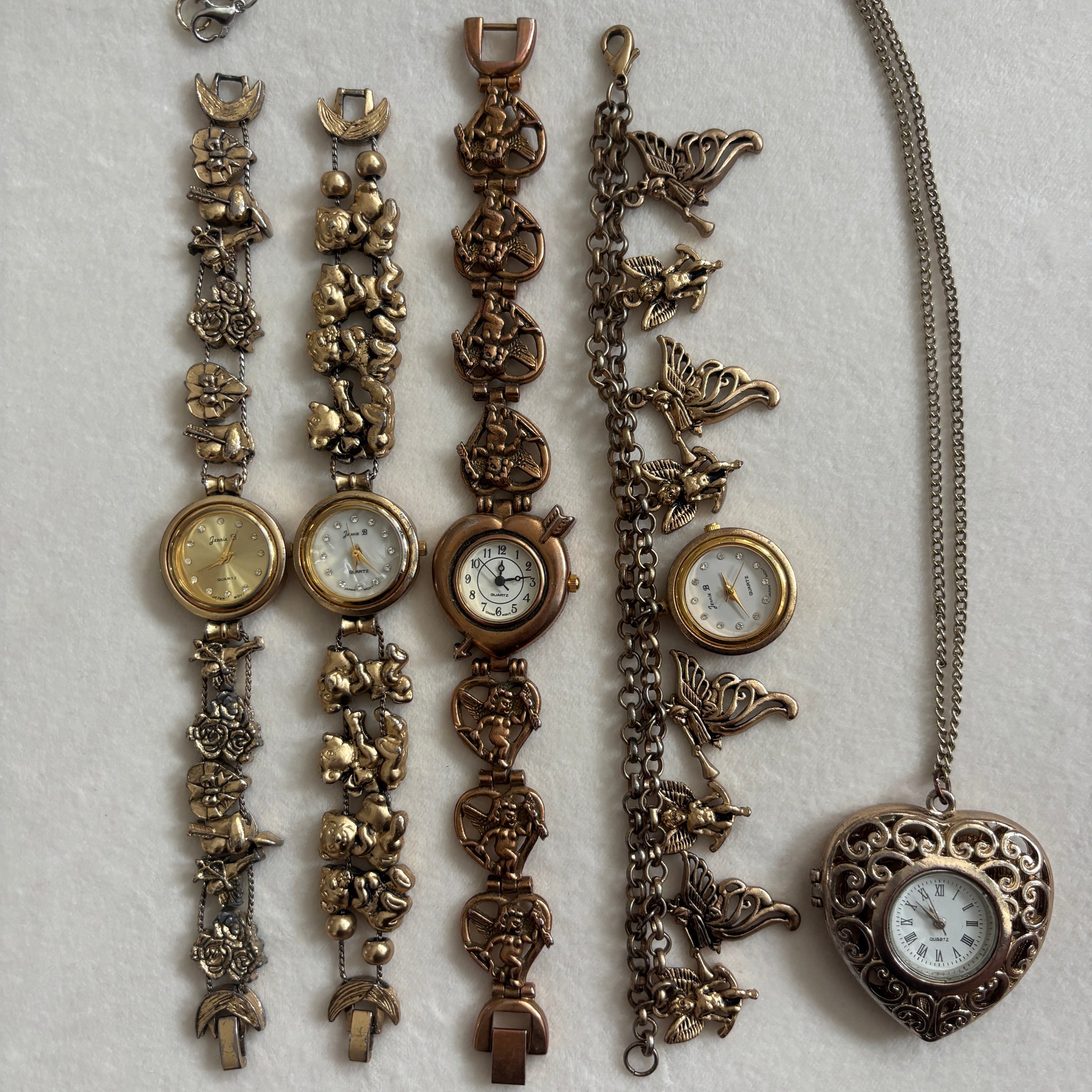 Vintage teddy bear shaped sliding charm watch by Jennie B. Purposefully aged and darkened brushed gold tone with a pearly white shell dial. Adorned with charms picturing teddy bears smelling flowers and holding hearts
