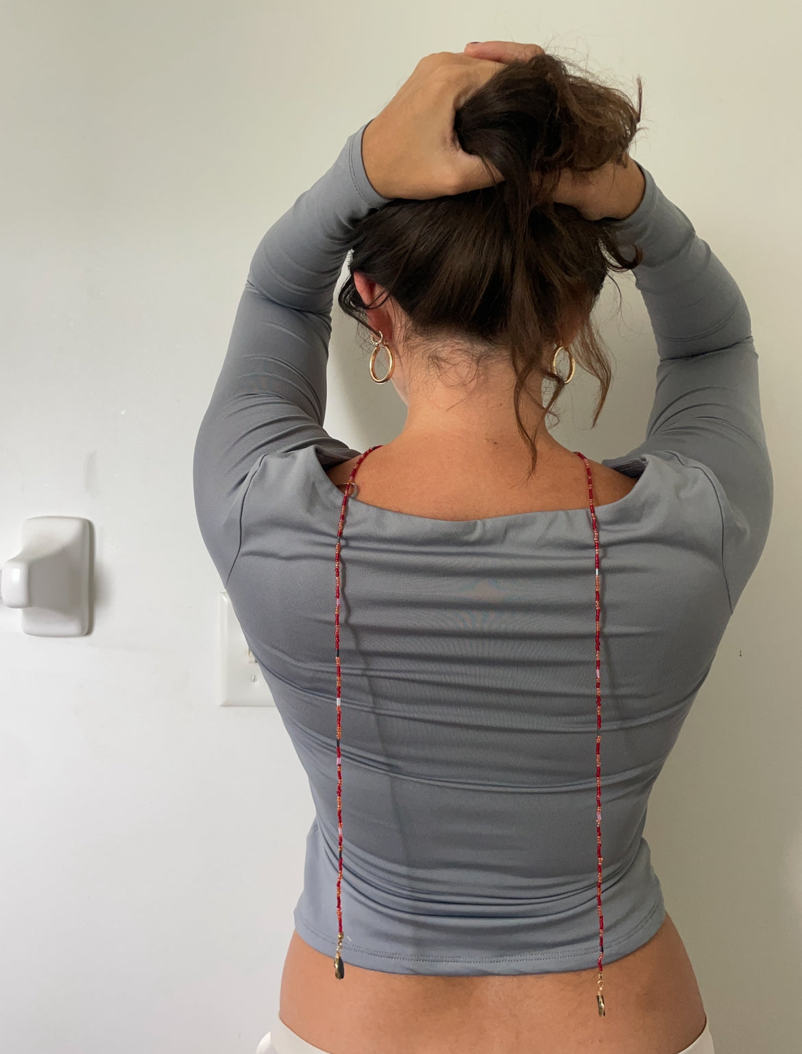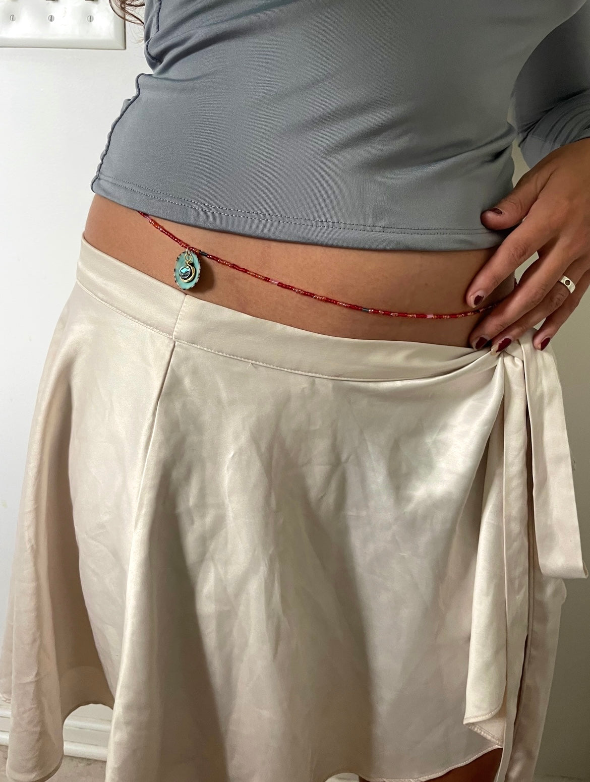 The Mermaid Kiss Necklace Is handcrafted with ruby red glass beads leading to a trio of luminous abalone pearl shells. The center piece is a natural oyster shell with an abalone placed in the center. The blue and green hues of the abalone contrasts so beautifully with the red beaded strand. This necklace can be worn so many ways, which adds to the fun and uniqueness of this necklace.