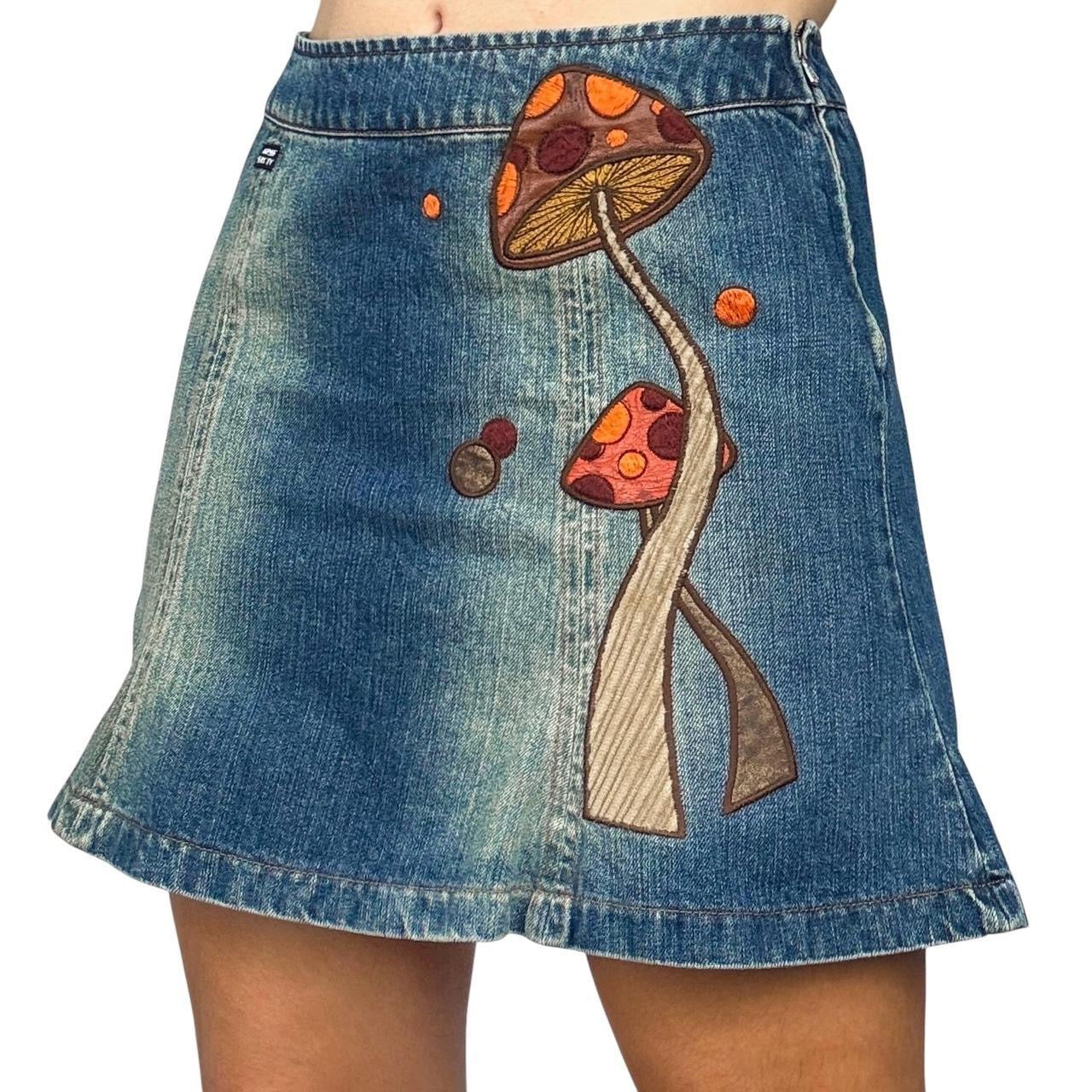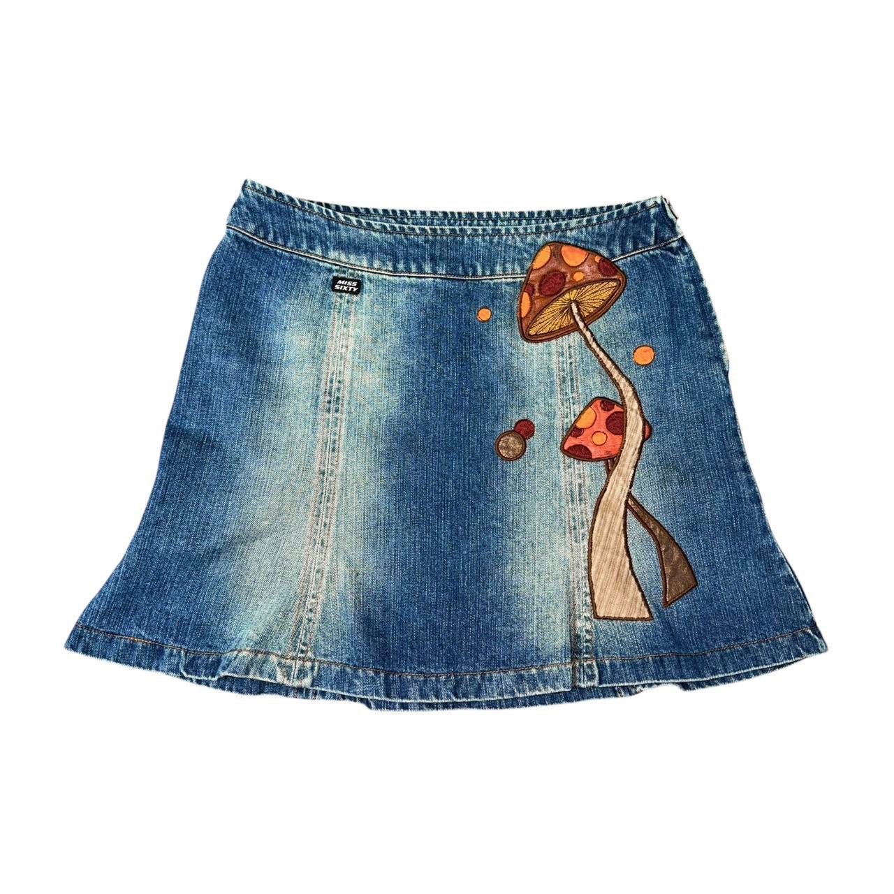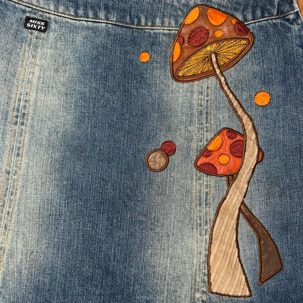 Rare vintage denim skirt by Miss Sixty, featuring a gorgeous embroidered mushroom design. Side zip closure. Great, gently pre-loved condition.