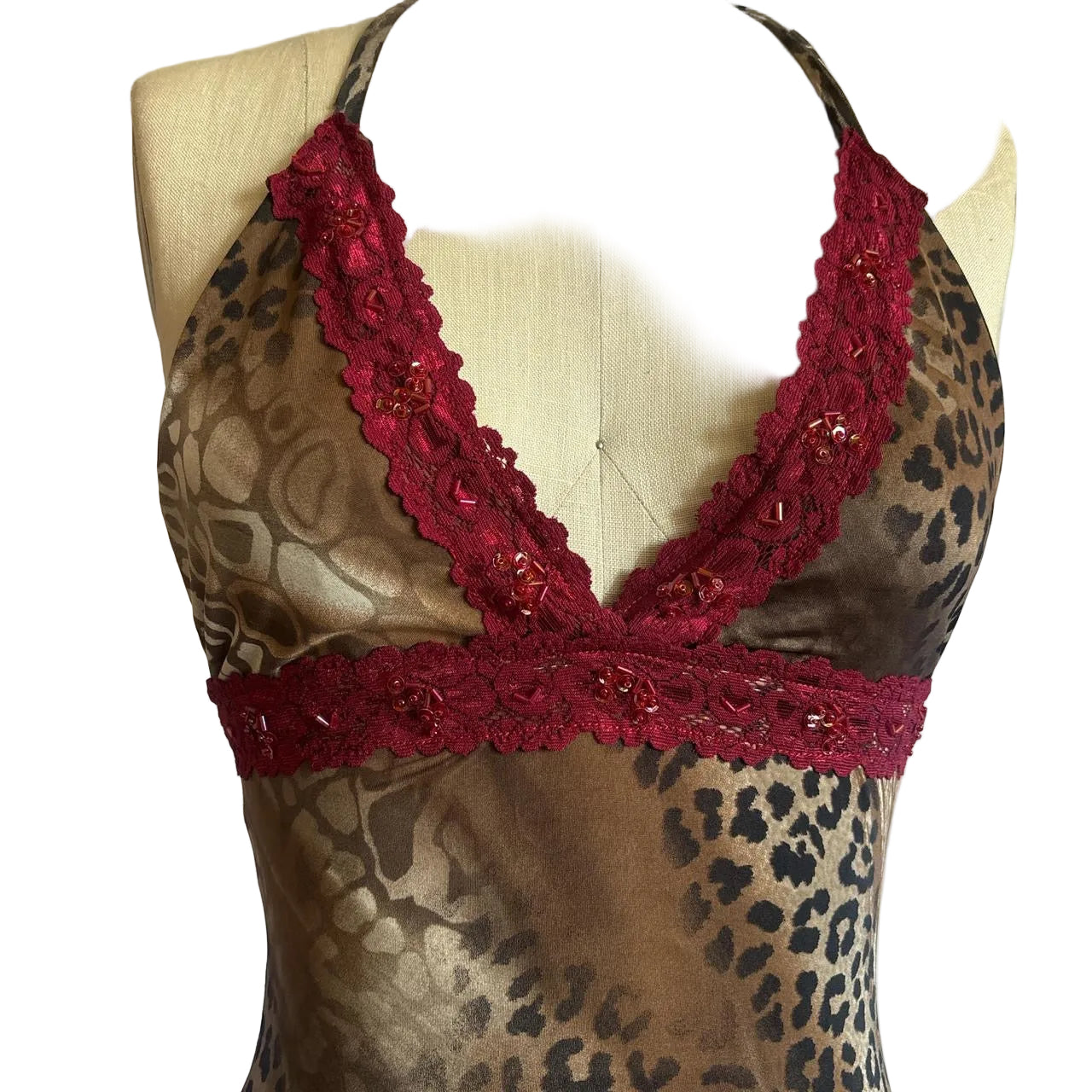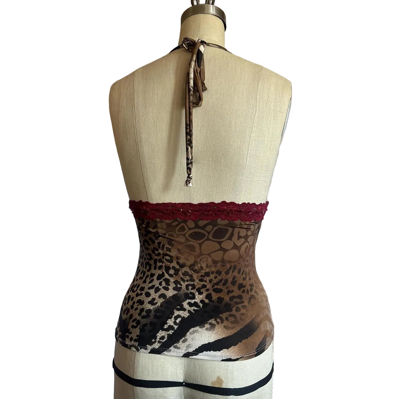 The Naz top has a mix of eccentric animal print and deadstock beaded lace detailing. Perfect for a night out or festival attire.