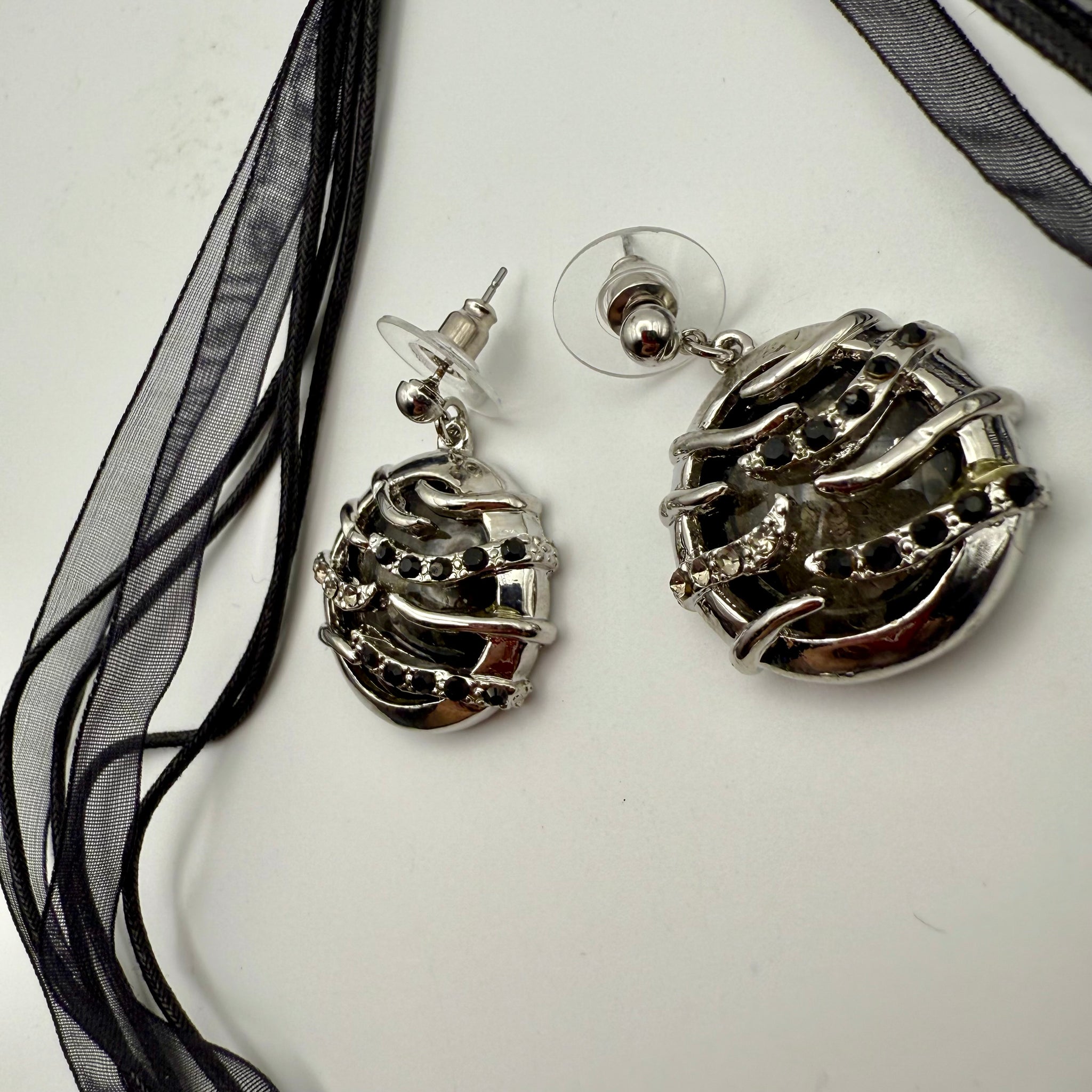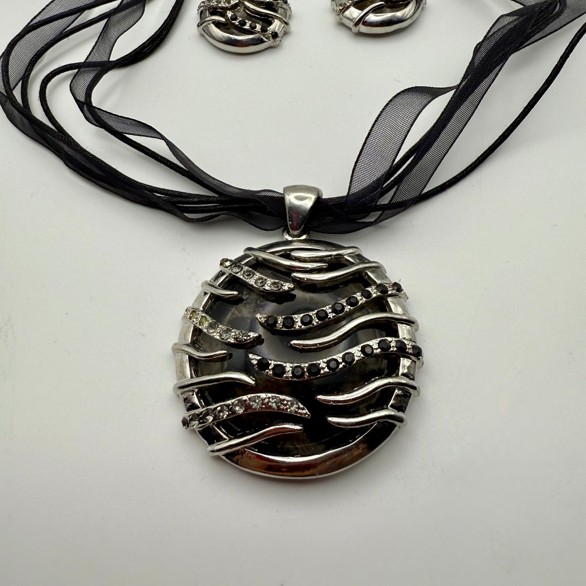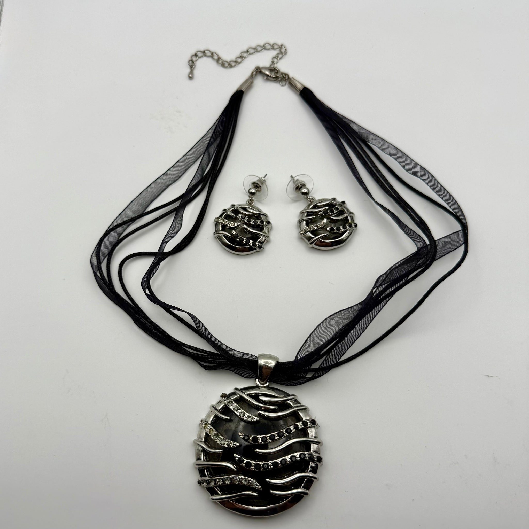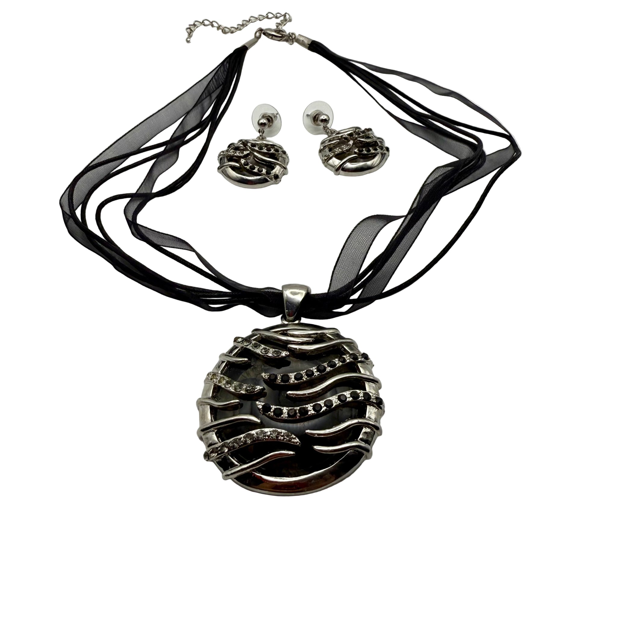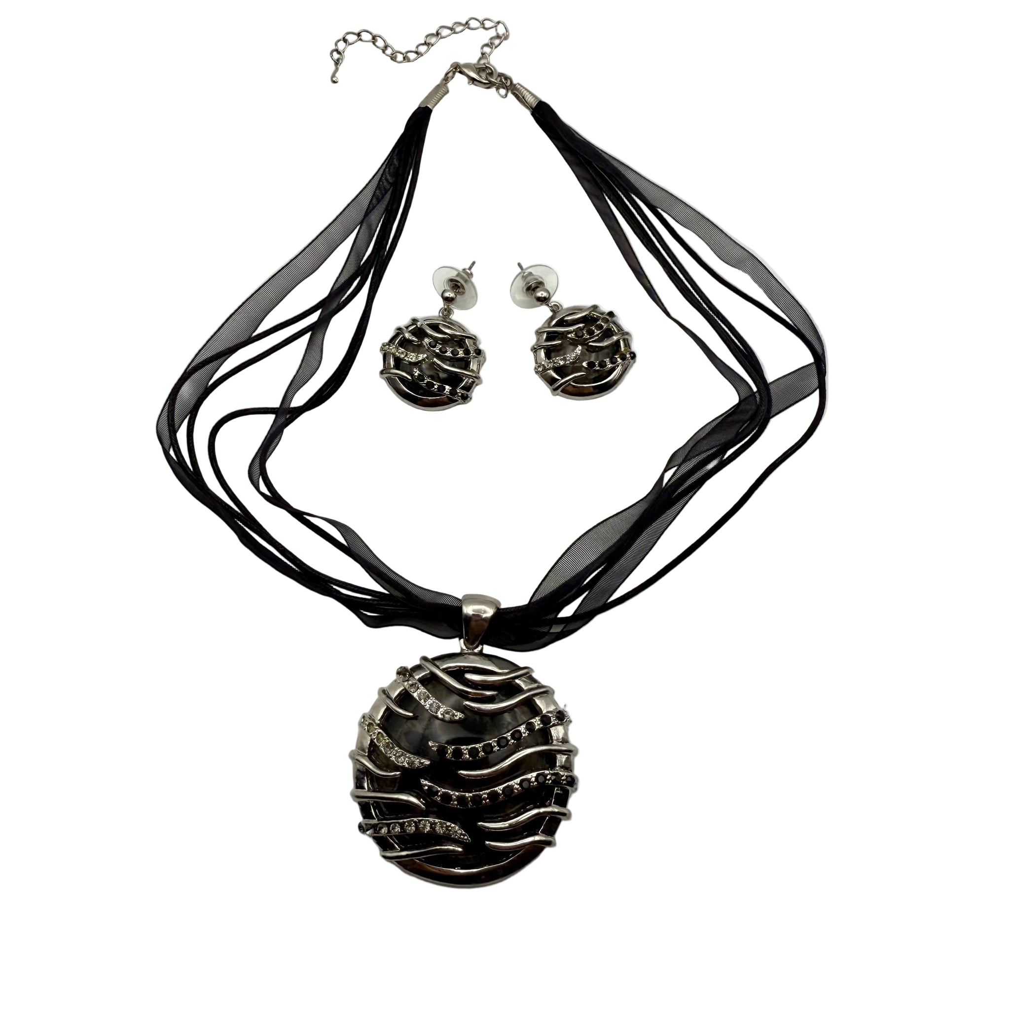 Elegant matching necklace and earrings set featuring a layered black ribbon chain and a round silver-tone wave pendant accented with sparkling rhinestones. The coordinating stud earrings complete the look, making this set perfect for both casual and dressy occasions.