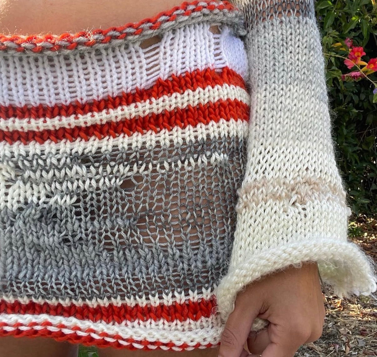 The Mika distressed set includes a halter, mini skirt and bolero sleeves. I played around with different yarn weights and colors to create a one-of a kind look!