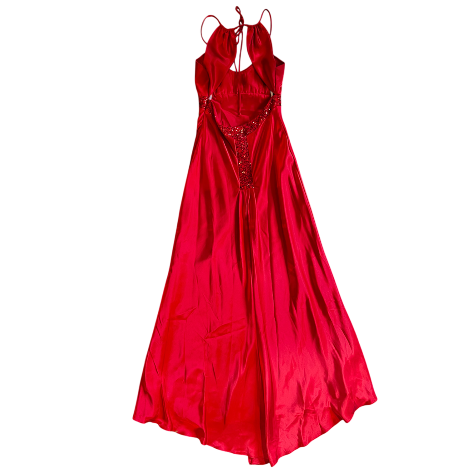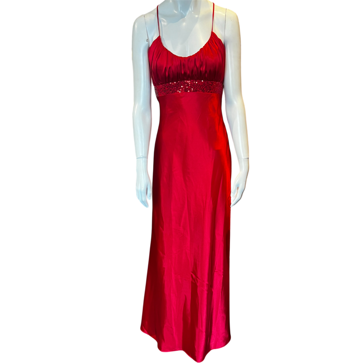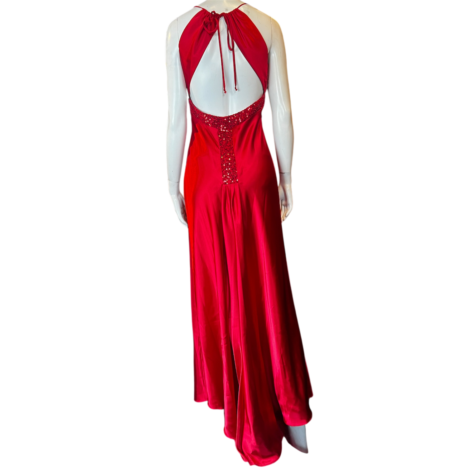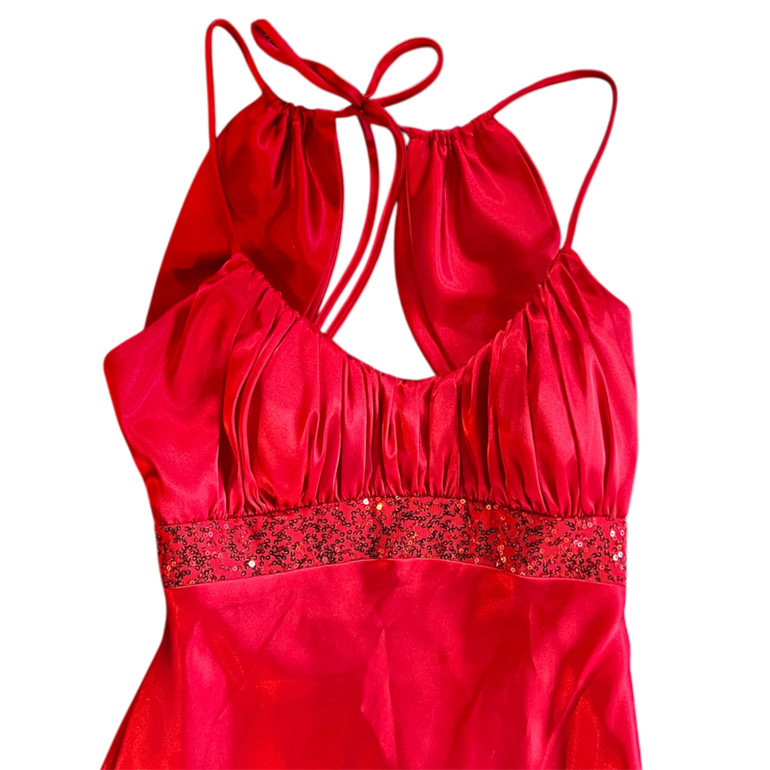 Red satin backless maxi dress with ruched rounded neckline and sequin bust line.