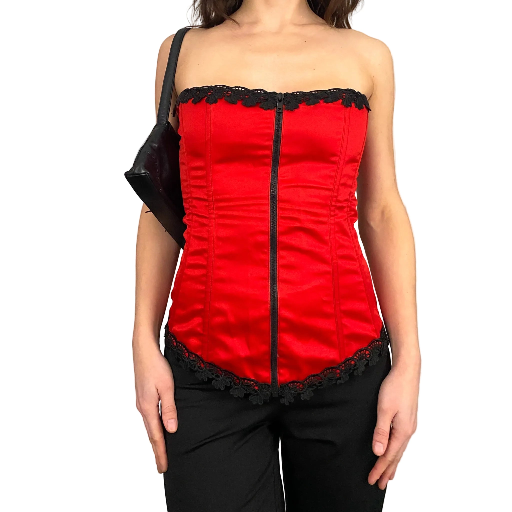 Vintage vampy red and black corset by Shirley of Hollywood. Zip front closure.