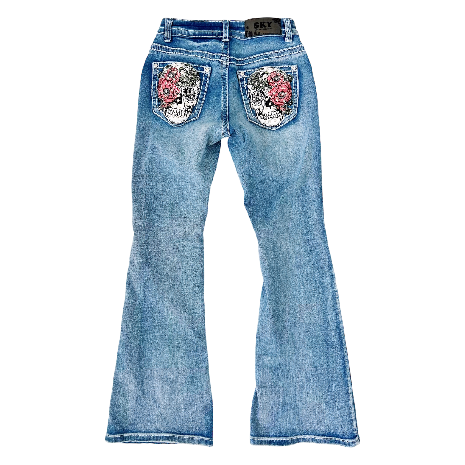 The cutest jeans with rhinestoned/studded embroidered skull details on the booty pockets!