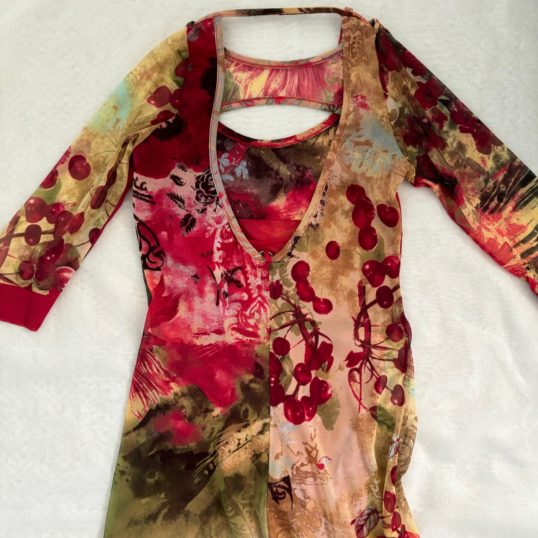 Vintage Save the Queen floral cherry fruit print mesh top with built in bolero