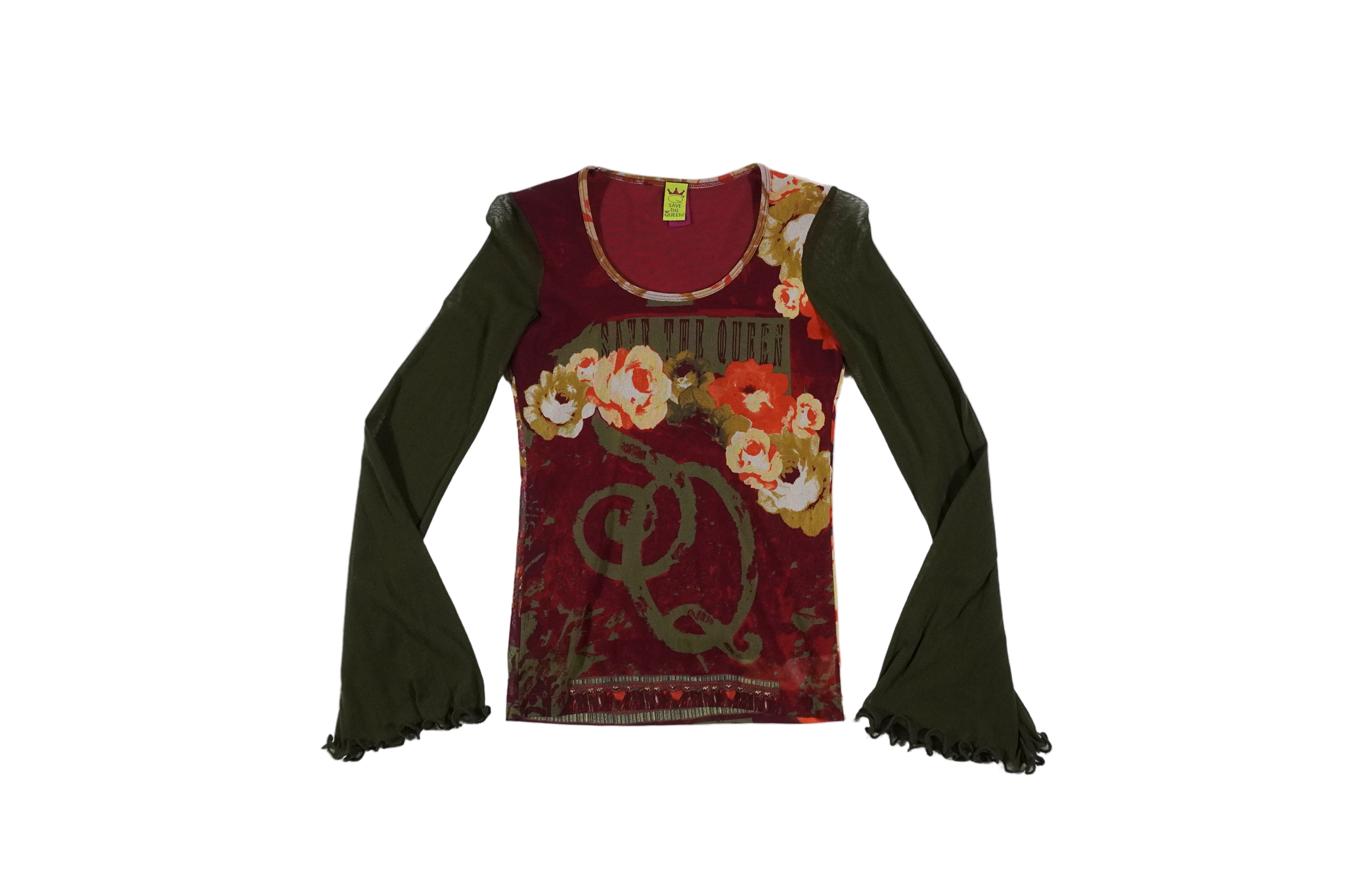Insane Save The Queen floral print with a queen on the back bell sleeves and round neck top.