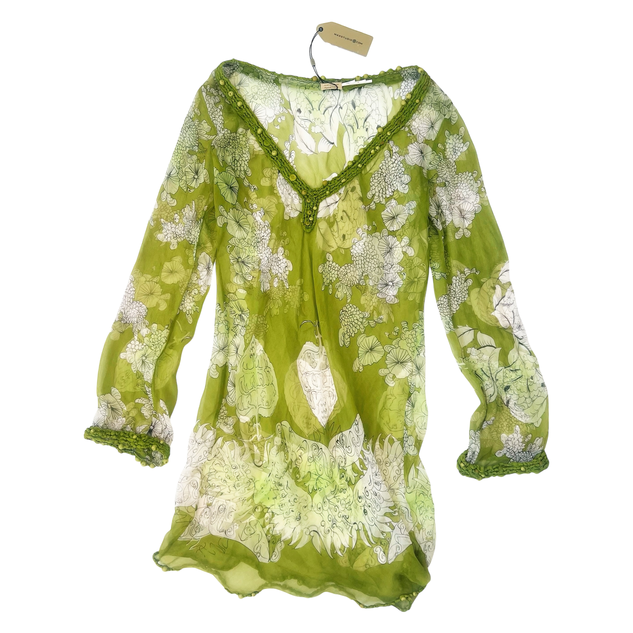 New with original tag attached! Sheer 100% silk lime green floral longsleeve mini dress with beaded details.