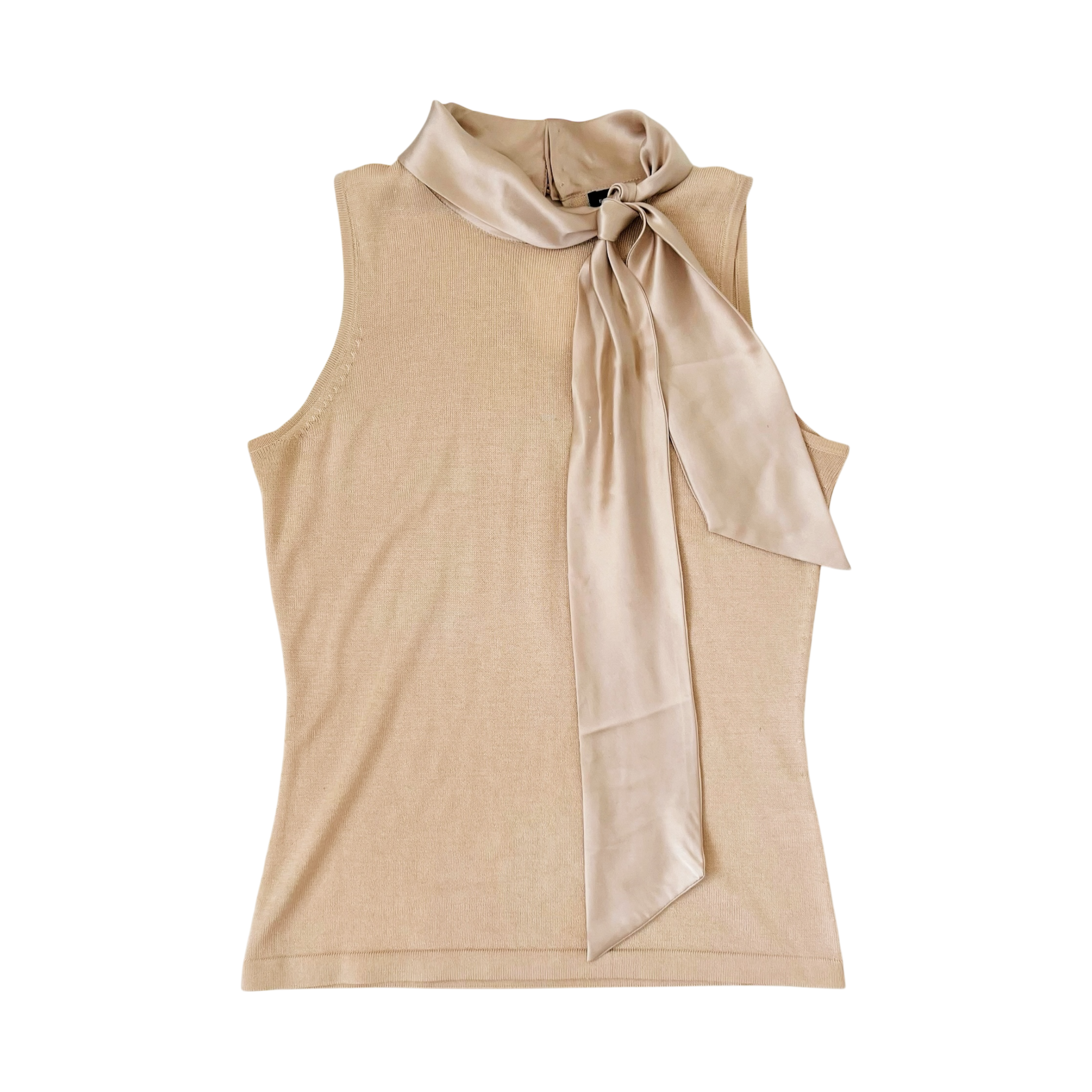Silk/cashmere knit sleeveless top with a beautiful attached silk tie detail!