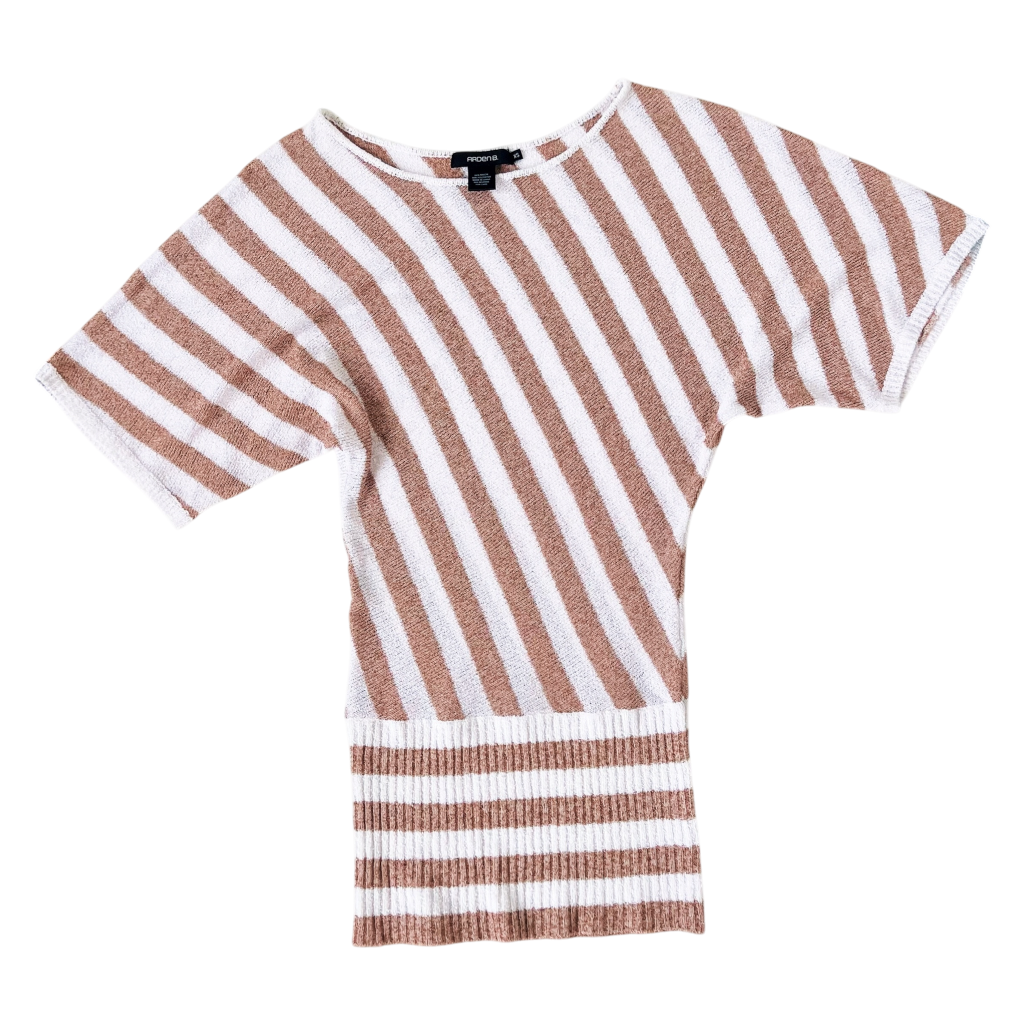 Early 2000s light brown + white striped slouchy off the shoulder mini dress!