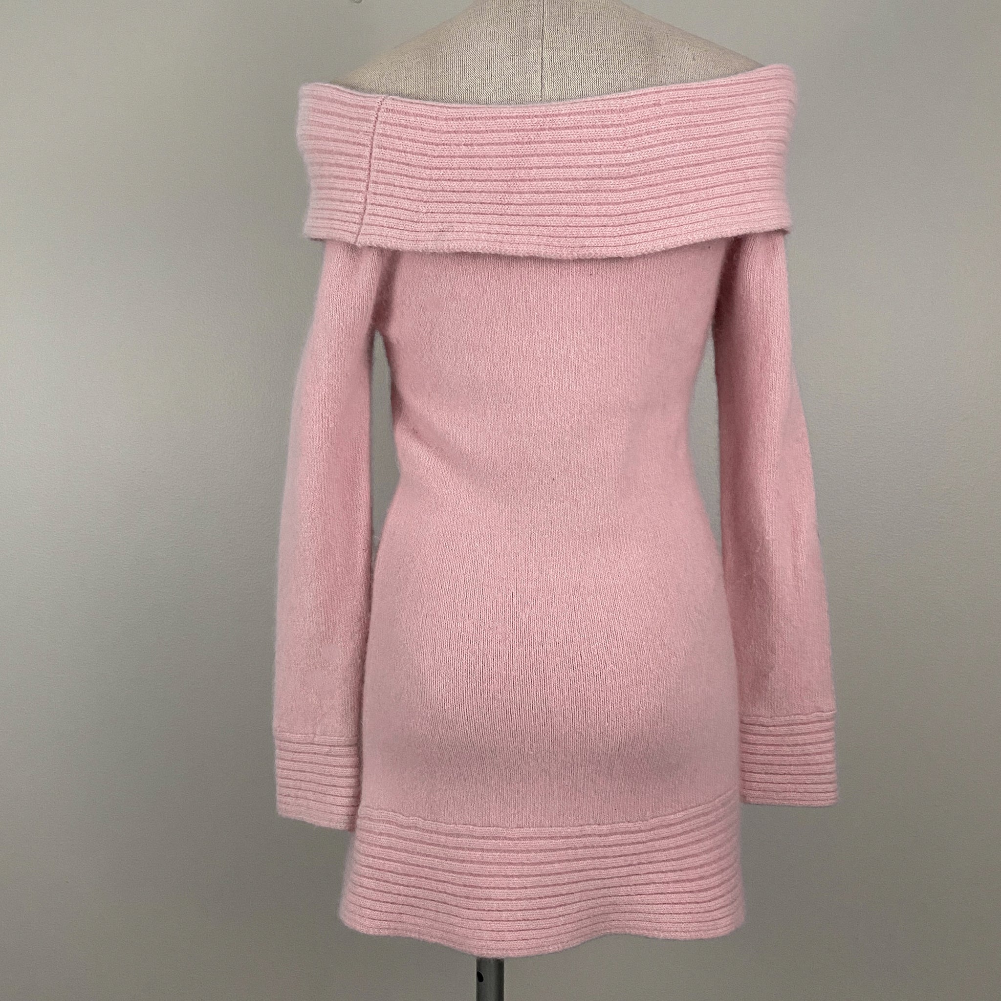 buttery soft baby pink mini sweater dress. off the shoulder neckline.