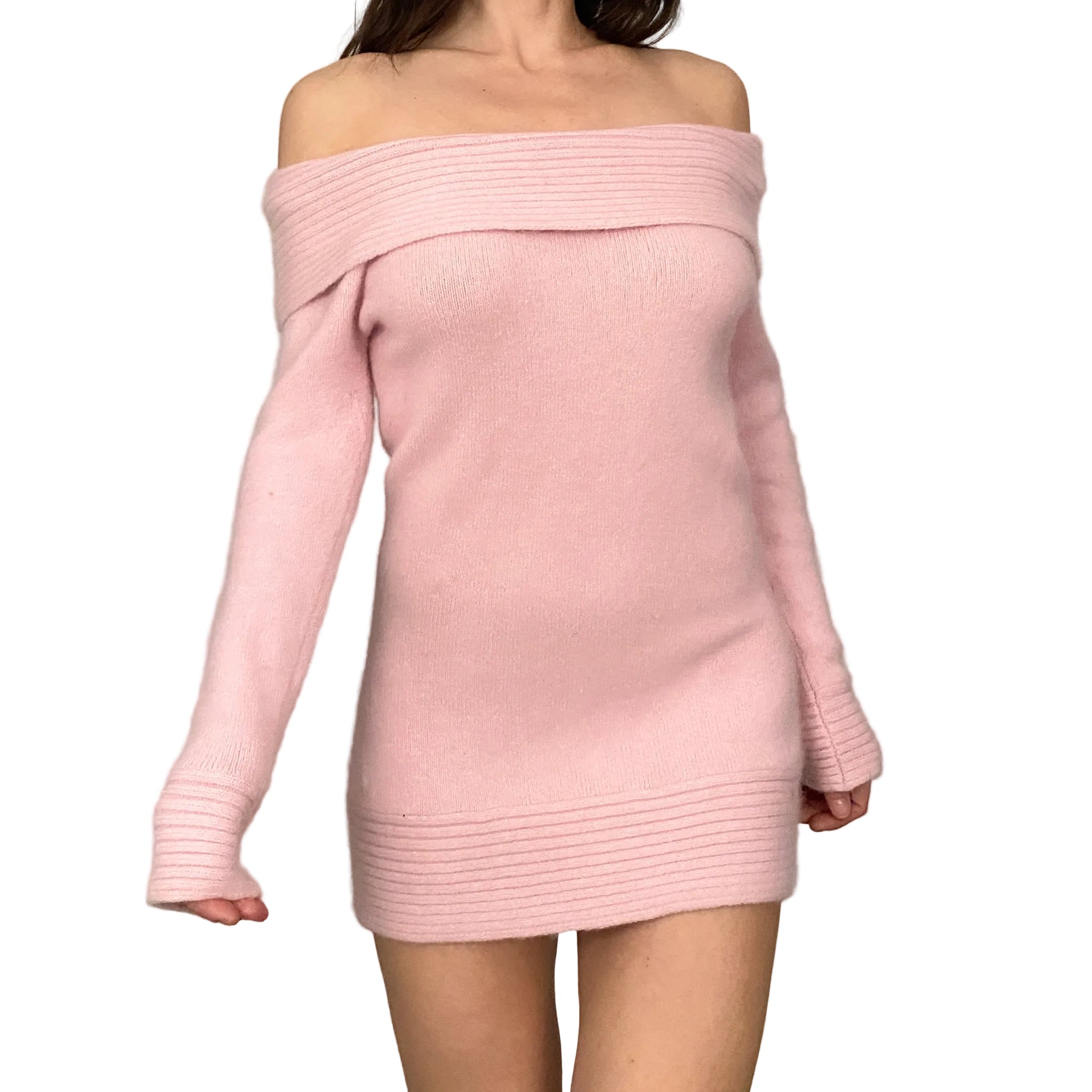 buttery soft baby pink mini sweater dress. off the shoulder neckline.