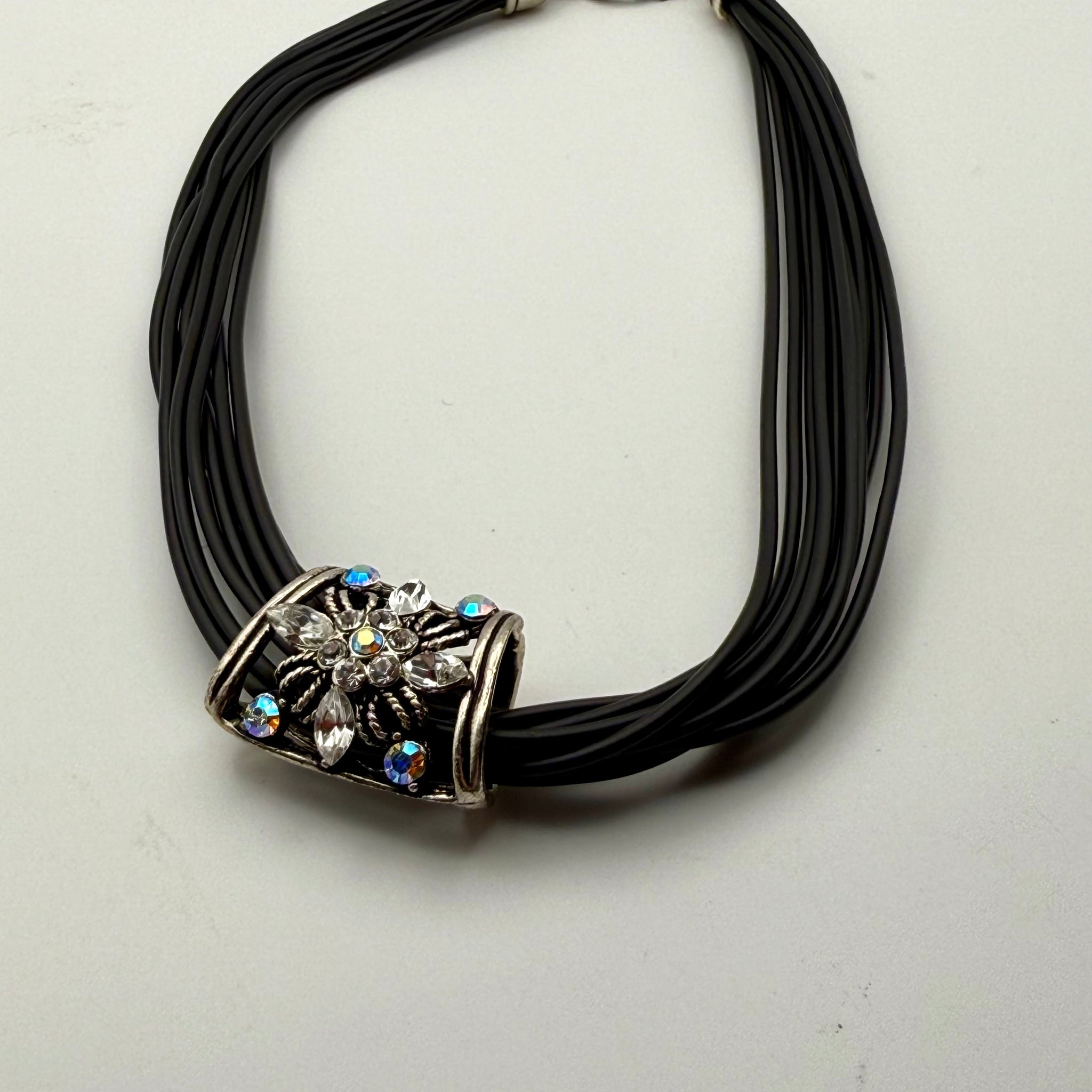 A bold multi-strand black choker featuring a silver-tone floral pendant accented with clear and iridescent crystals. Stylish, lightweight, and perfect for adding a touch of shine to any outfit.