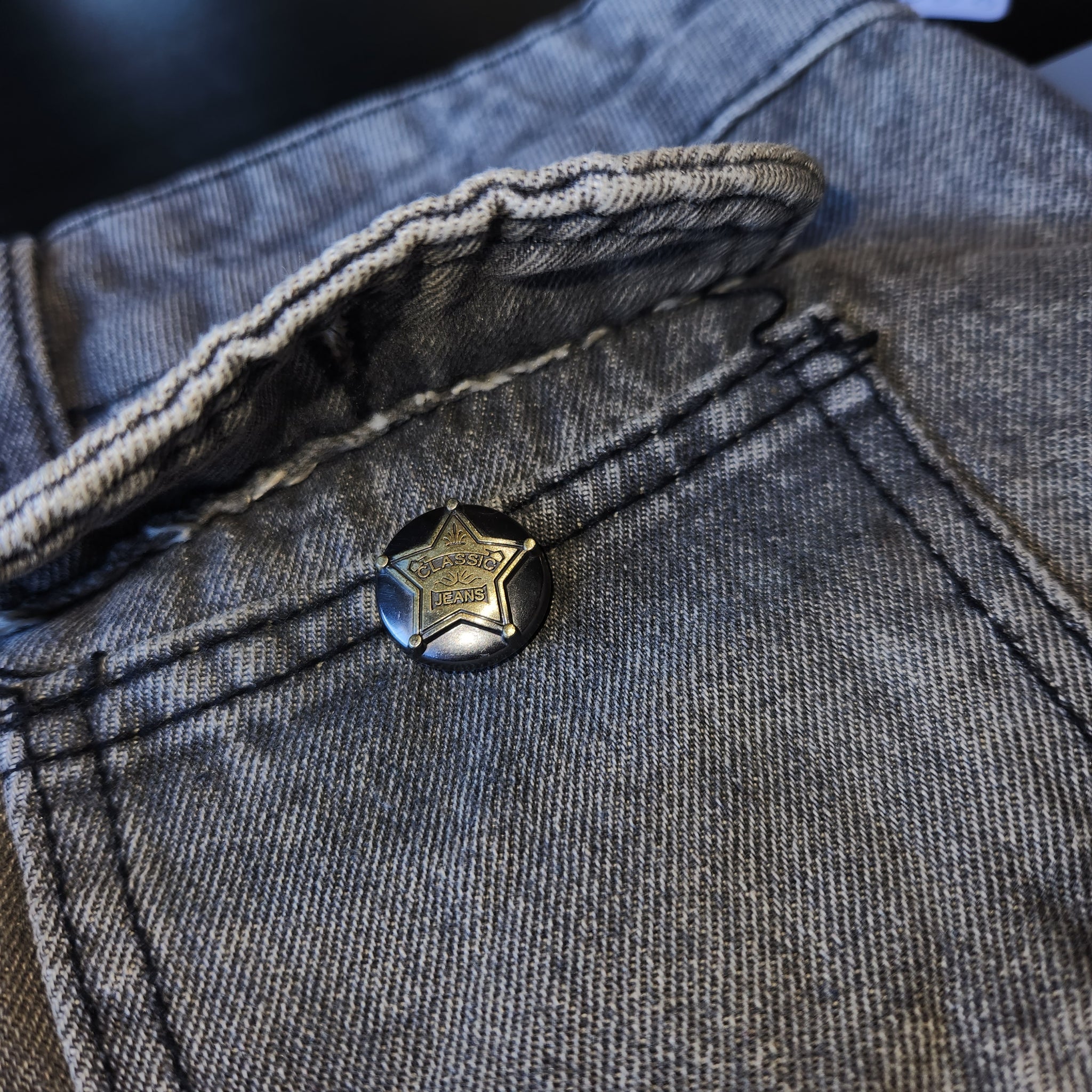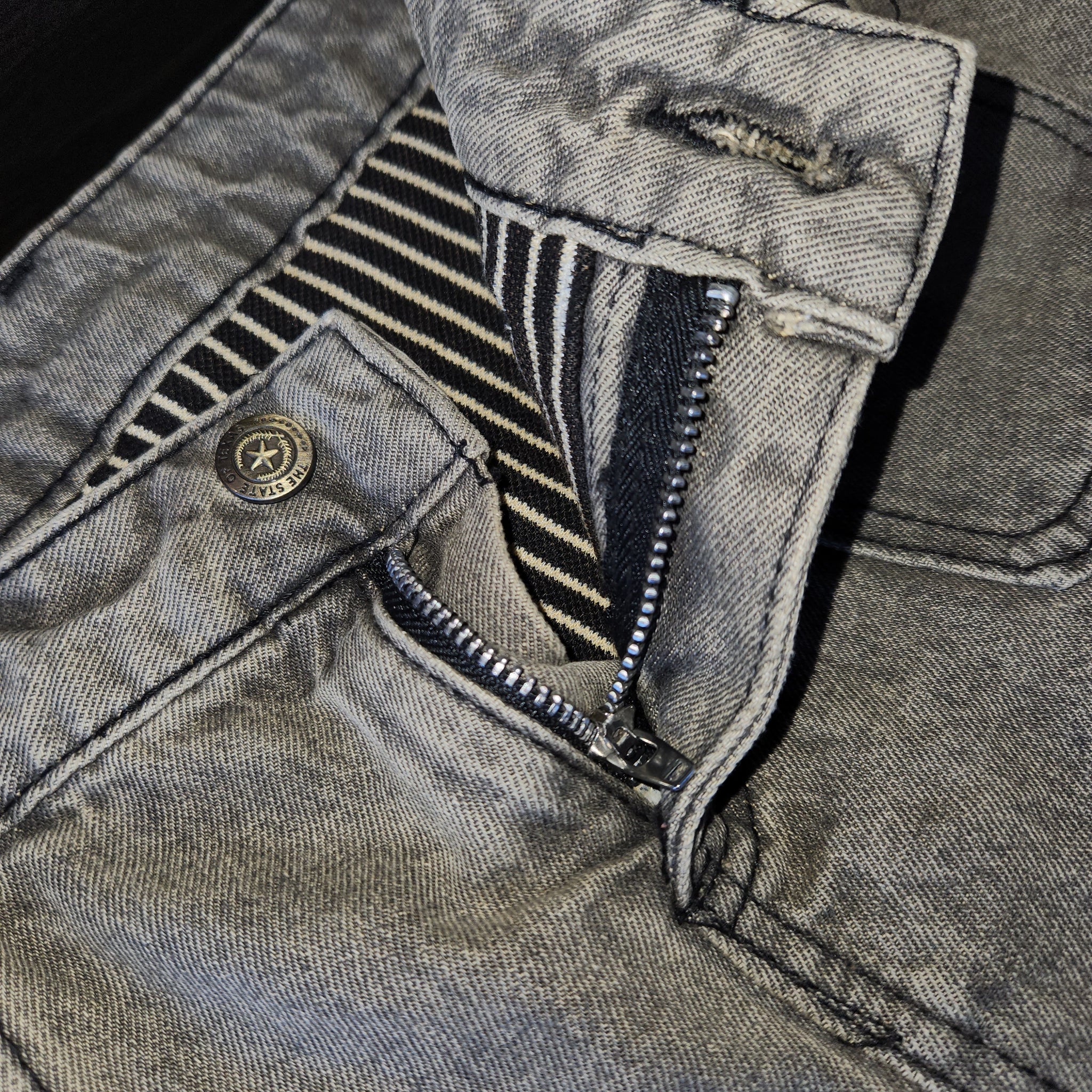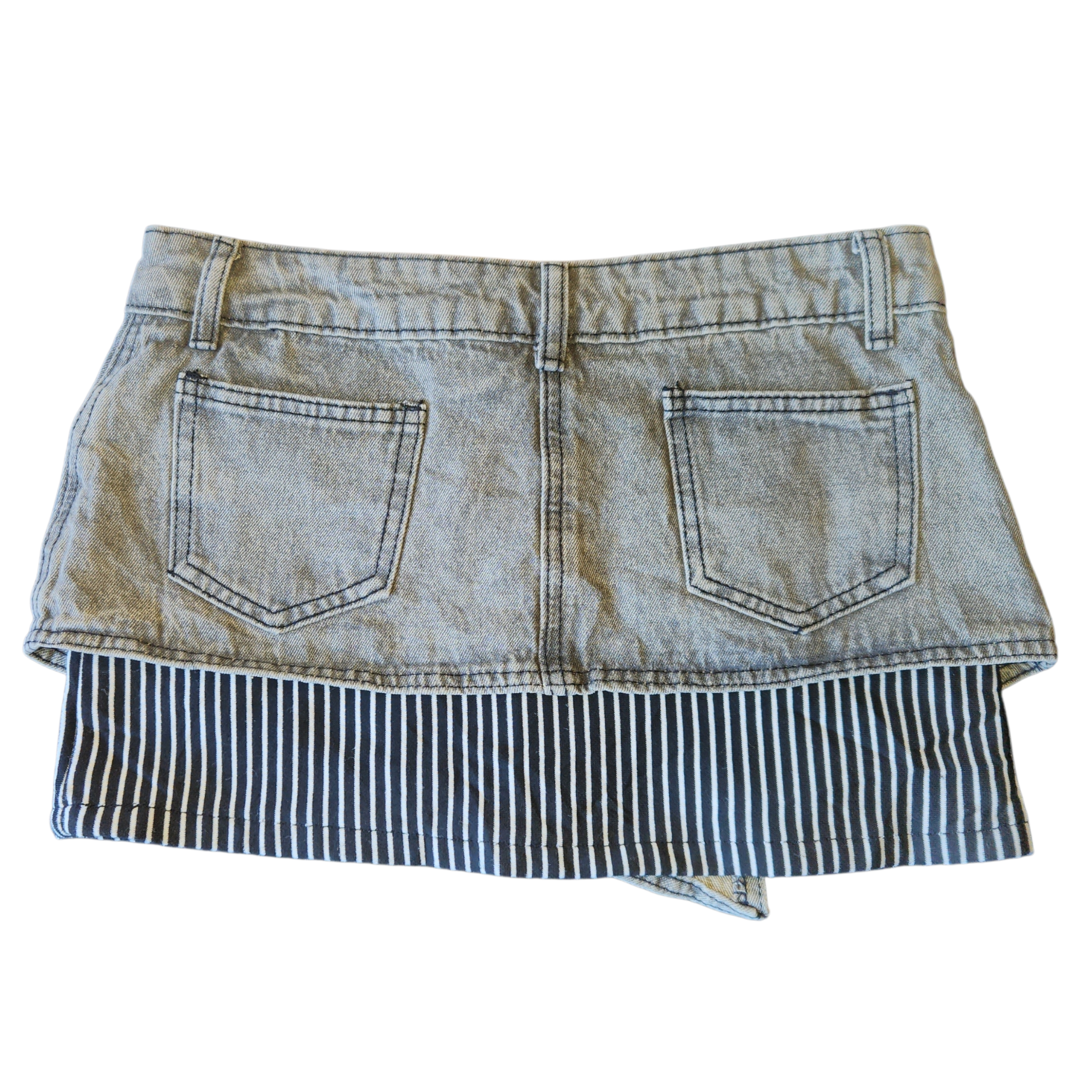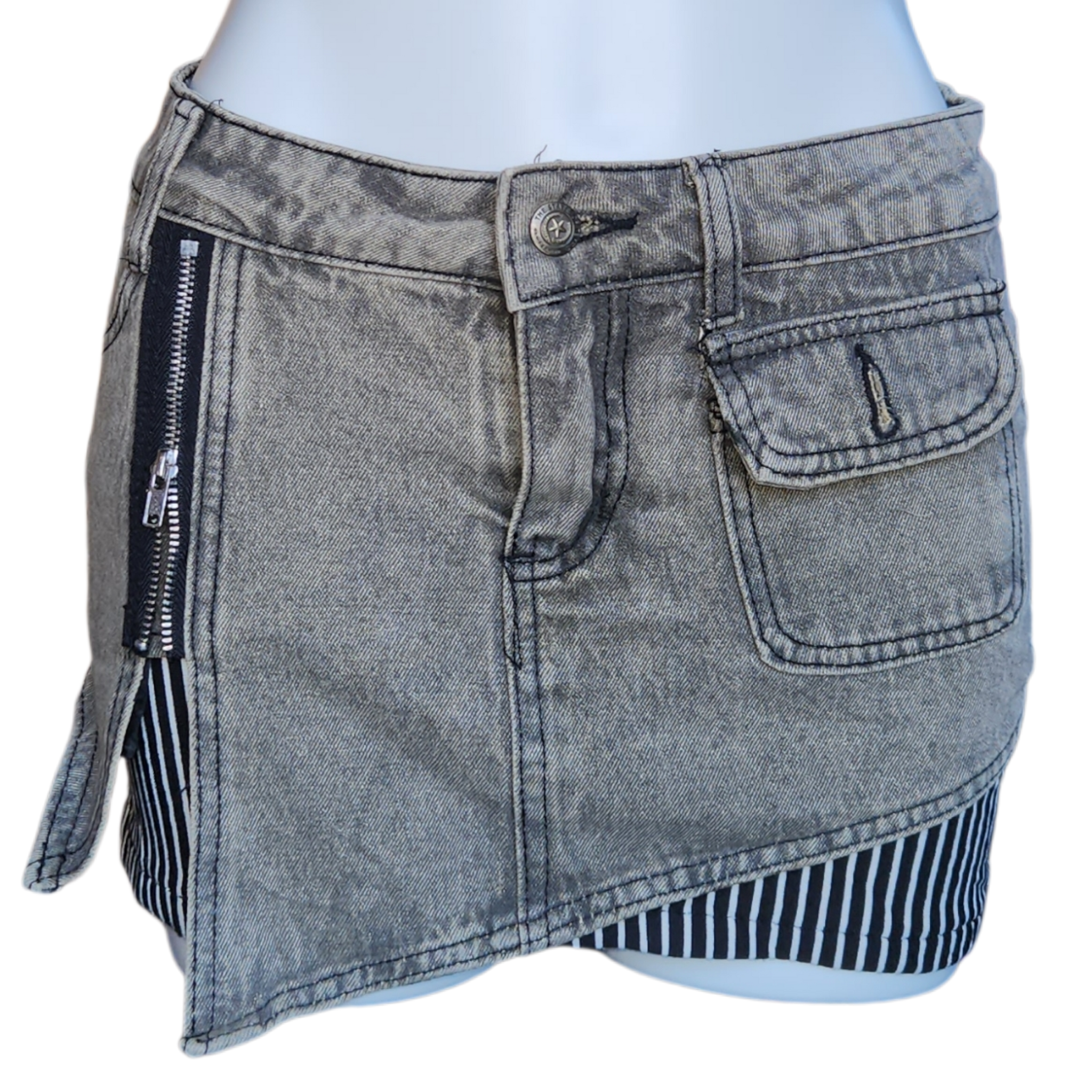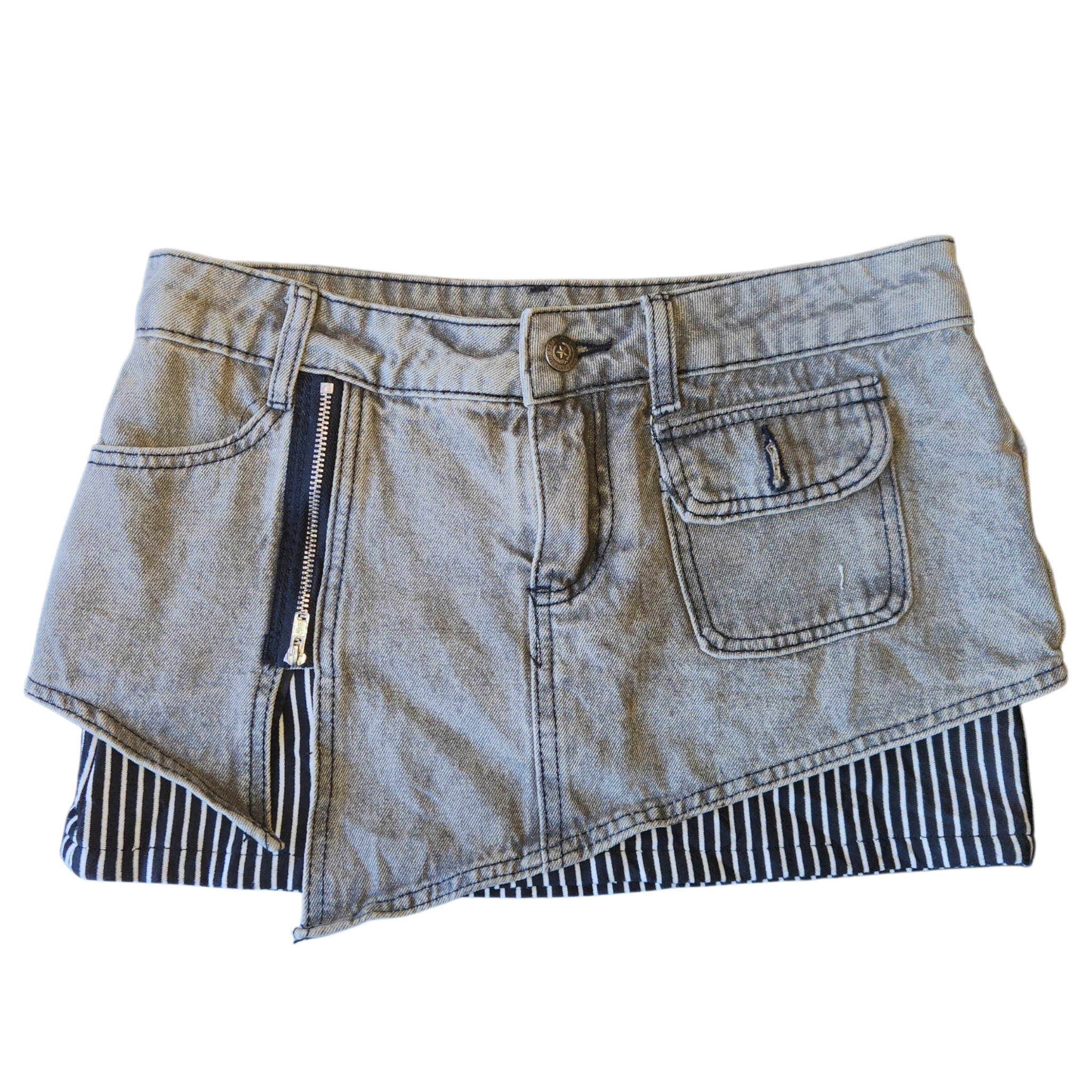 Duel fabric mini skirt by Classic Jeans. Cool grey denim with an asymmetrical hem line shows a pinstripe layer underneath.