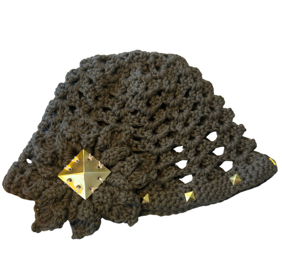 Handmade studded crochet beanie. Olive green yarn x gold color way. Super cute stud trim.