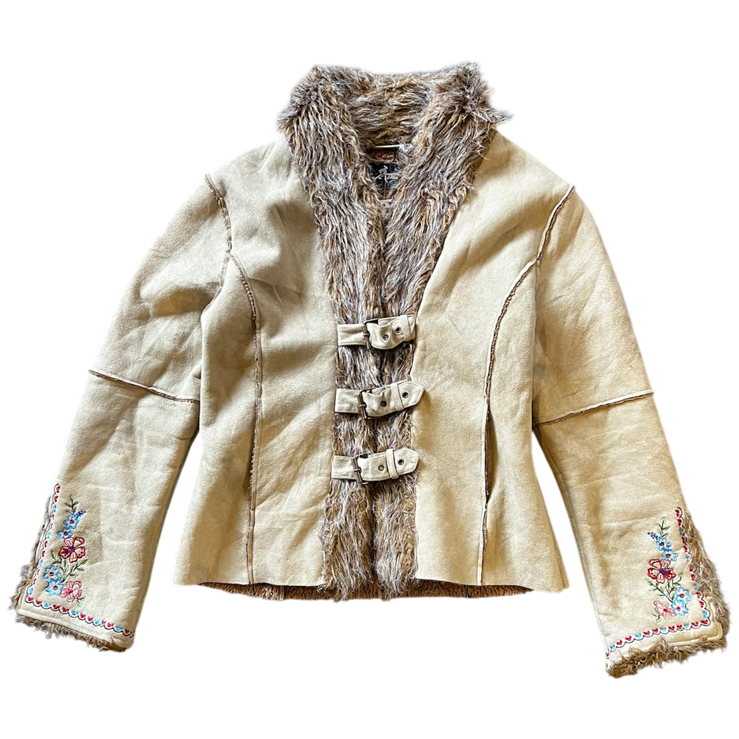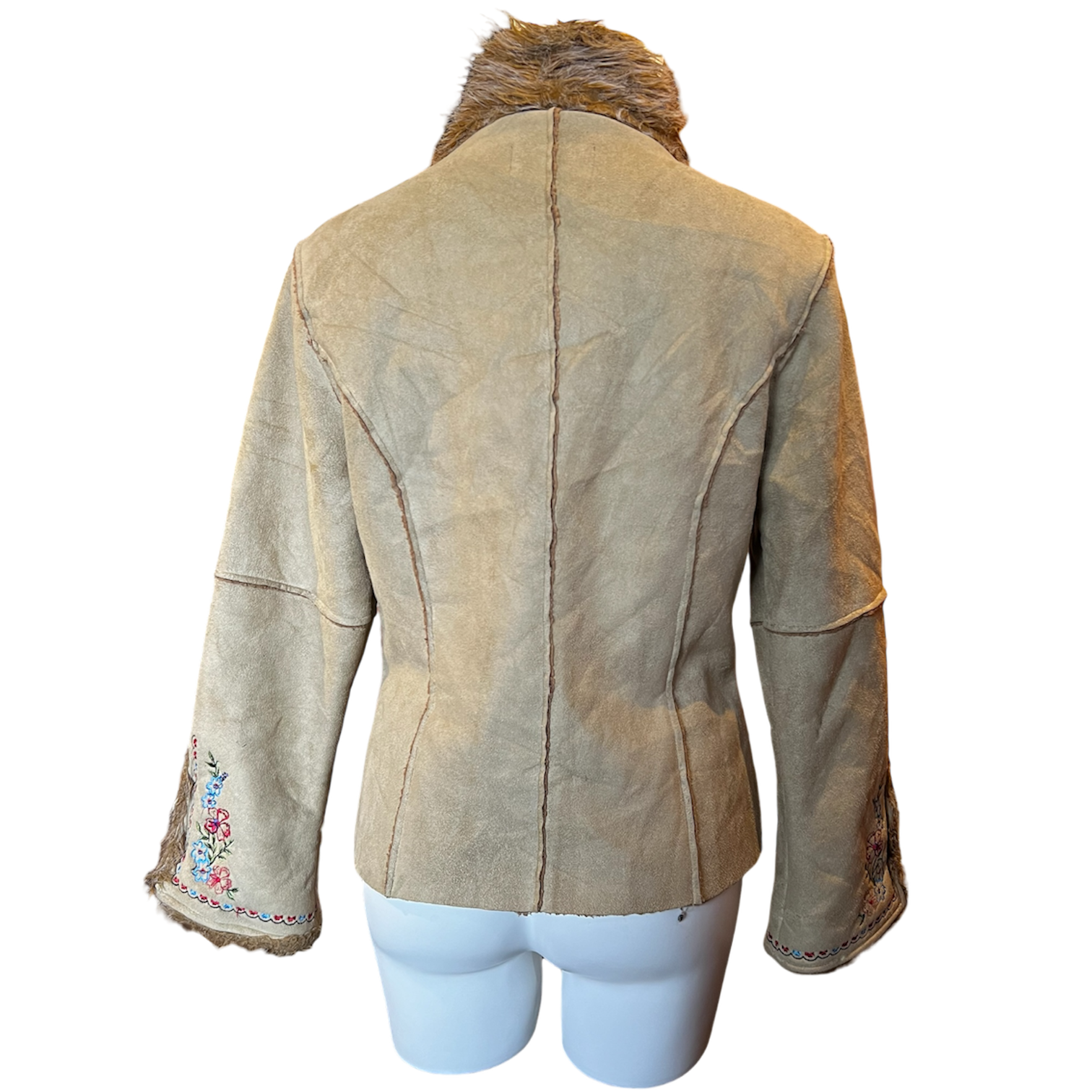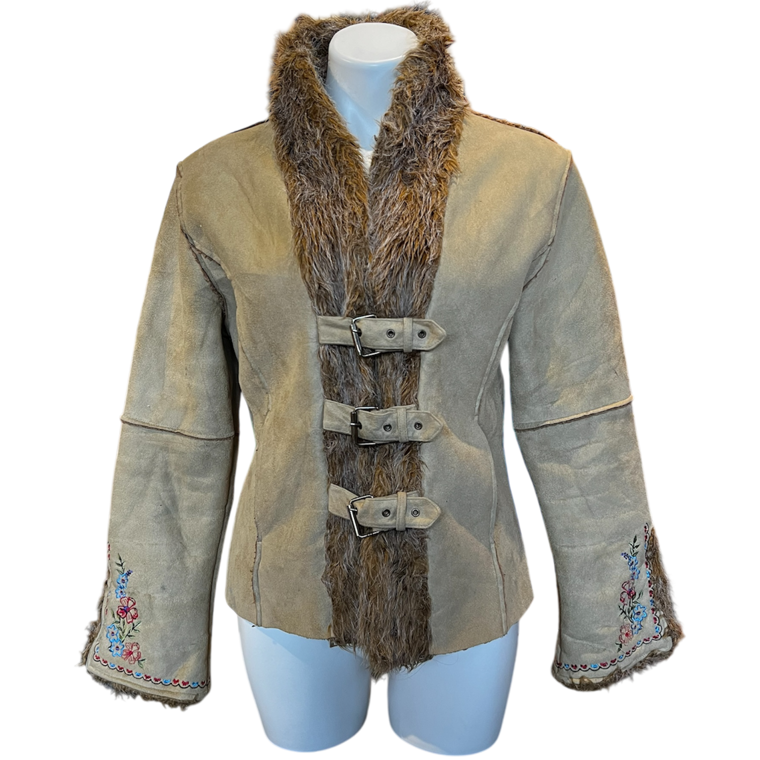 Light brown suede jacket with faux fur and floral embroidered sleeves. Buckle front closure and fleece inner lining.