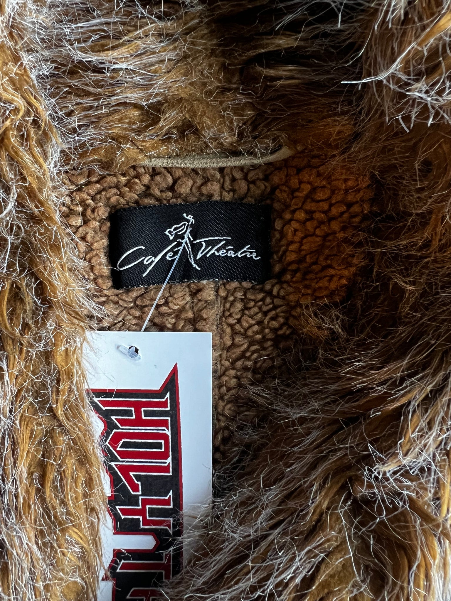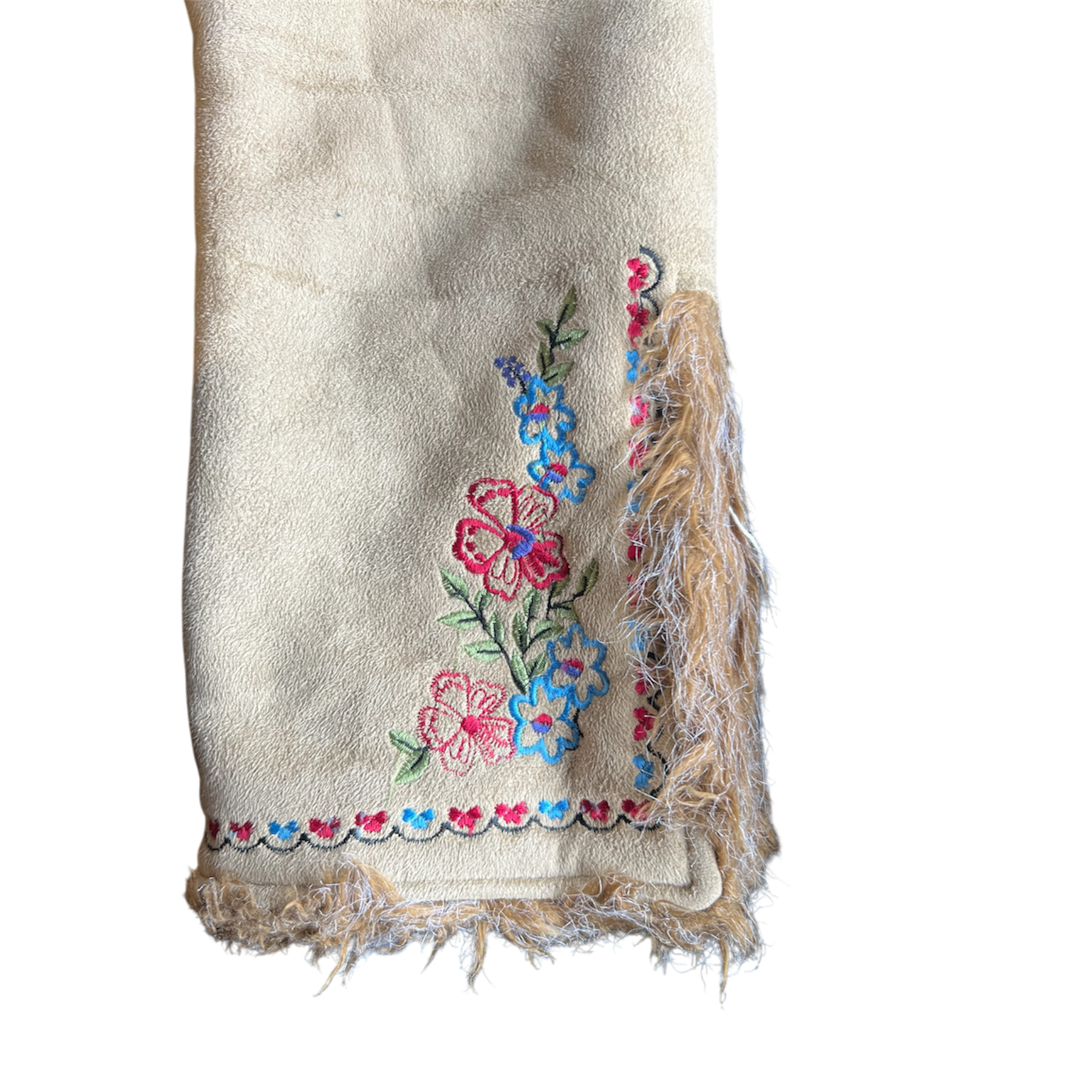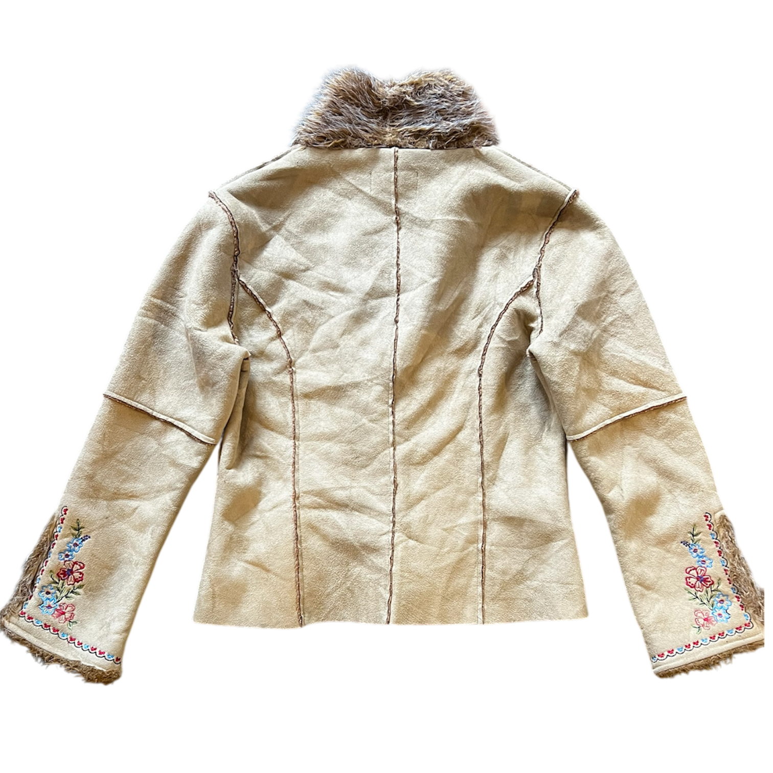 Light brown suede jacket with faux fur and floral embroidered sleeves. Buckle front closure and fleece inner lining.