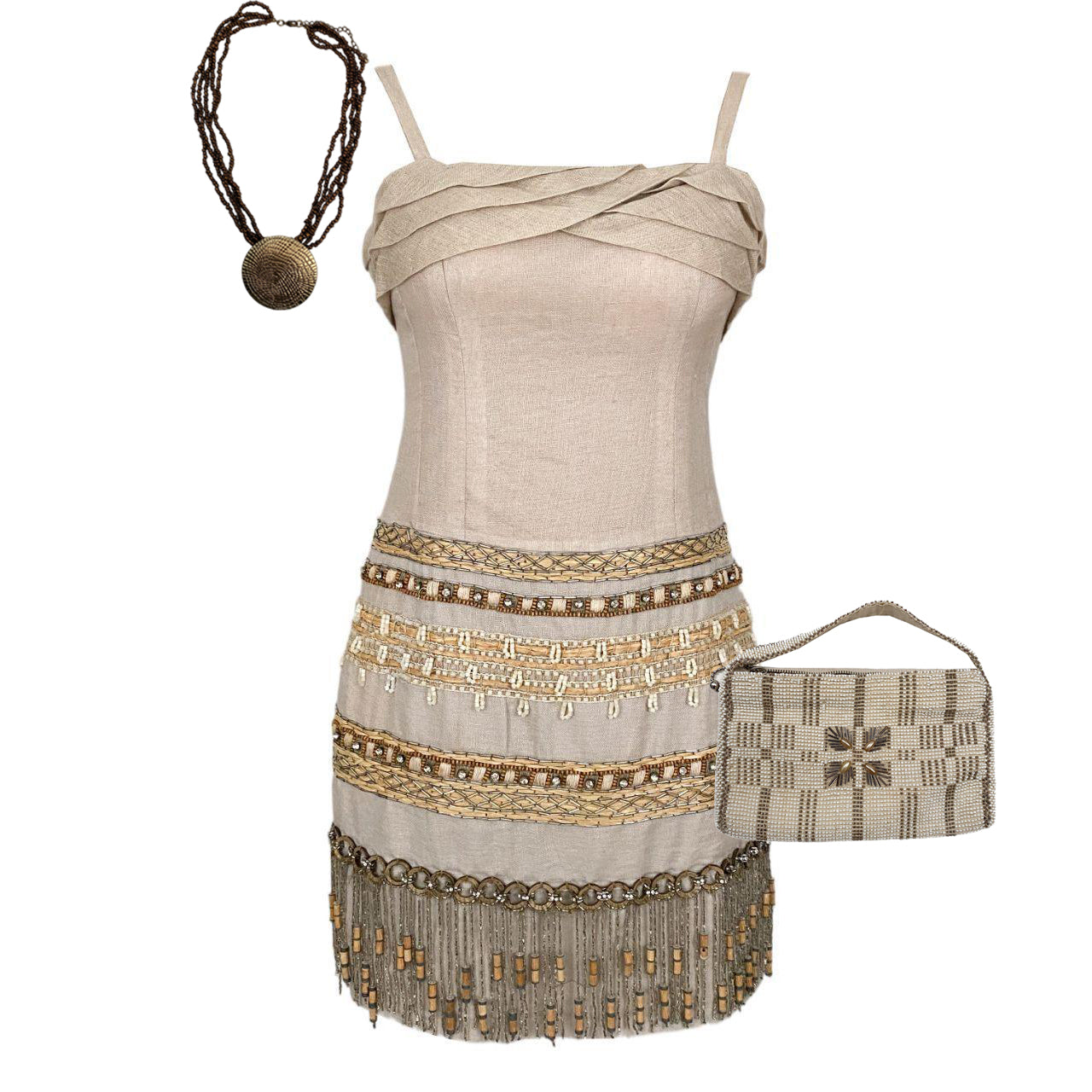 3 piece embellished beaded bundle. includes a mini dress by nanette lepore and a matching mini bag and necklace.