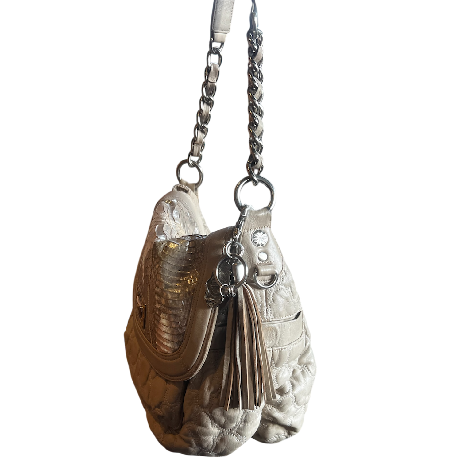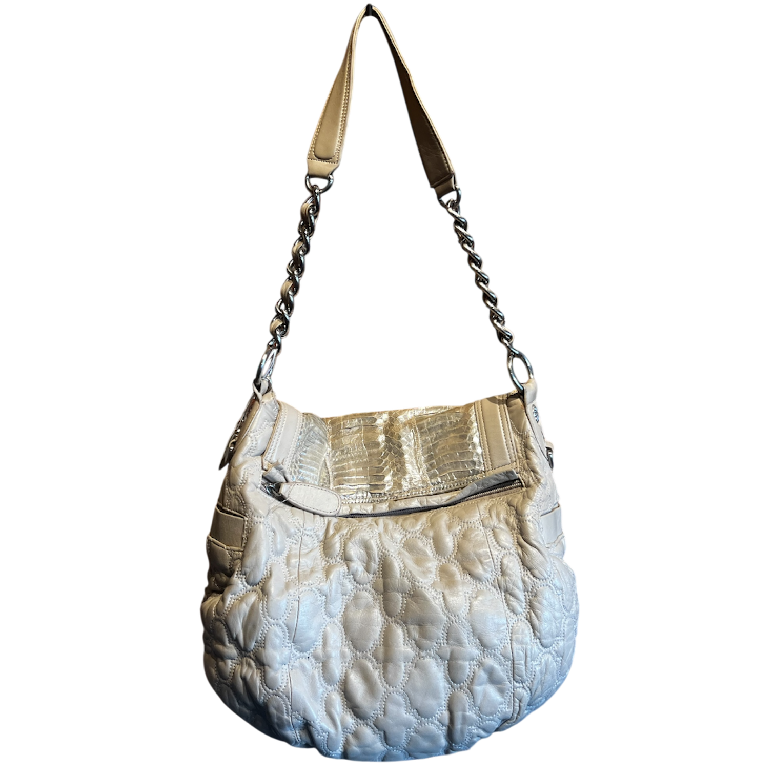 Tawny cream colors quilted leather bag with faux shimmery silver snakeskin accents.