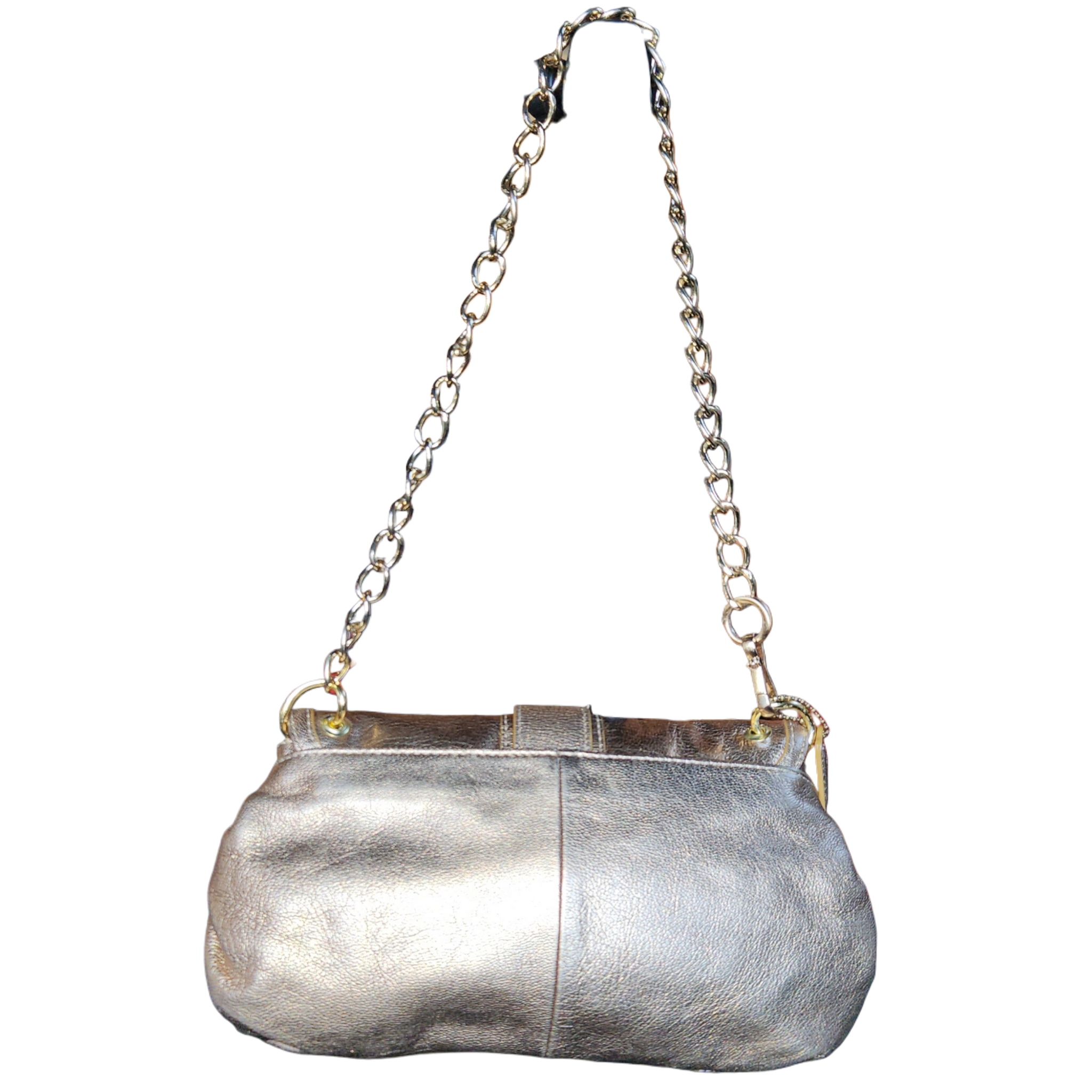 Golden mini baguette bag with gold coach charm & chain strap.